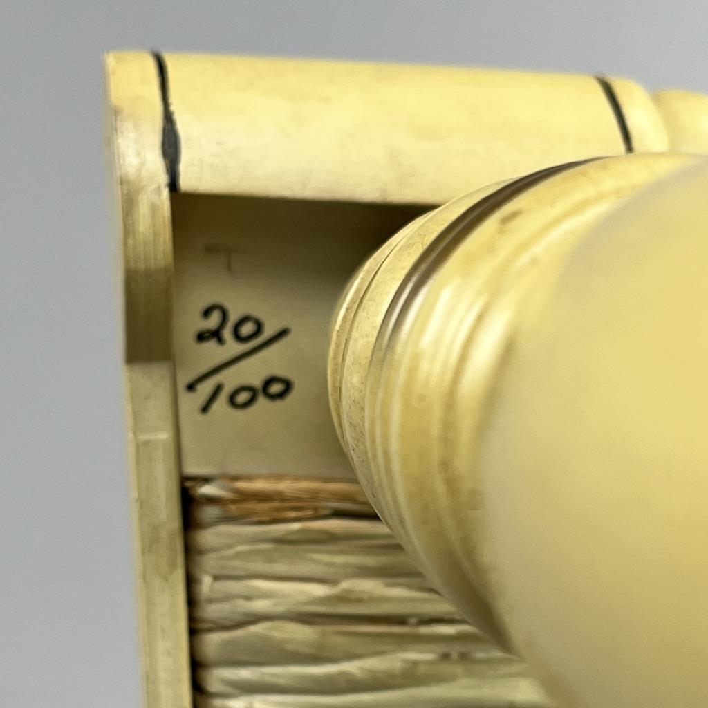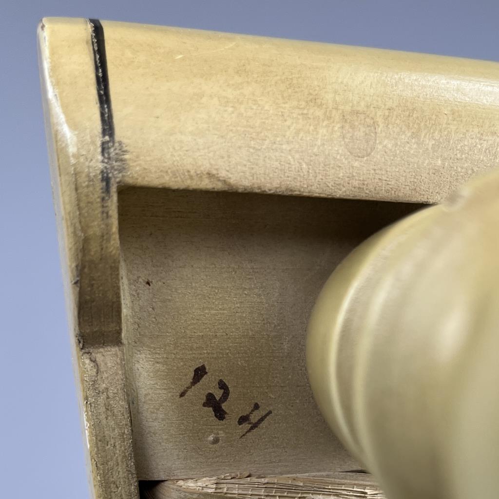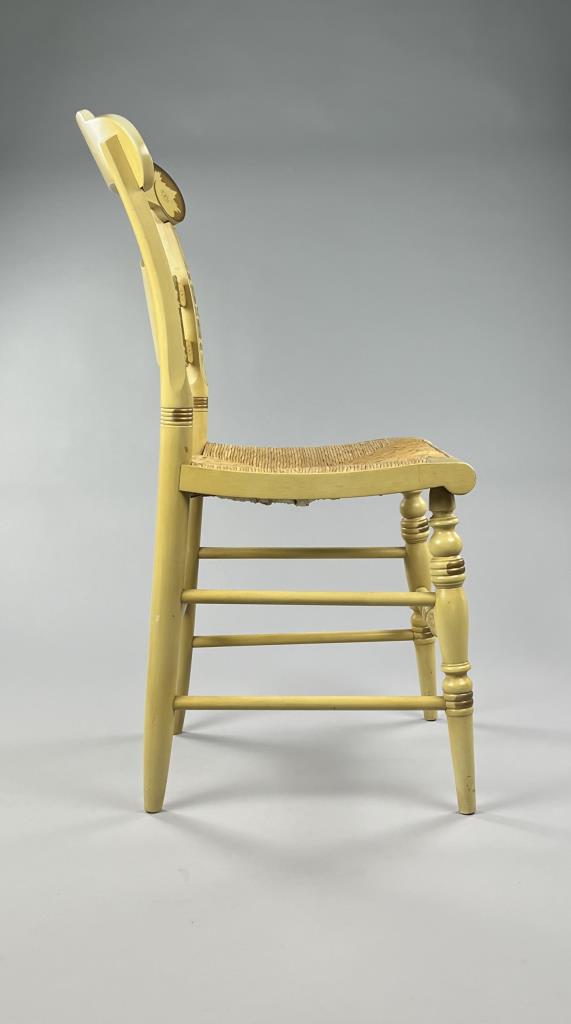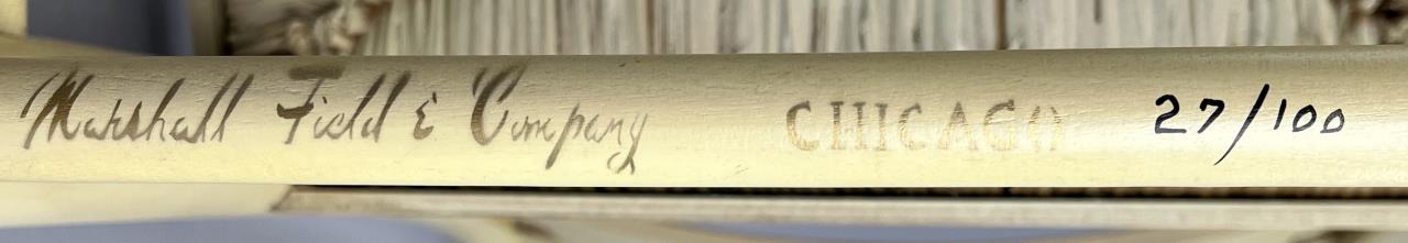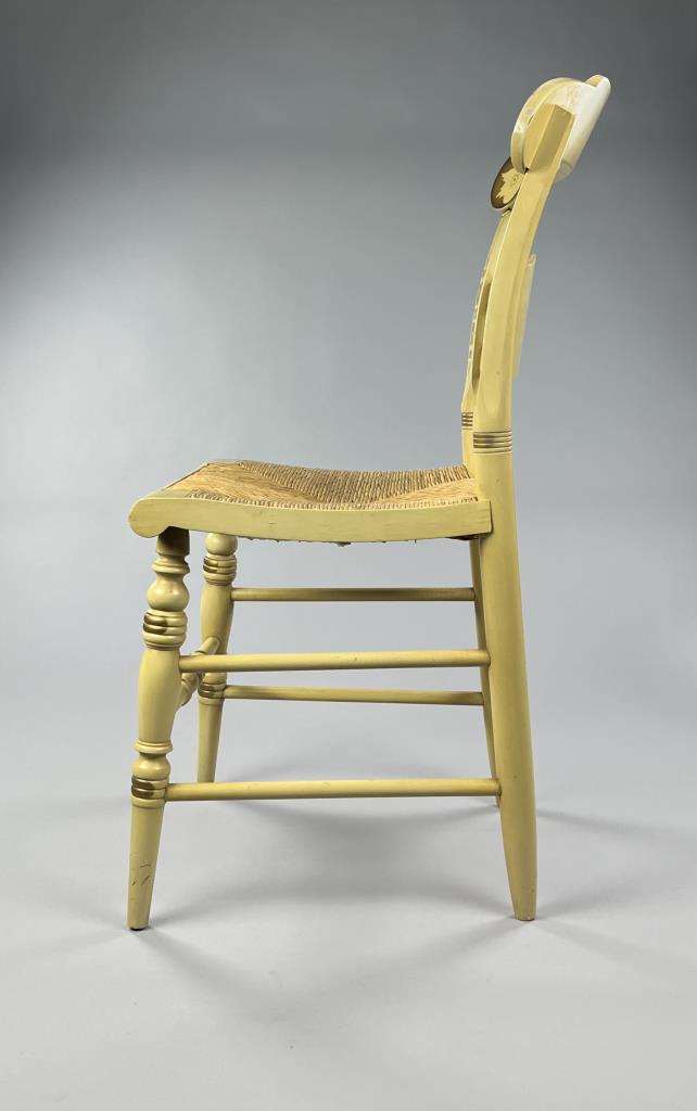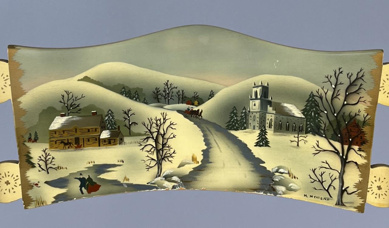 Set of four L. Hitchcock (Riverton, Connecticut) limited edition Christmas fancy side chairs, for 1972 (“124” or “12 H”), 1973 (#85/100), 1974 (#20/100), and 1975 (#27/100), hand-stencilled and hand-painted, each signed lower left “M. Morgan” for Mel Morgan, the Art Director at L. Hitchcock for many years. In addition, the 1974 and 1975 chairs are also marked on the underside of the back rung “Marshall Fields and Company Chicago”. Each chair measures approximately 18-5/8″ (L) x 18-5/8″ (W) x 35-3/8″ (H). CONDITION: Some minor scratches and scuffs commensurate with age and use, please see photos. SHIPPING: Local pick-up or third party shipping only for this lot. Please see the Shipping Policy for information on suggested shippers. We recommend the Pak Mail Store of Battle Creek to assist you. Please contact the shipper of your choice for shipping estimates on this lot. Refer to the Shipping section in our full Terms and Conditions for all information on shipping.