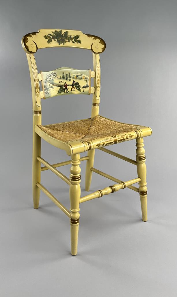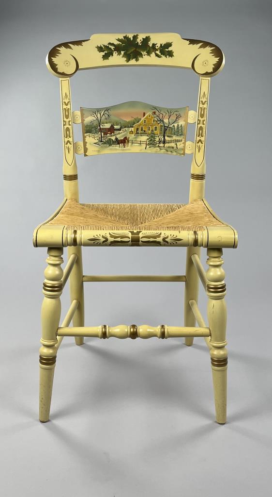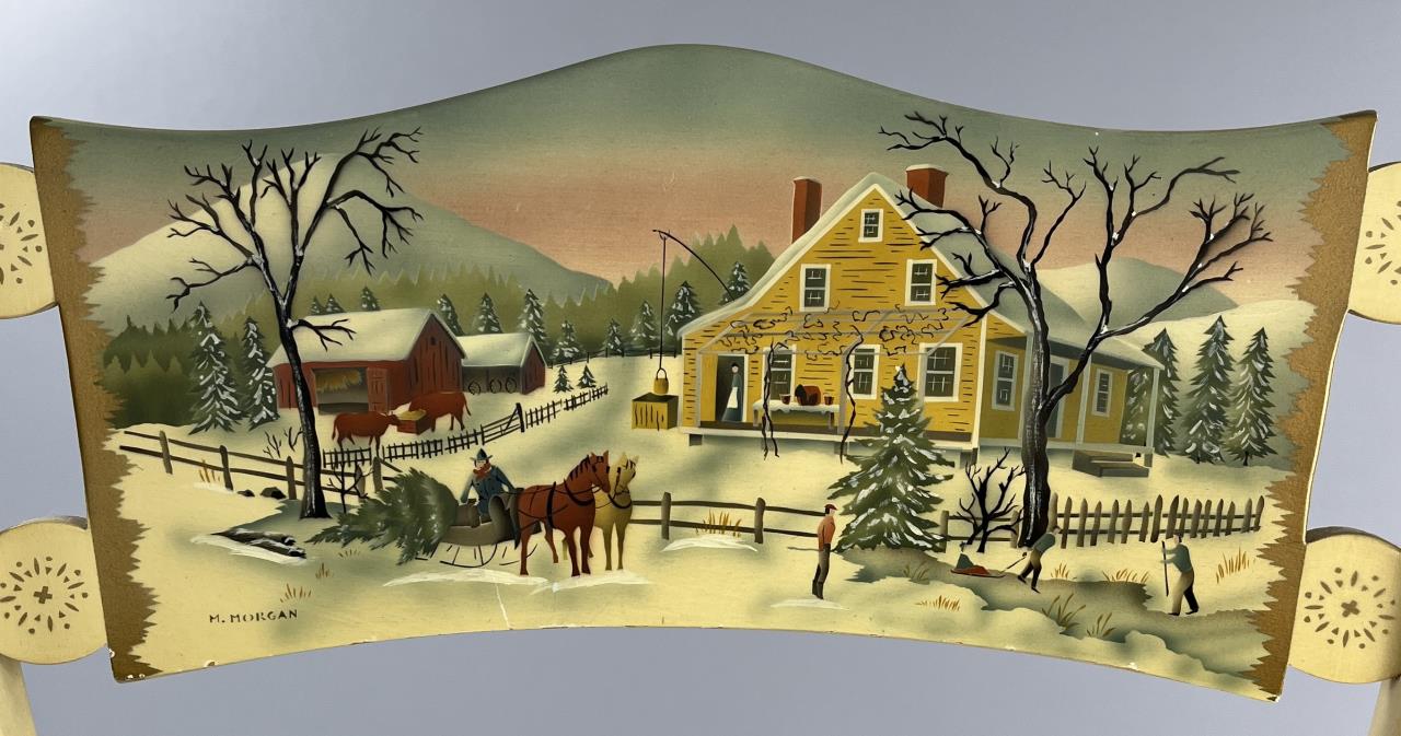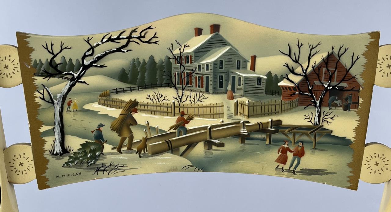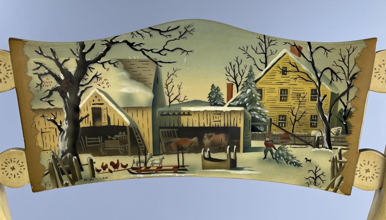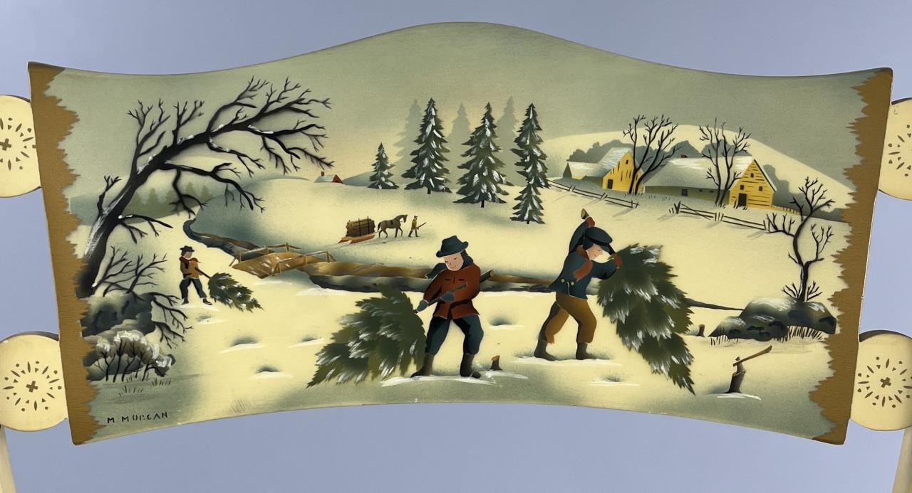 Set of four L. Hitchcock (Riverton, Connecticut) limited edition Christmas fancy side chairs, for 1976 (#40/100), 1977 (#4/100), 1978 (#6/50), and 1979 (C139), hand-stencilled and hand-painted, each signed lower left “M. Morgan” for Mel Morgan, the Art Director at L. Hitchcock for many years. Each chair measures approximately 18-5/8″ (L) x 18-5/8″ (W) x 35-3/8″ (H). CONDITION: Some minor scratches and scuffs commensurate with age and use, please see photos. SHIPPING: Local pick-up or third party shipping only for this lot. Please see the Shipping Policy for information on suggested shippers. We recommend the Pak Mail Store of Battle Creek to assist you. Please contact the shipper of your choice for shipping estimates on this lot. Refer to the Shipping section in our full Terms and Conditions for all information on shipping.