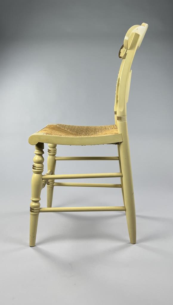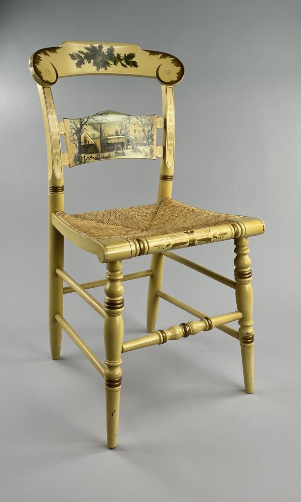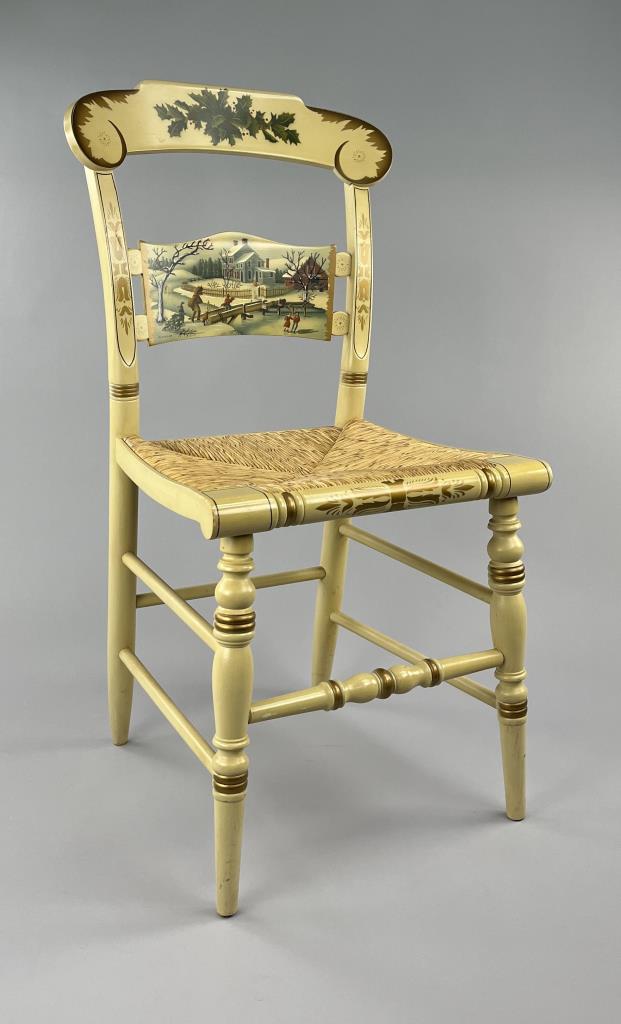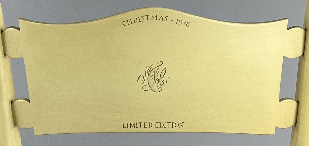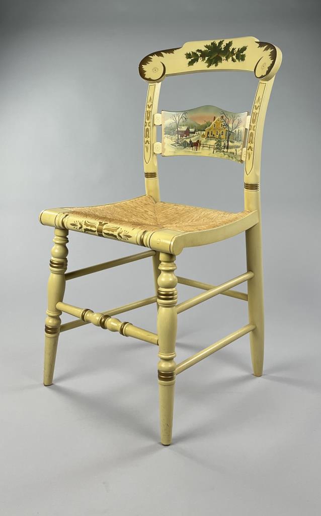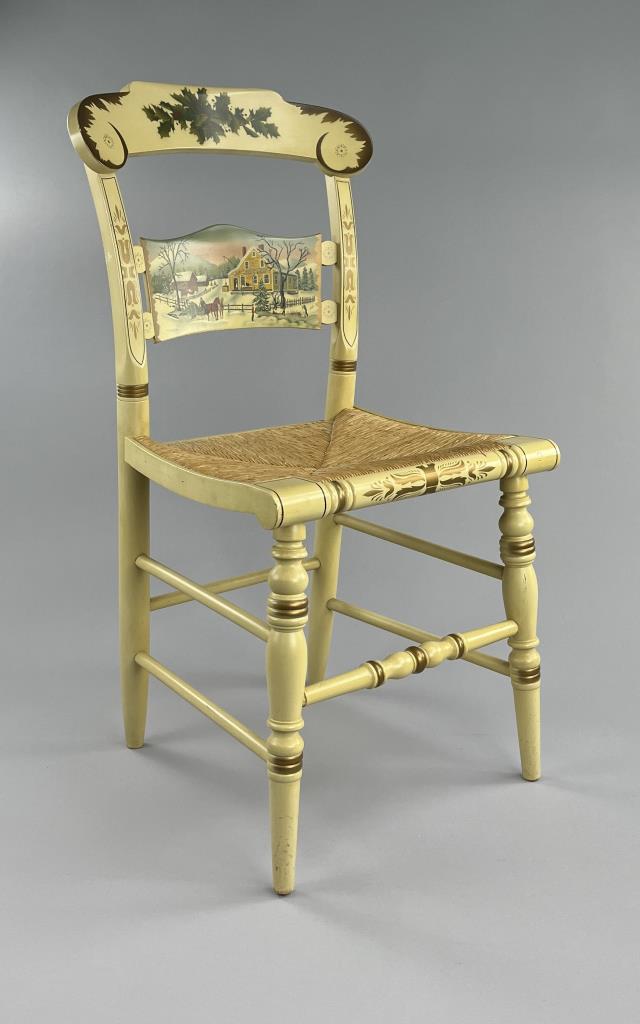 Set of four L. Hitchcock (Riverton, Connecticut) limited edition Christmas fancy side chairs, for 1976 (#40/100), 1977 (#4/100), 1978 (#6/50), and 1979 (C139), hand-stencilled and hand-painted, each signed lower left “M. Morgan” for Mel Morgan, the Art Director at L. Hitchcock for many years. Each chair measures approximately 18-5/8″ (L) x 18-5/8″ (W) x 35-3/8″ (H). CONDITION: Some minor scratches and scuffs commensurate with age and use, please see photos. SHIPPING: Local pick-up or third party shipping only for this lot. Please see the Shipping Policy for information on suggested shippers. We recommend the Pak Mail Store of Battle Creek to assist you. Please contact the shipper of your choice for shipping estimates on this lot. Refer to the Shipping section in our full Terms and Conditions for all information on shipping.