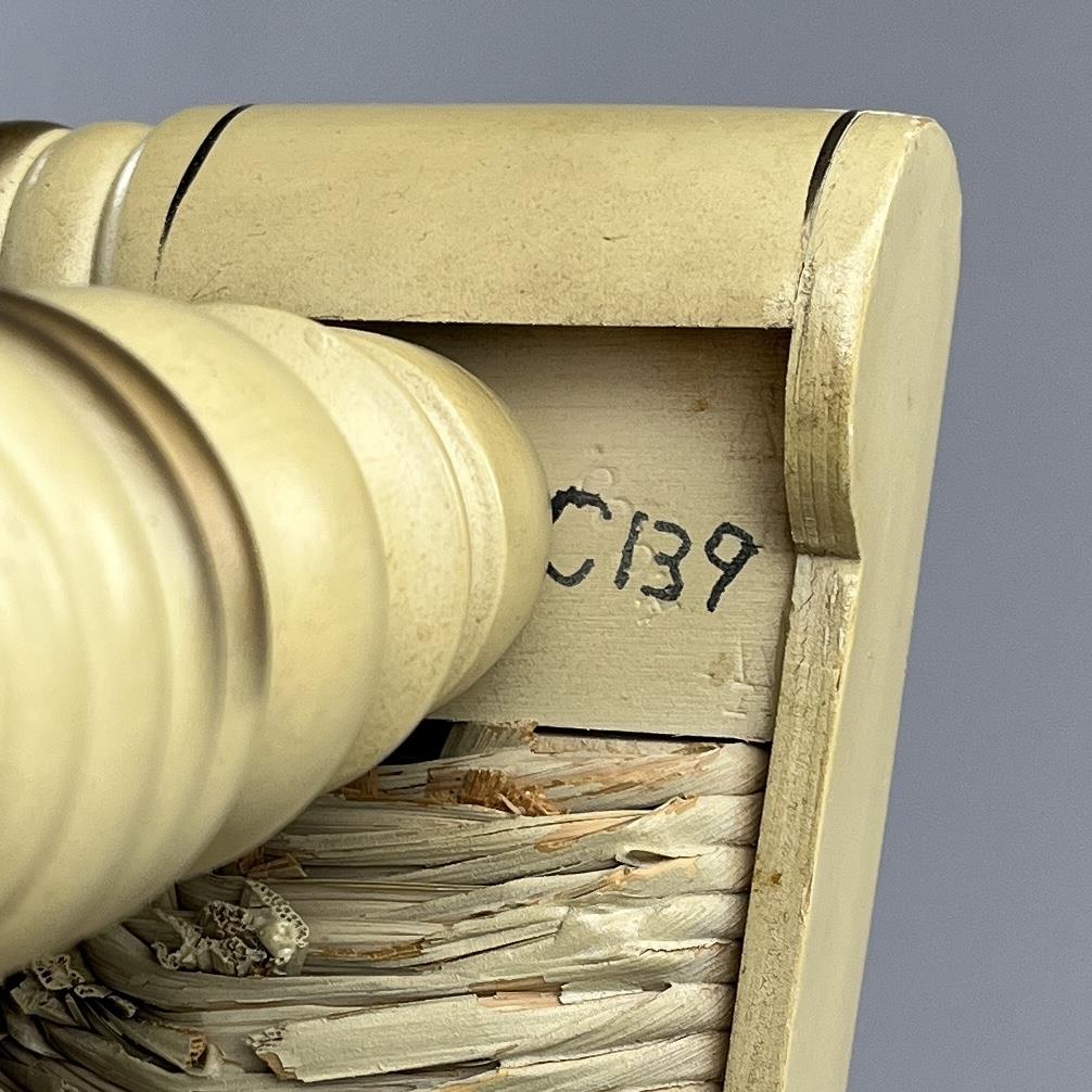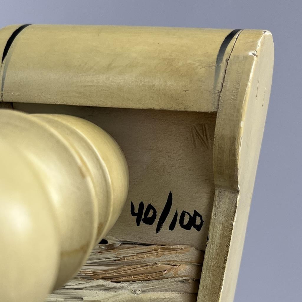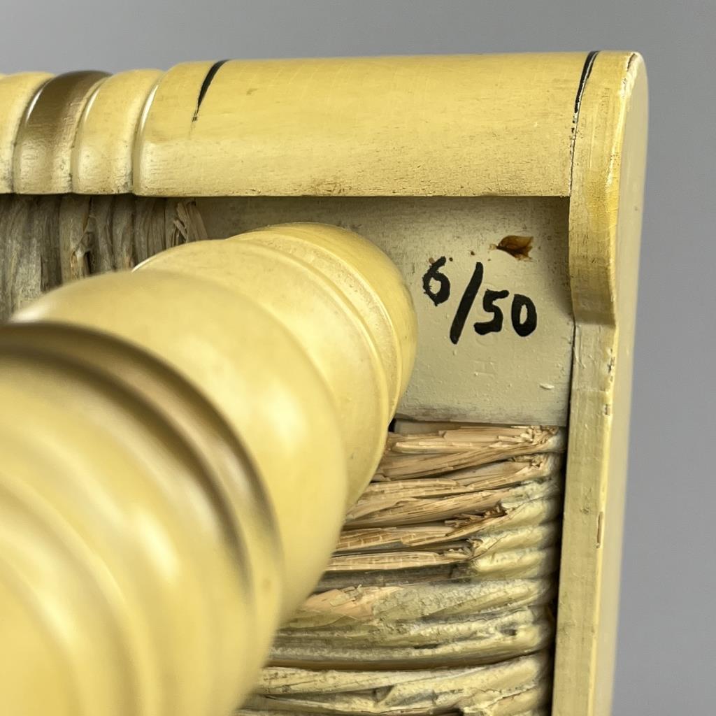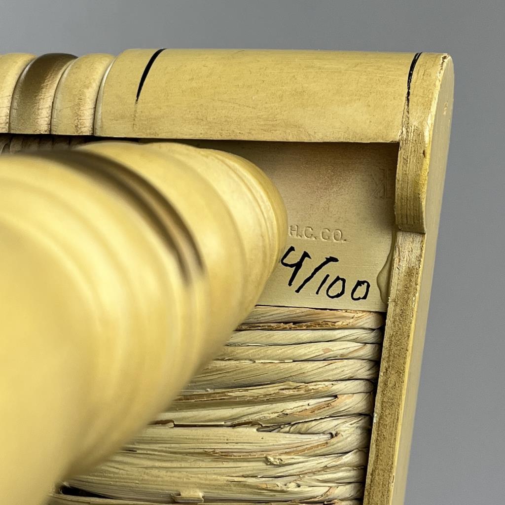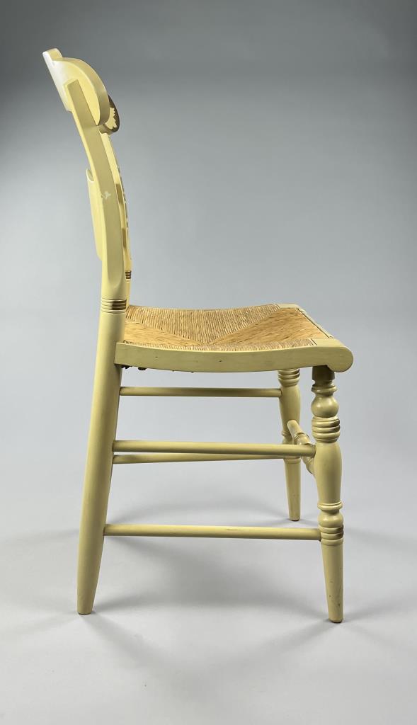 Set of four L. Hitchcock (Riverton, Connecticut) limited edition Christmas fancy side chairs, for 1976 (#40/100), 1977 (#4/100), 1978 (#6/50), and 1979 (C139), hand-stencilled and hand-painted, each signed lower left “M. Morgan” for Mel Morgan, the Art Director at L. Hitchcock for many years. Each chair measures approximately 18-5/8″ (L) x 18-5/8″ (W) x 35-3/8″ (H). CONDITION: Some minor scratches and scuffs commensurate with age and use, please see photos. SHIPPING: Local pick-up or third party shipping only for this lot. Please see the Shipping Policy for information on suggested shippers. We recommend the Pak Mail Store of Battle Creek to assist you. Please contact the shipper of your choice for shipping estimates on this lot. Refer to the Shipping section in our full Terms and Conditions for all information on shipping.