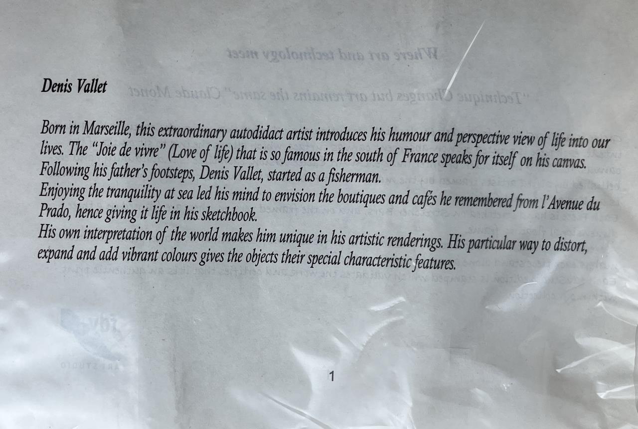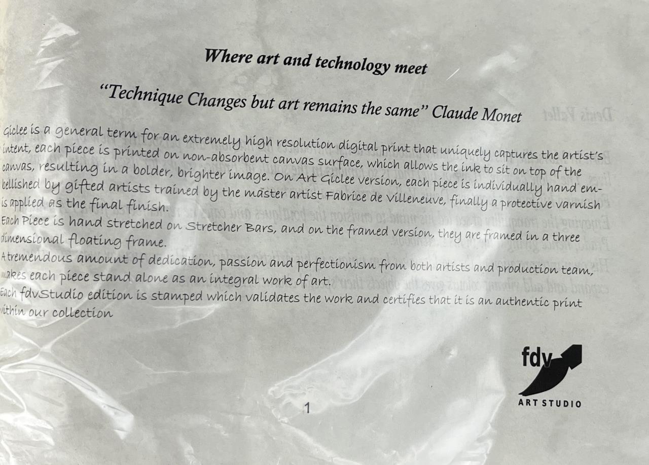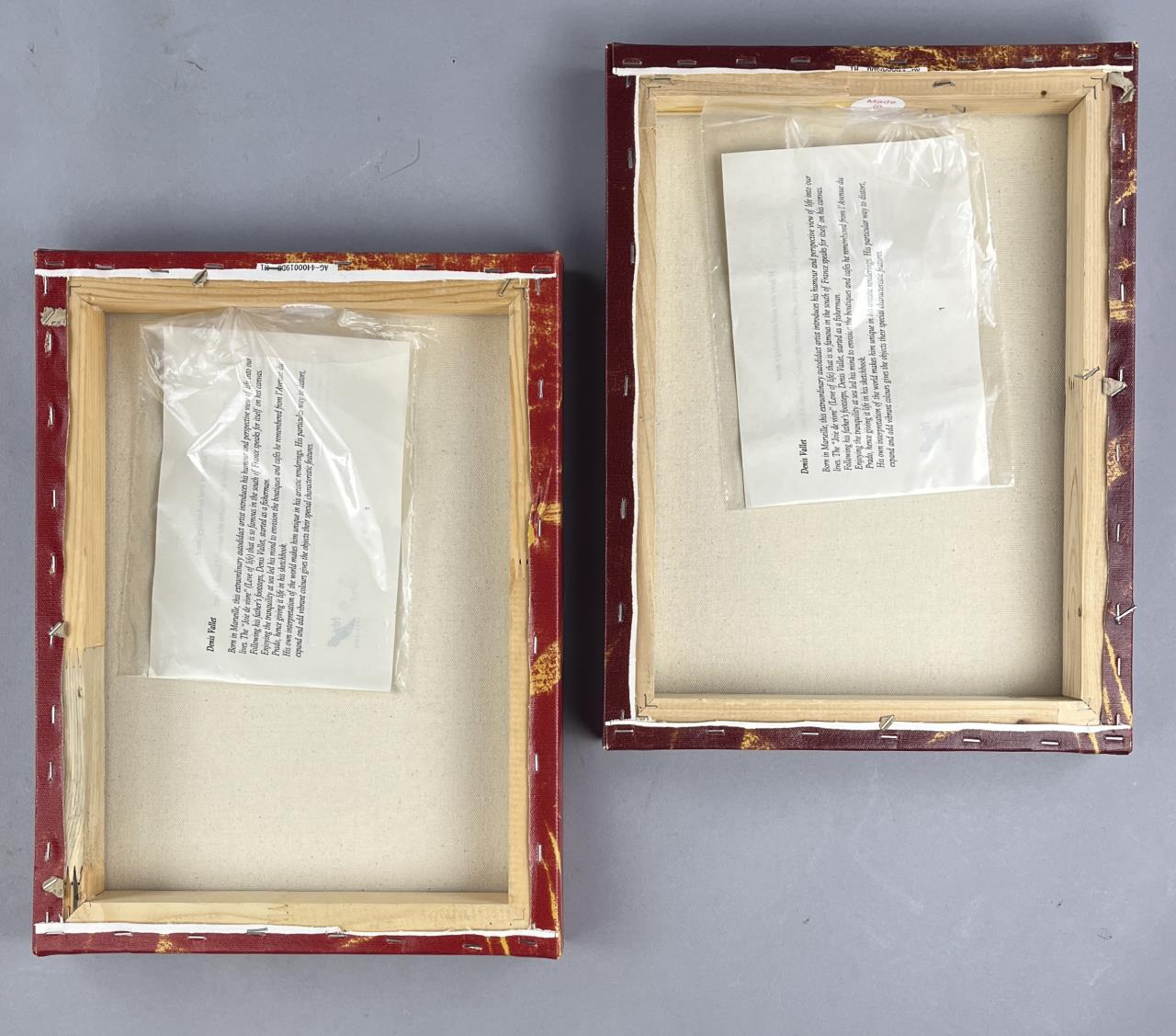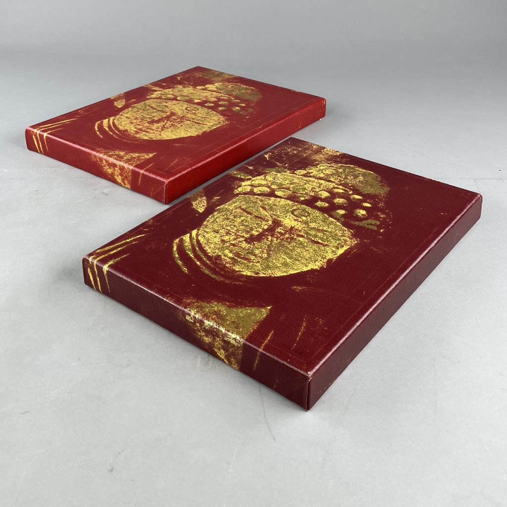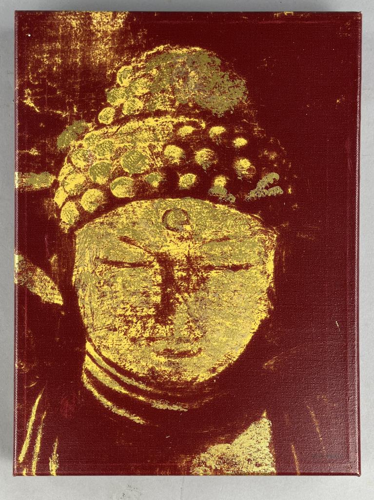 Two Denis Vallet (French, active late 20th / early 21st Century), giclee prints on stretched canvas, of the Buddha, information on the artist and the printing process on the reverse, each measuring 25-3/4″ x 11-3/4″. CONDITION: Slight tonal difference between the two prints, please see photos. SHIPPING: In-House Shipping is available on this item. PLEASE read our Shipping Policies and our full Terms and Conditions prior to bidding.