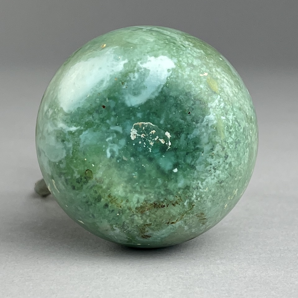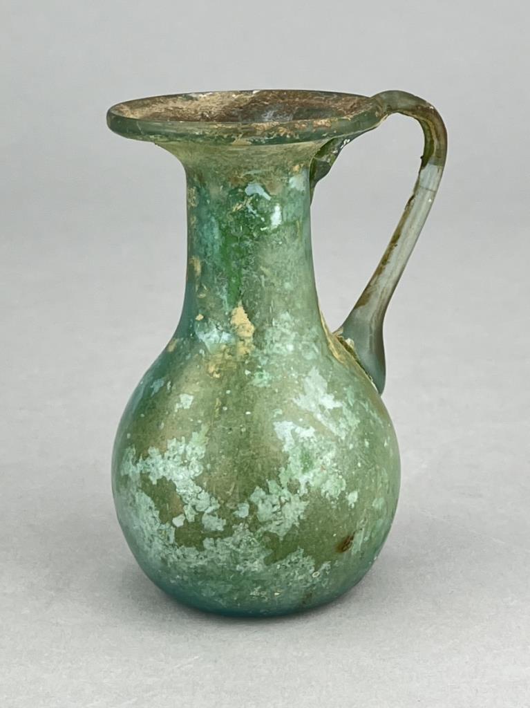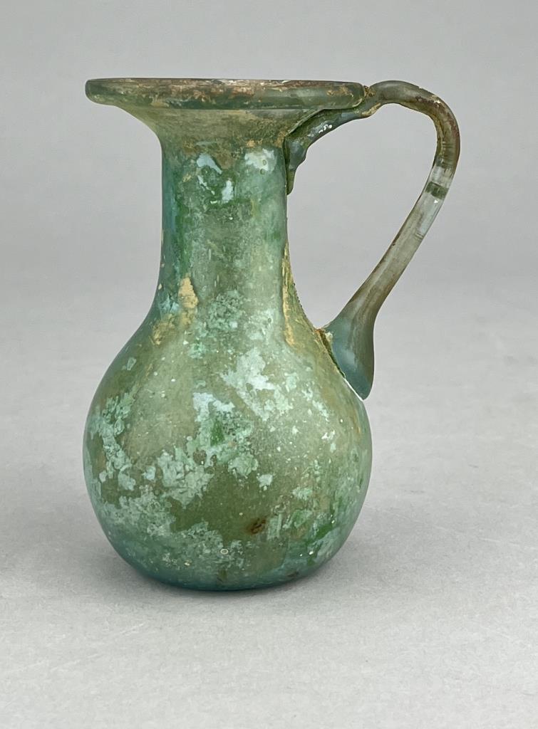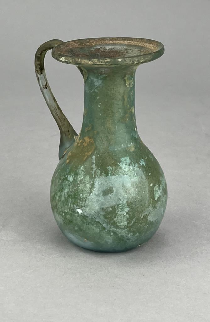 Ancient Roman pitcher, ewer, or juglet, piriform body, with a short neck, a wide flared rim and a single applied handle extending from the body to the rim, green glass with iridescence, most likely circa 1st-4th Century C.E., 4″ (H). Provenance: ex-private East Lansing, Michigan, USA collection of antiquities and ancient relics, not authenticated. CONDITION: Please Refer to Photos and Description for Condition. SHIPPING: In-House Shipping is available on this item. PLEASE read our Shipping Policies and our full Terms and Conditions prior to bidding.