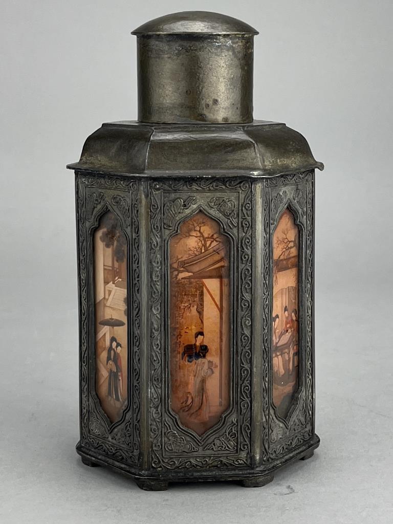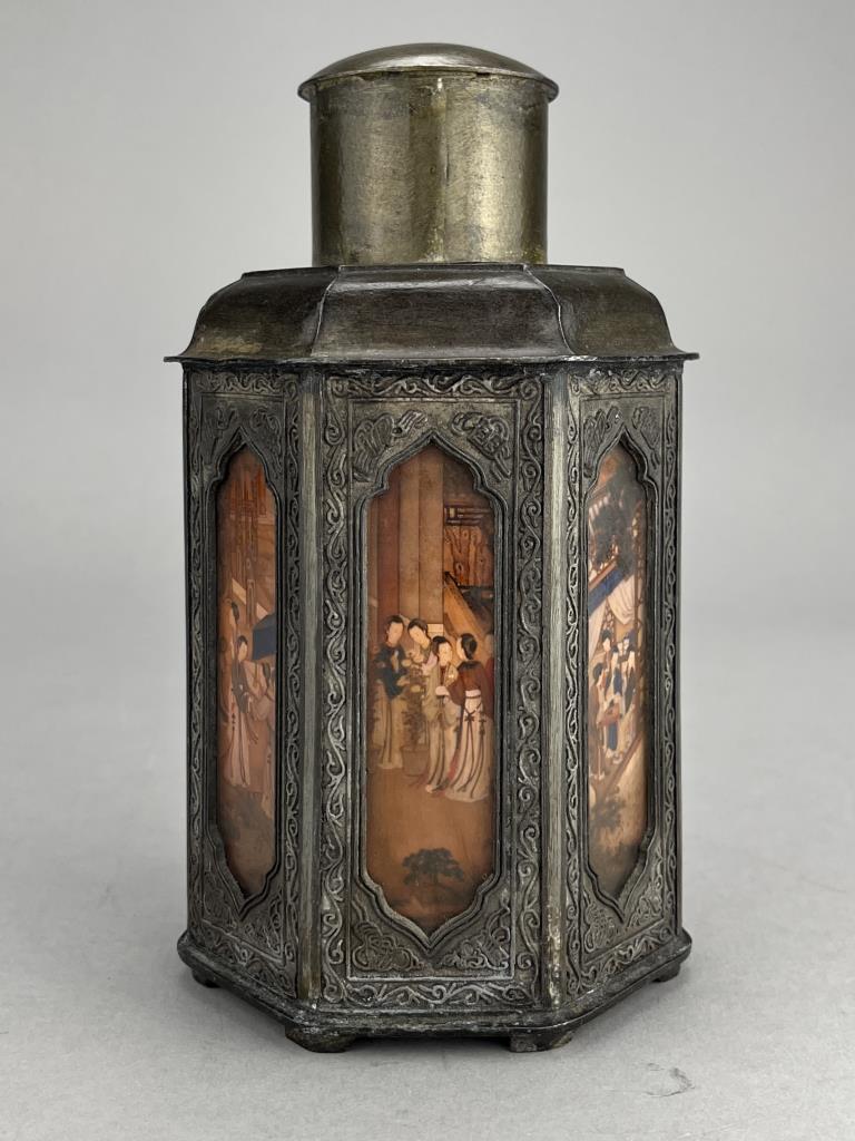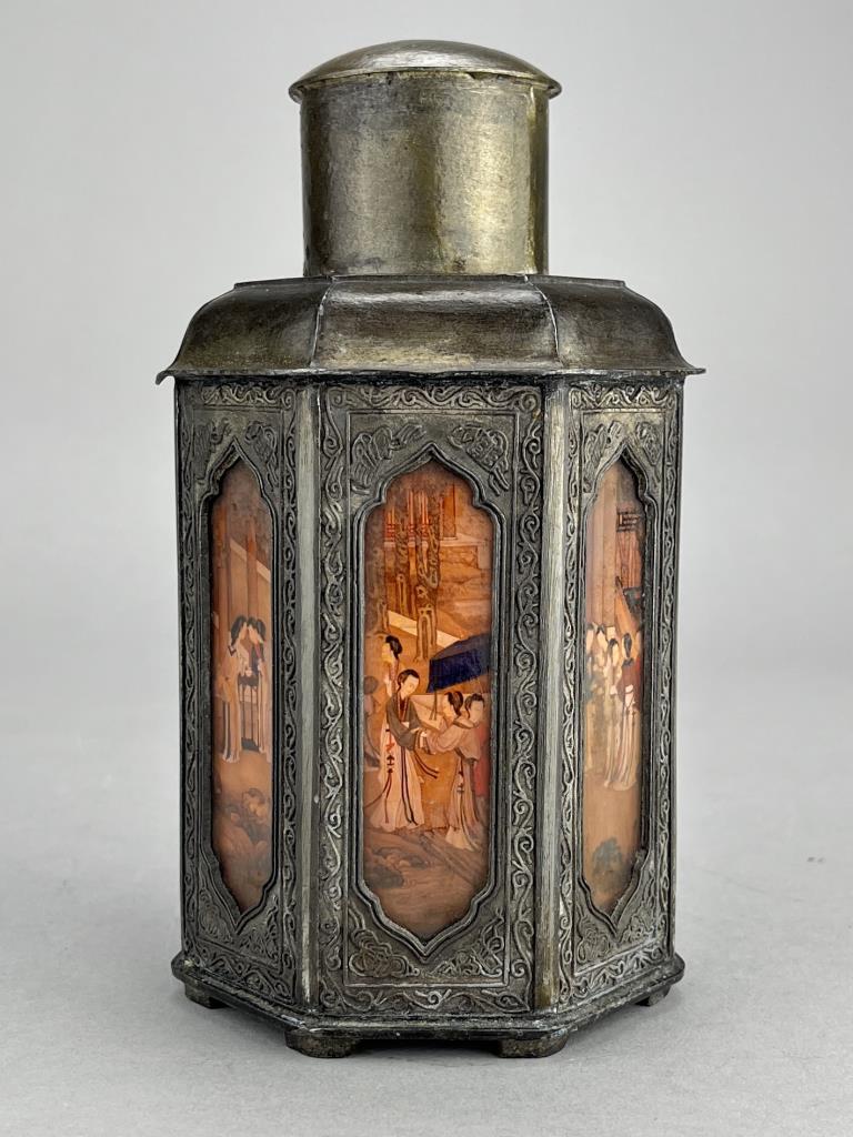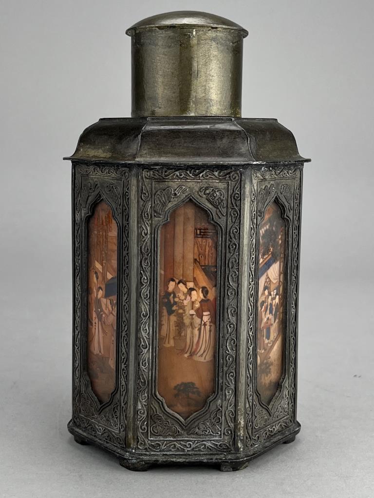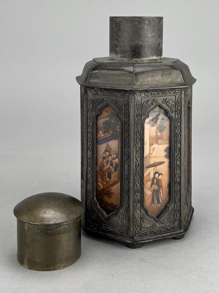 Chinese Yan Yong Li pewter Dian Tong heptagonal tea canister, or caddy, with inset paintings behind glass panels, marked on bottom, early Republican Period, approximately 7″ (H). CONDITION: Minor denting to a couple of corners, please see photos. SHIPPING: In-House Shipping is available on this item. PLEASE read our Shipping Policies and our full Terms and Conditions prior to bidding.