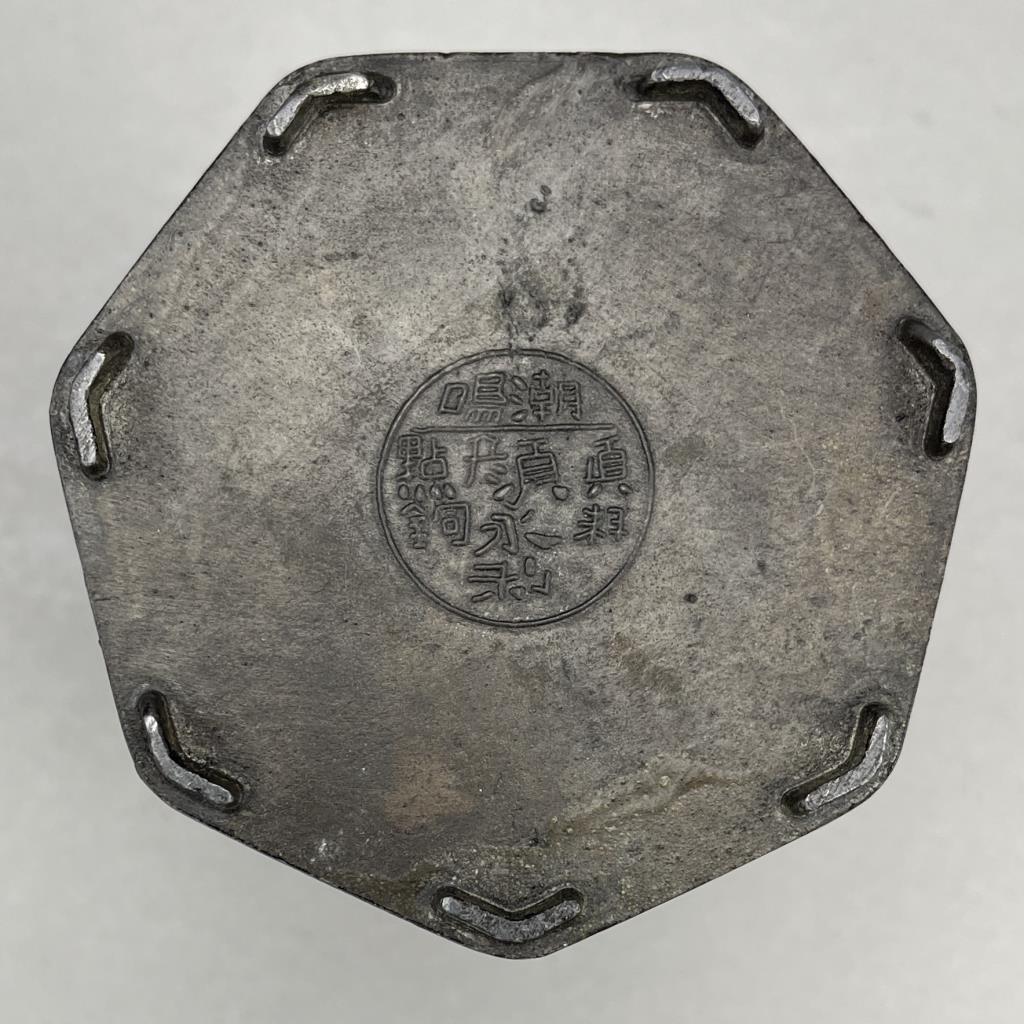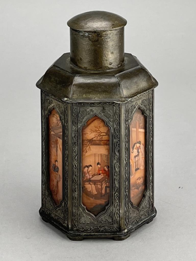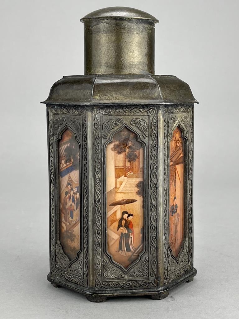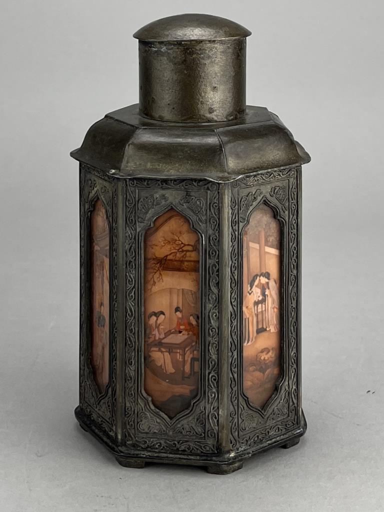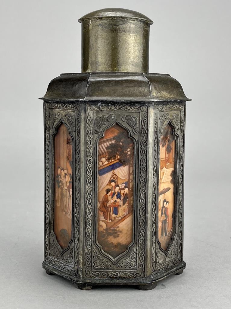 Chinese Yan Yong Li pewter Dian Tong heptagonal tea canister, or caddy, with inset paintings behind glass panels, marked on bottom, early Republican Period, approximately 7″ (H). CONDITION: Minor denting to a couple of corners, please see photos. SHIPPING: In-House Shipping is available on this item. PLEASE read our Shipping Policies and our full Terms and Conditions prior to bidding.