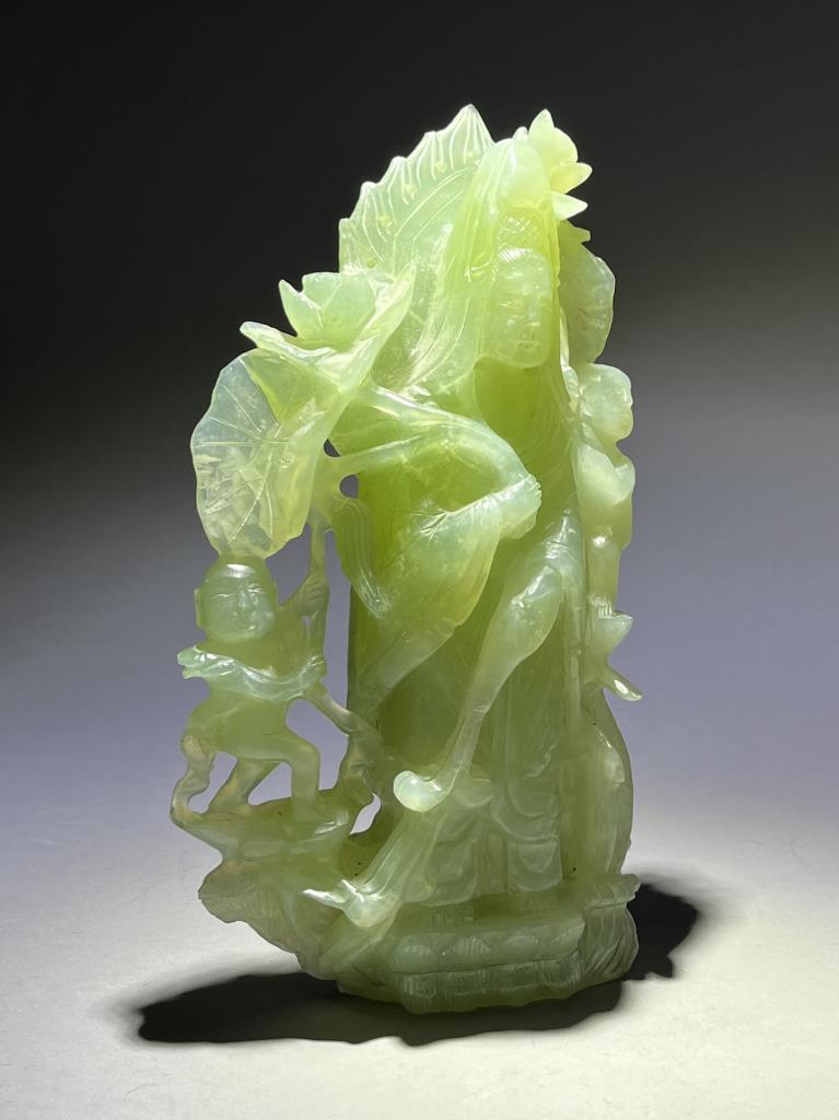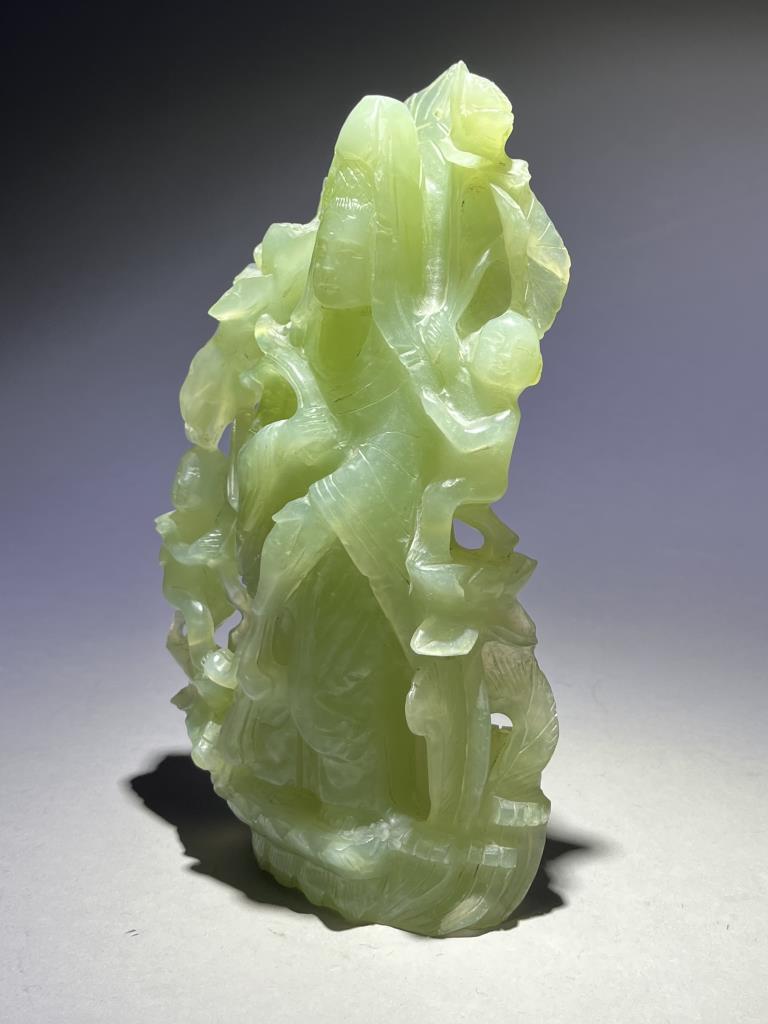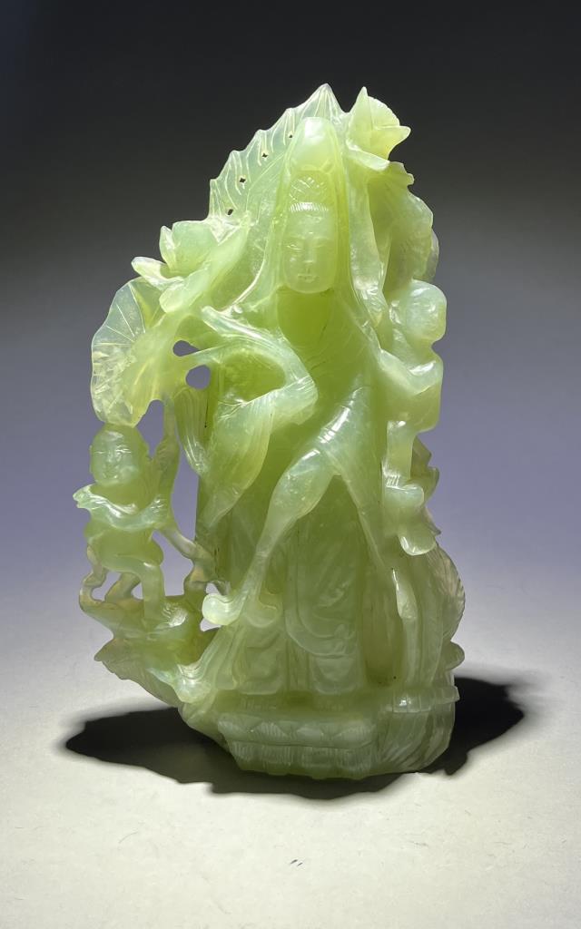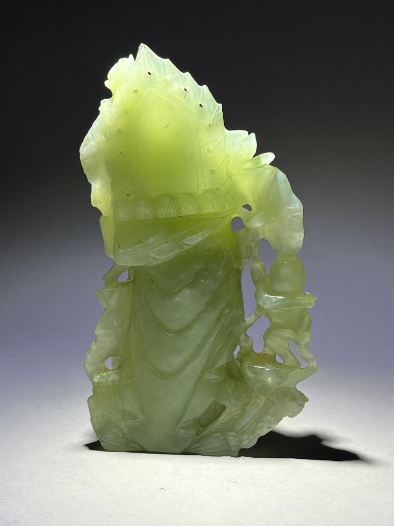 Chinese carved jade statue, most likely of the Buddhist Bodhisattva, Guanyin, the Goddess of Compassion and Mercy, with Shancai and Longnu, 20th Century, 9-1/2″ (H). CONDITION: Please Refer to Photos and Description for Condition. SHIPPING: In-House Shipping is available on this item. PLEASE read our Shipping Policies and our full Terms and Conditions prior to bidding.