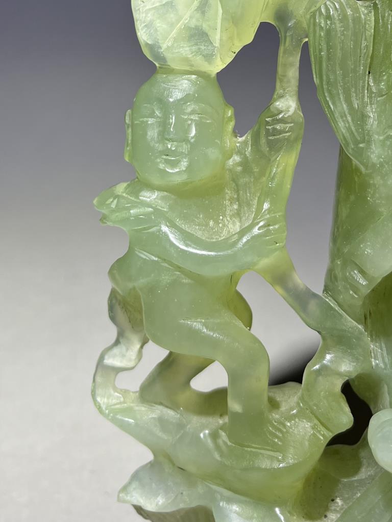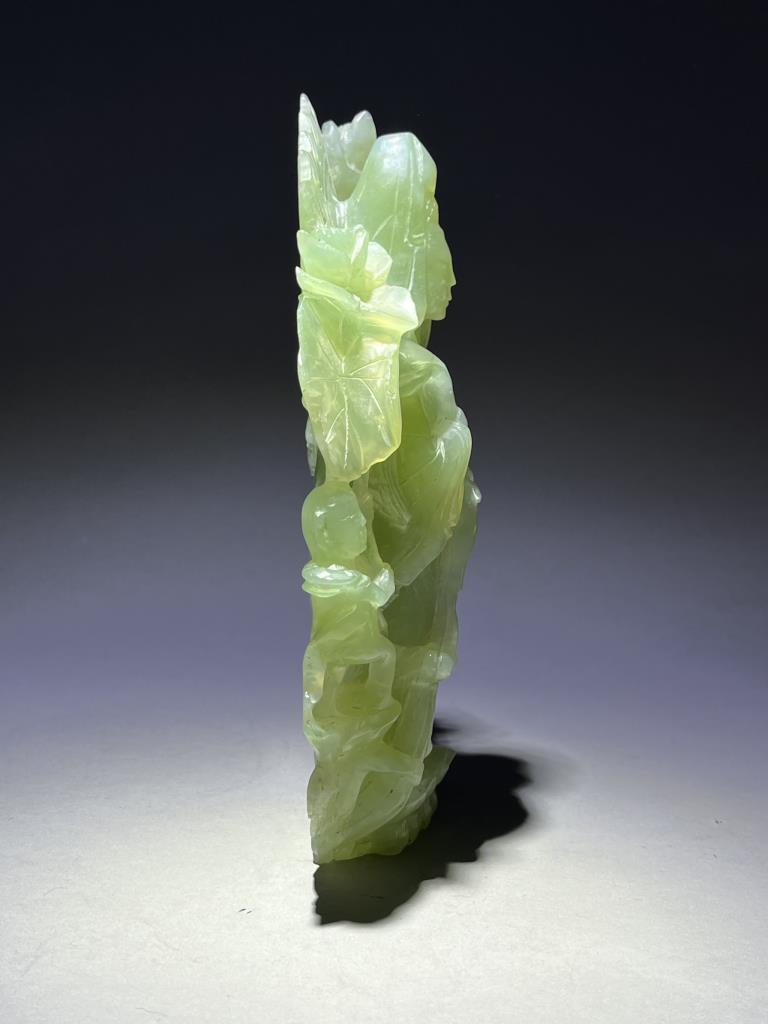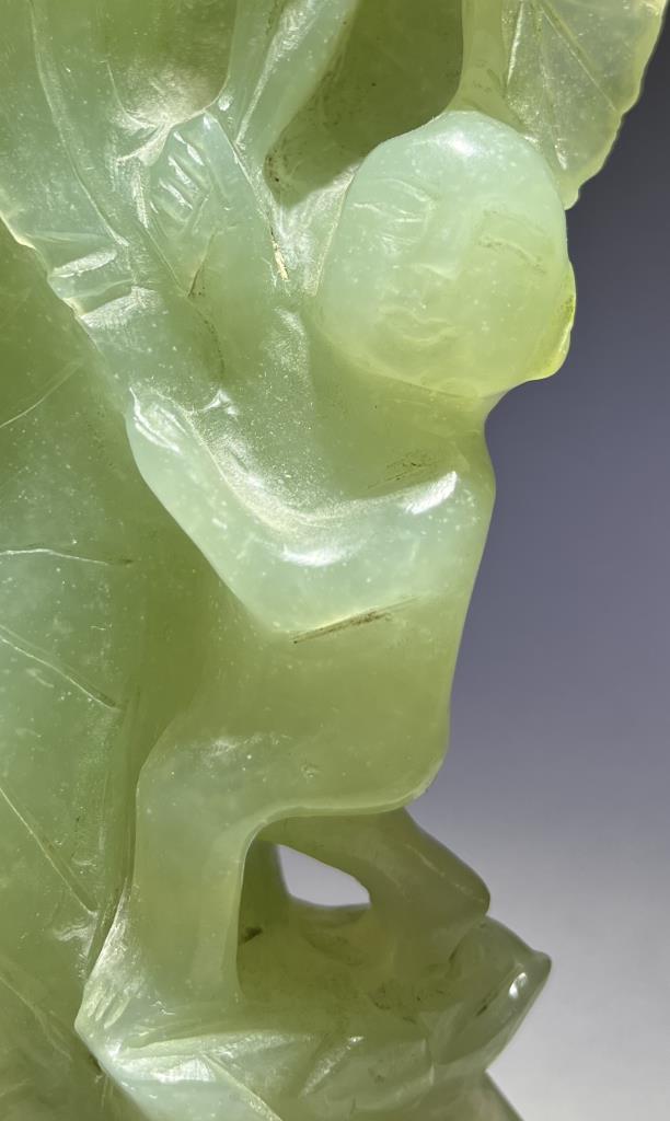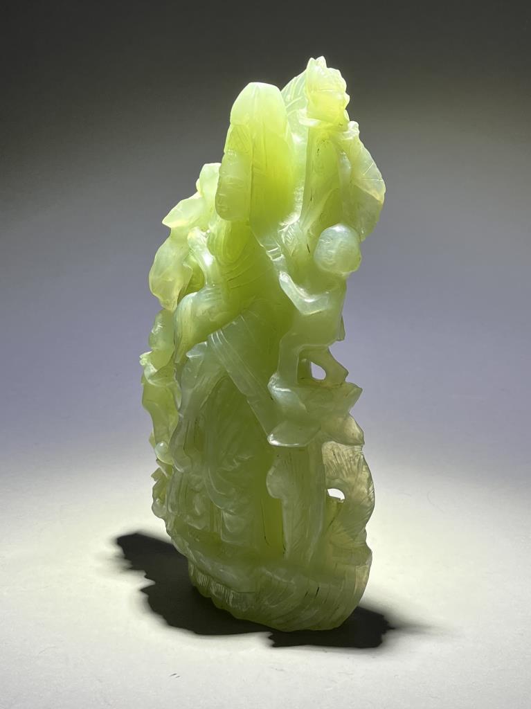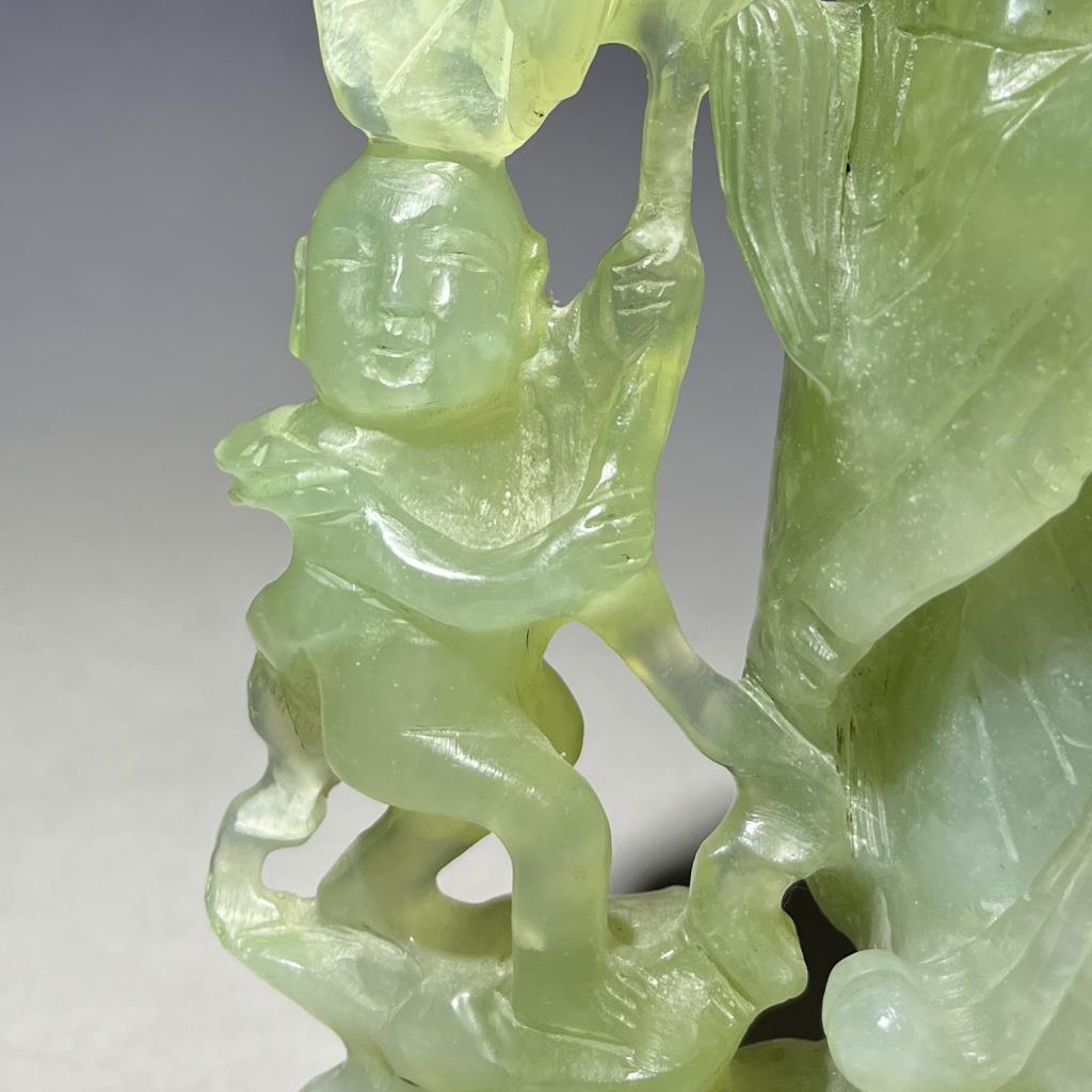 Chinese carved jade statue, most likely of the Buddhist Bodhisattva, Guanyin, the Goddess of Compassion and Mercy, with Shancai and Longnu, 20th Century, 9-1/2″ (H). CONDITION: Please Refer to Photos and Description for Condition. SHIPPING: In-House Shipping is available on this item. PLEASE read our Shipping Policies and our full Terms and Conditions prior to bidding.