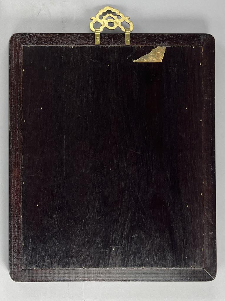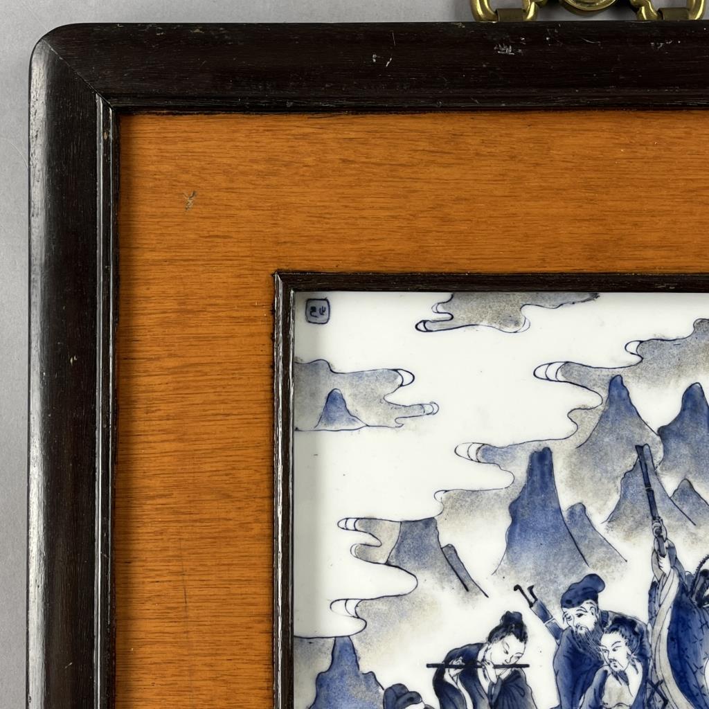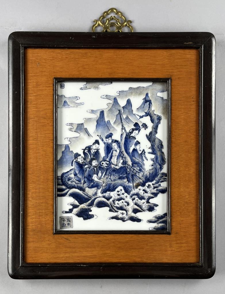 Framed Chinese hand painted blue and white porcelain panel, possibly depicting the eight Immortals in Chinese Taoism and folk culture, 20th Century, in a wood frame measuring approximately 19-1/8″ x 15-7/8″ with a decorative brass hanger at top. CONDITION: Not examined out of frame. SHIPPING: In-House Shipping is available on this item. PLEASE read our Shipping Policies and our full Terms and Conditions prior to bidding.