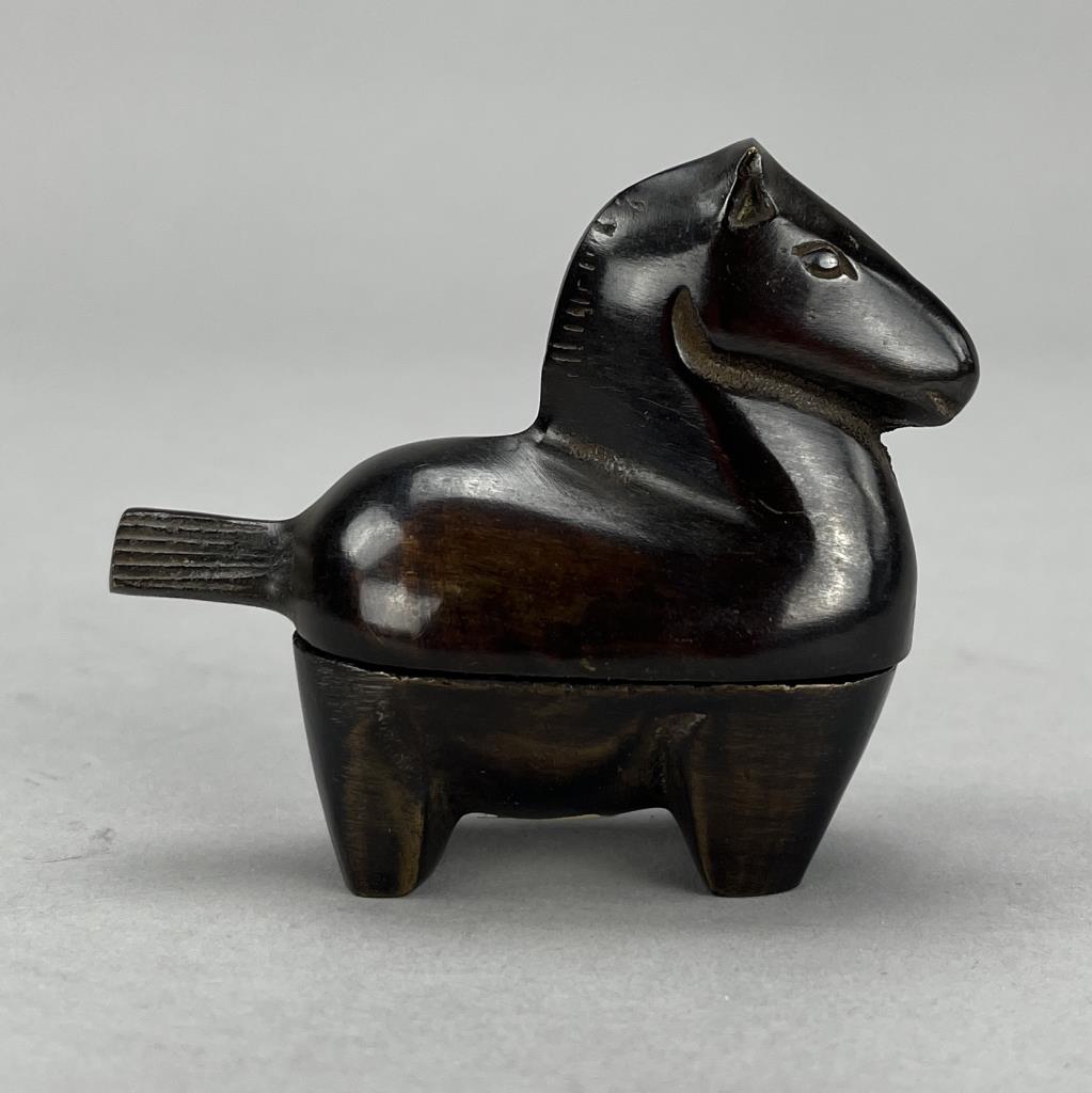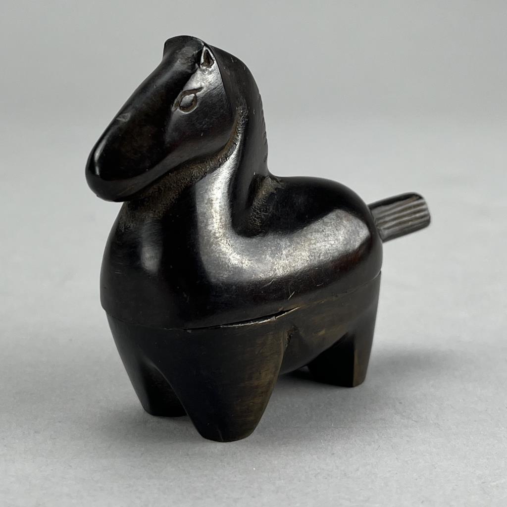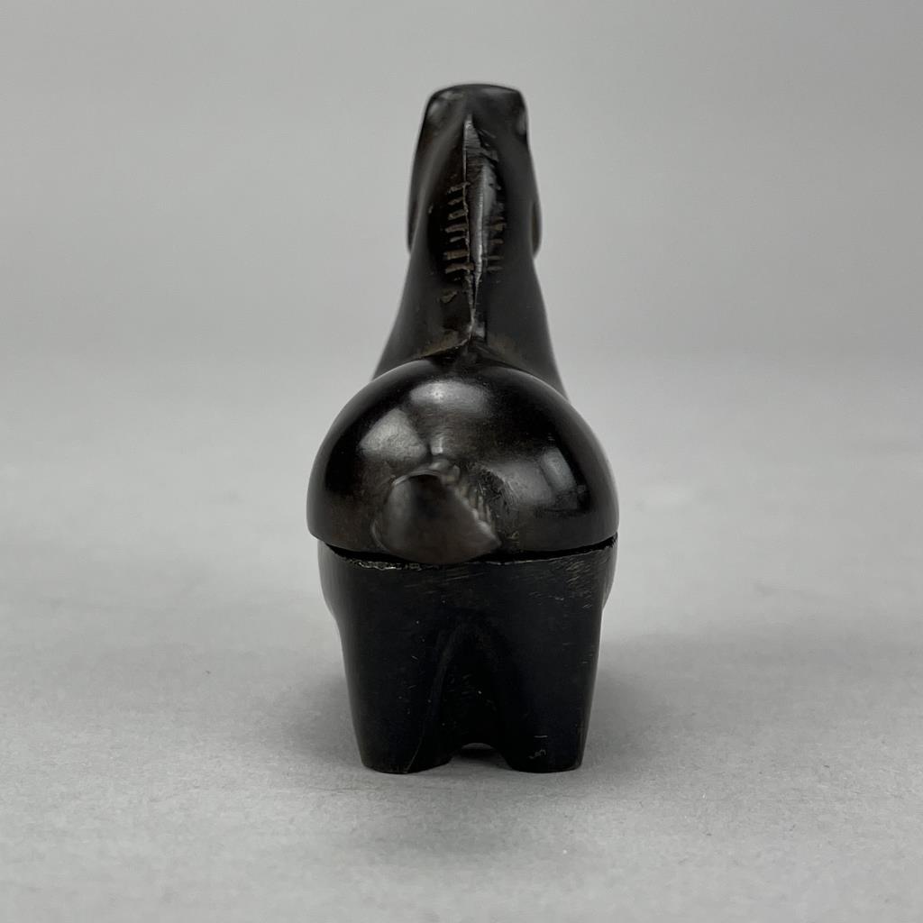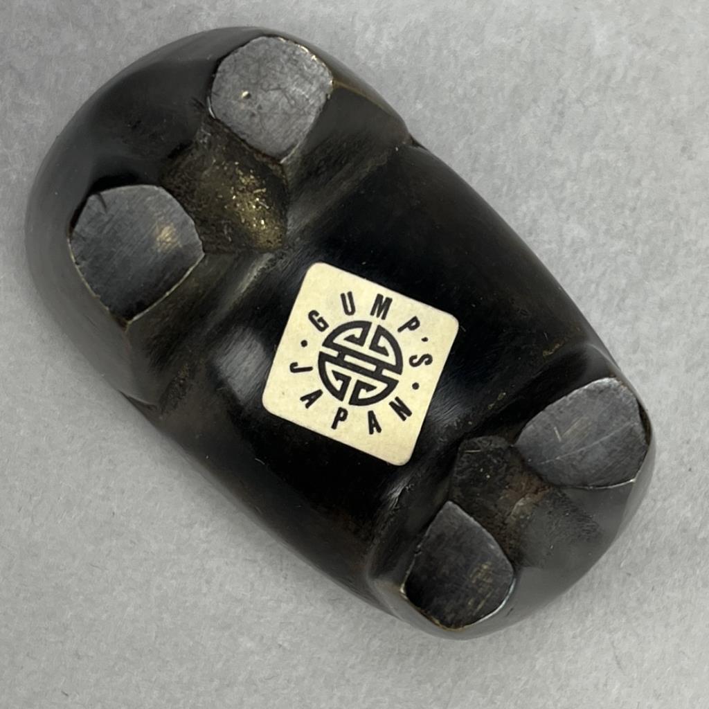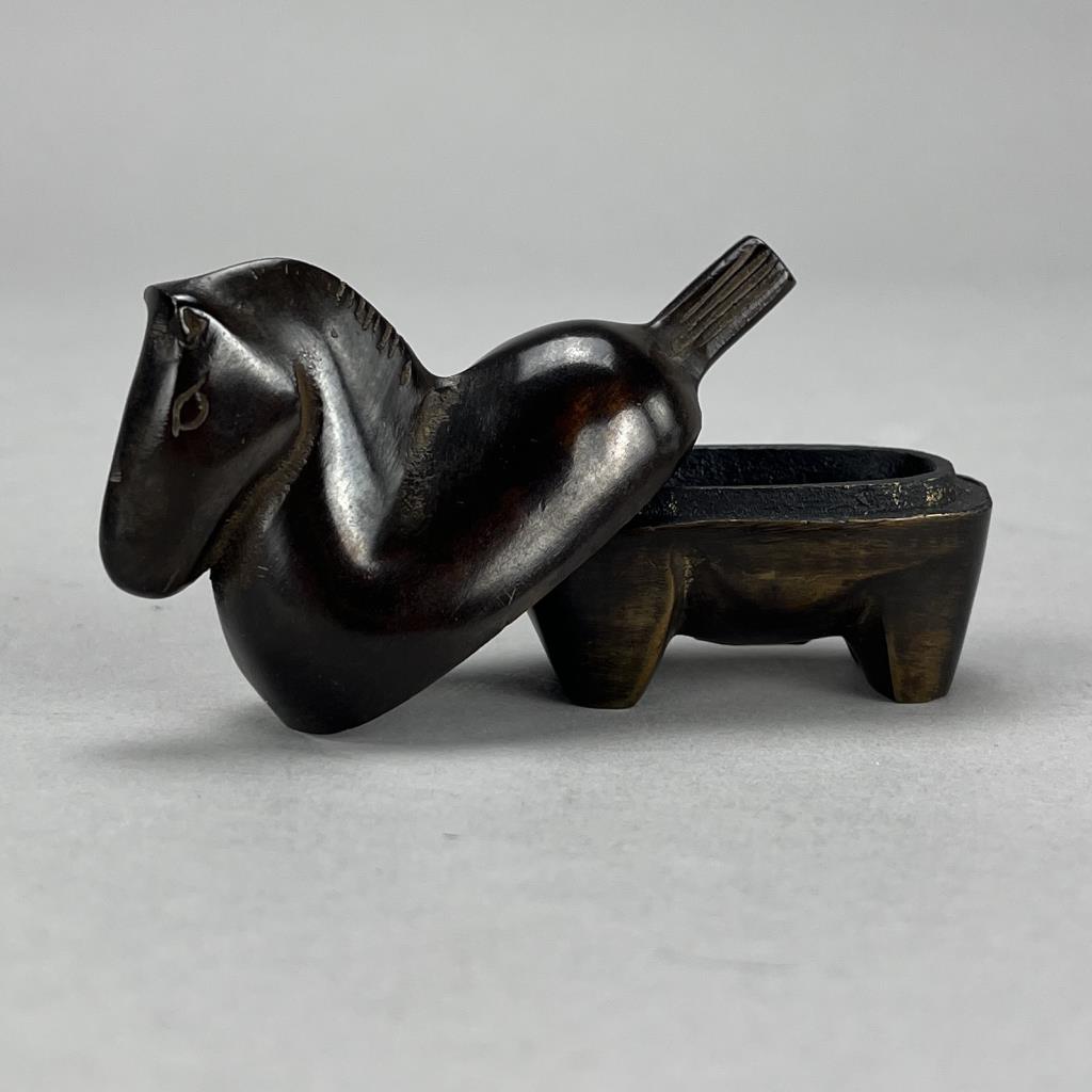 Miniature Japanese box, in the form of a horse, cast bronze with a deep golden brown patina, circa late 20th Century, retailed by Gumps, foil label on bottom, approximately 1-1/4″ x 3-1/8″ x 2-5/8″ CONDITION: Please Refer to Photos and Description for Condition. SHIPPING: In-House Shipping is available on this item. PLEASE read our Shipping Policies and our full Terms and Conditions prior to bidding.