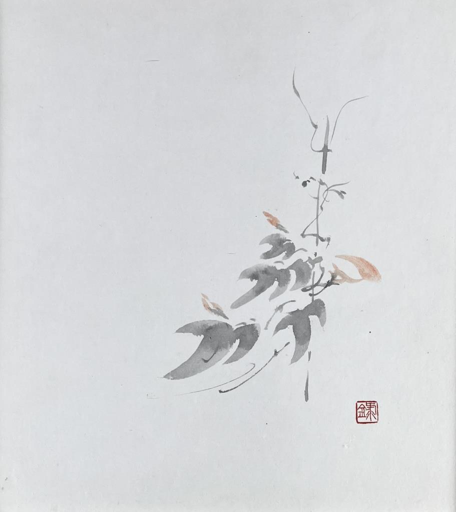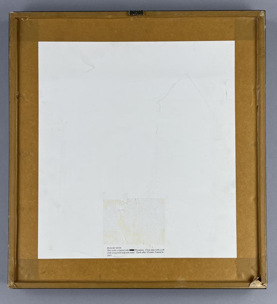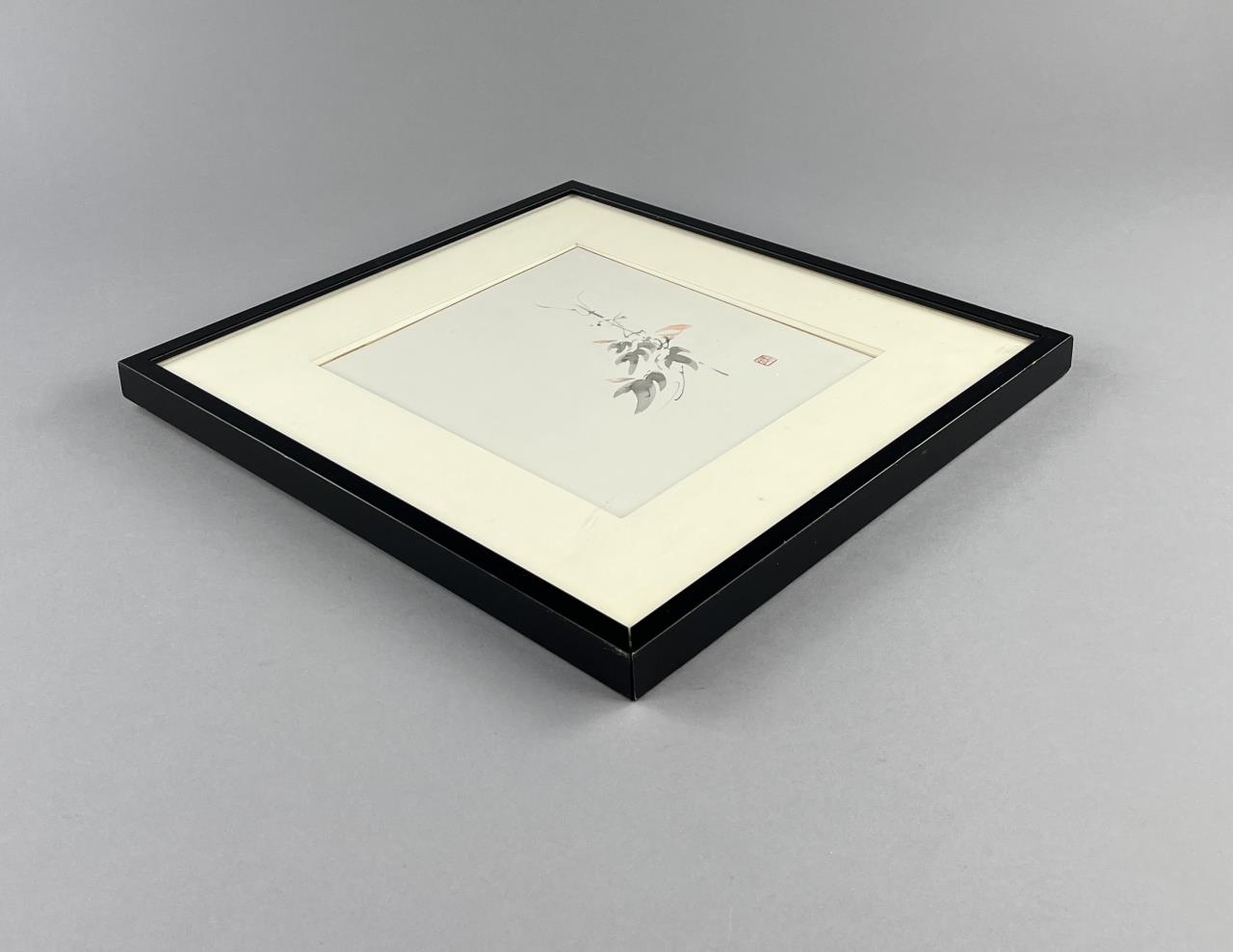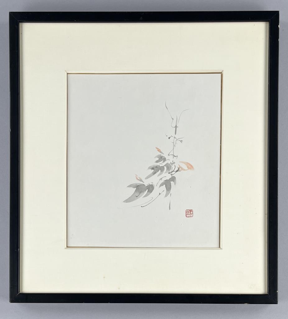 Japanese brush painting, depicting a vine with birds, 20th Century, chop mark lower right, in a black painted wood frame measuring 17-5/8″ x 16-3/8″. CONDITION: Not examined out of frame. Some damage to frame, especially at top and on edges, lower corners of frame are separating slightly, please see photos. SHIPPING: In-House Shipping is available on this item. PLEASE read our Shipping Policies and our full Terms and Conditions prior to bidding.
