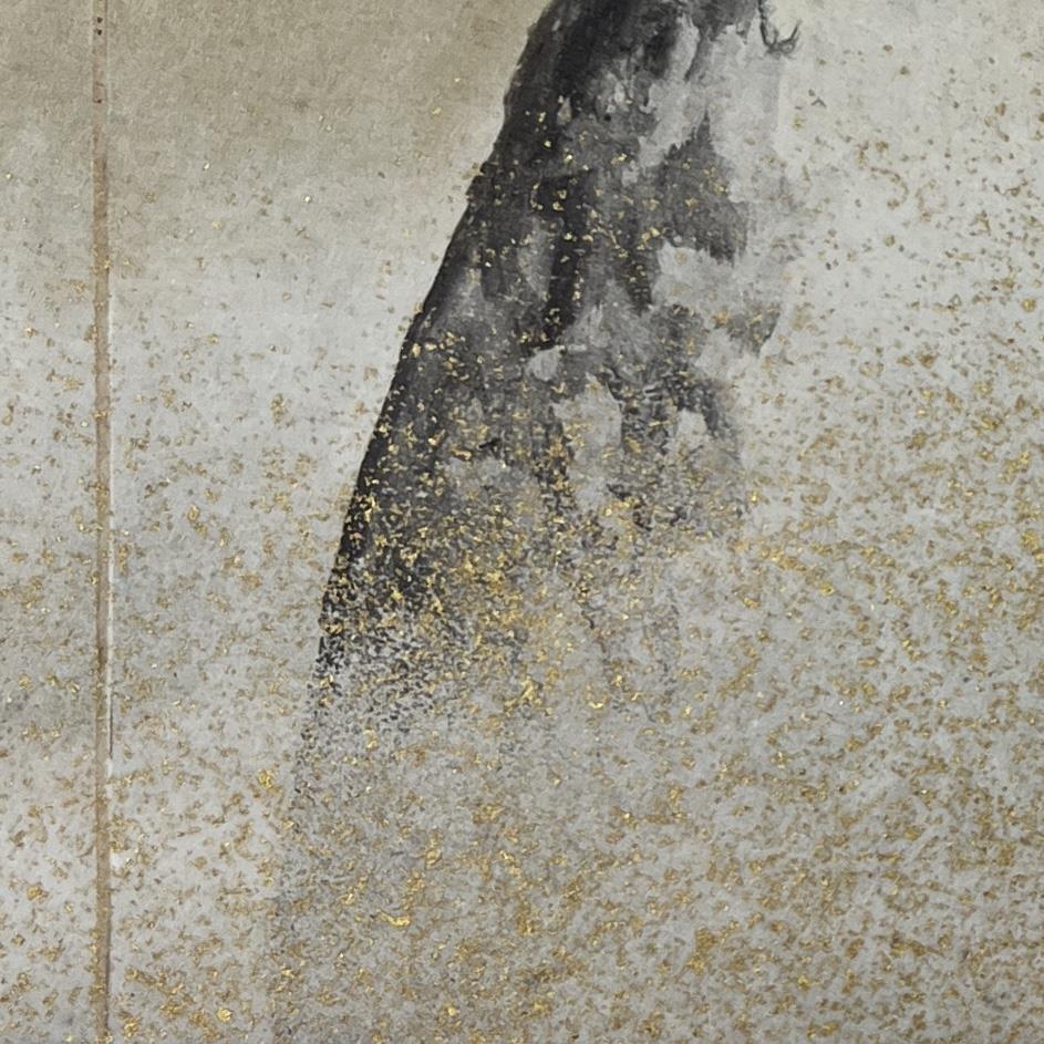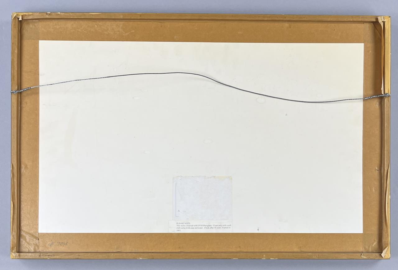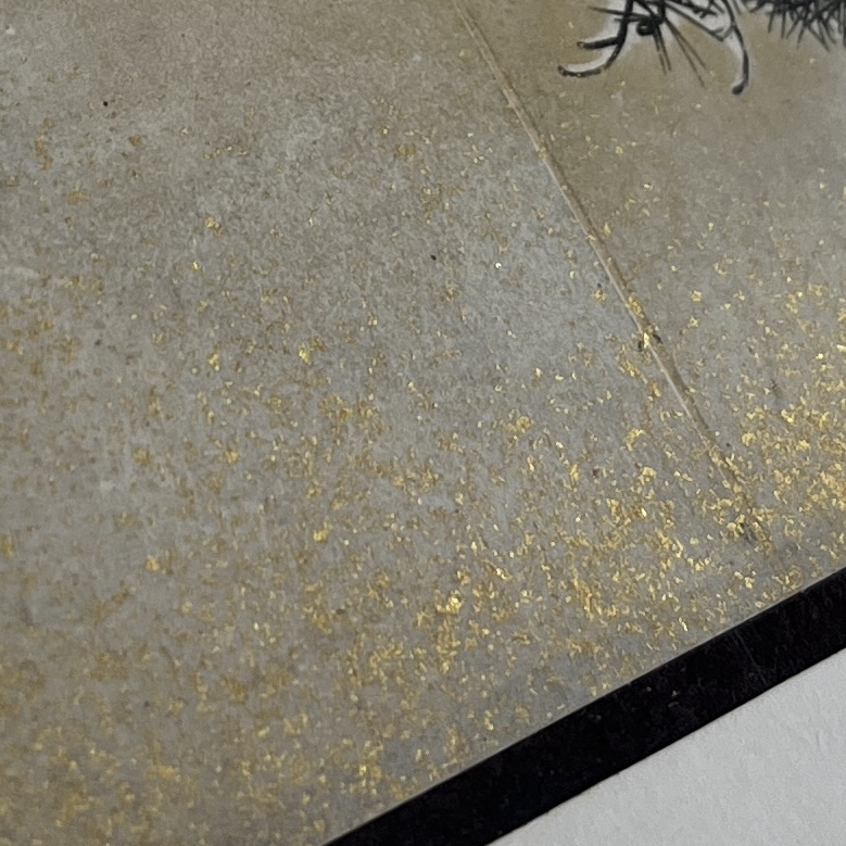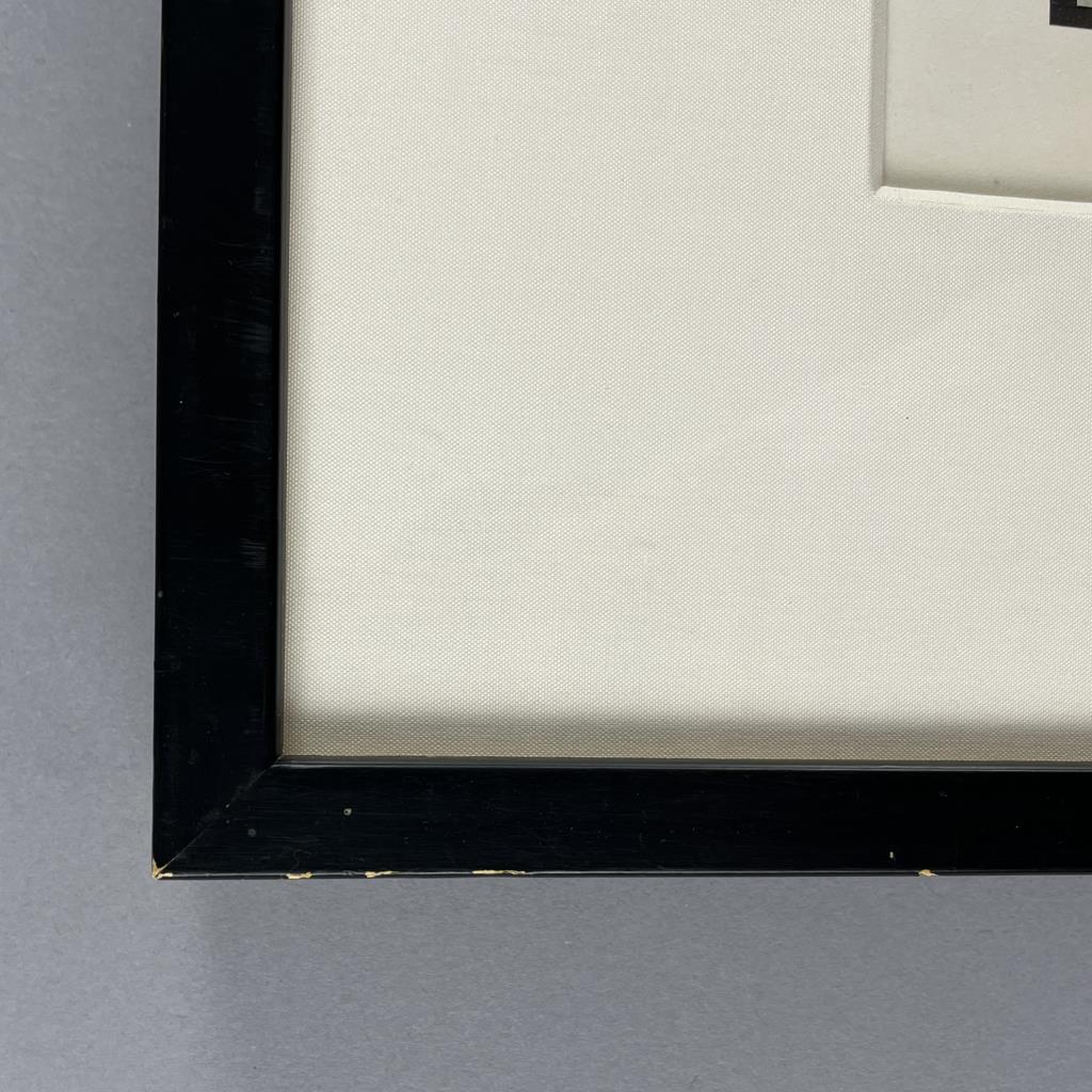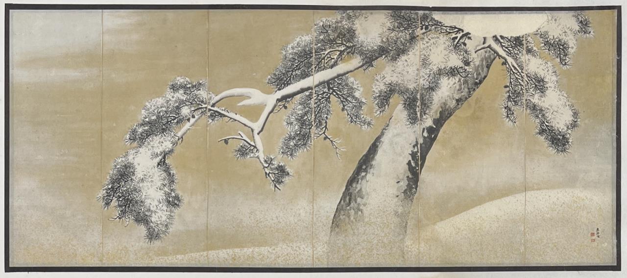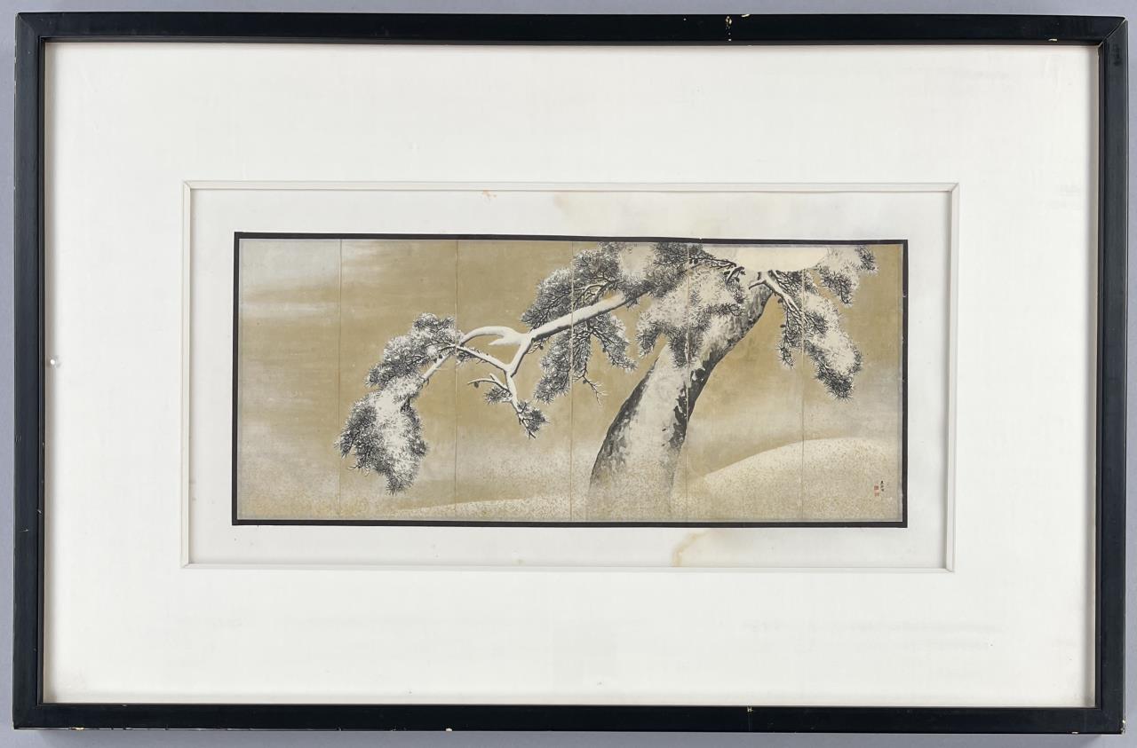 Framed modern reproduction photo print of the six-fold Japanese Edo Period screen, “Pine Trees in Snow”, by Maruyama Okyo (Japanese, 1733-1795), in a black painted wood frame measuring 16-1/8″ x 24-15/16″. CONDITION: Not examined out of frame. Some chipping and scratching to frame as well as one corner that is beginning to separate, please see photos. SHIPPING: In-House Shipping is available on this item. PLEASE read our Shipping Policies and our full Terms and Conditions prior to bidding.