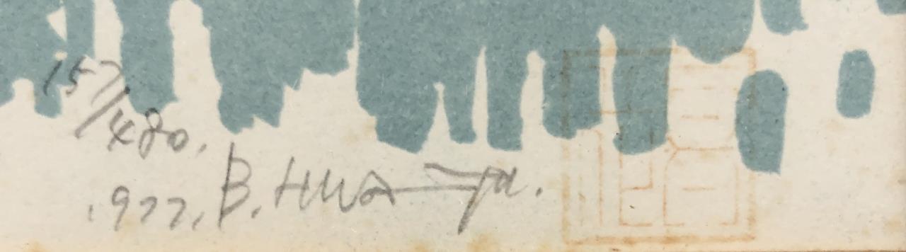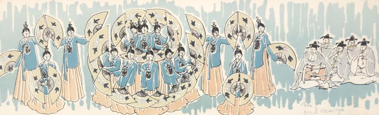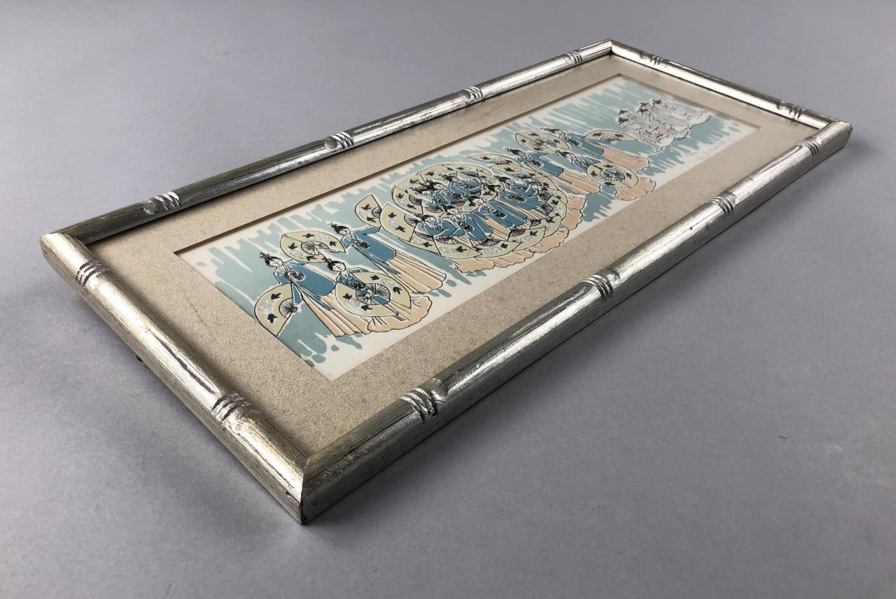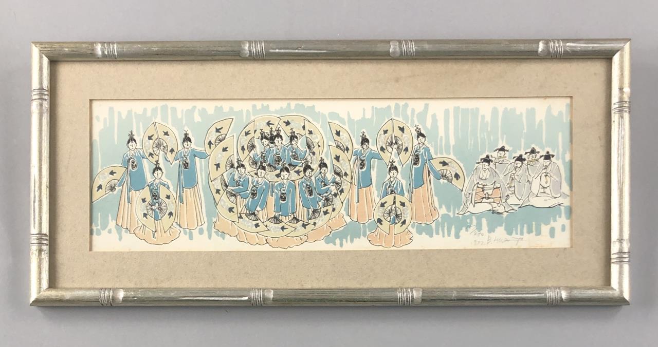 Framed, signed, dated, and numbered limited edition print, most likely depicting a Korean folk dance ceremony, in a silver gilt bamboo style frame measuring approximately 7-3/4″ x 17-1/2″. CONDITION: Not examined out of frame. Visible foxing at edges near mat, possible fading, chop mark is very faint. SHIPPING: In-House Shipping is available on this item. PLEASE read our Shipping Policies and our full Terms and Conditions prior to bidding.