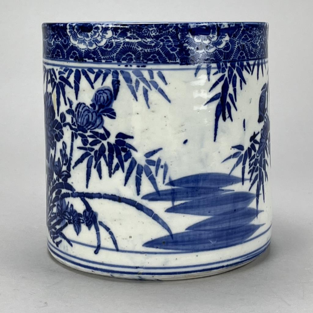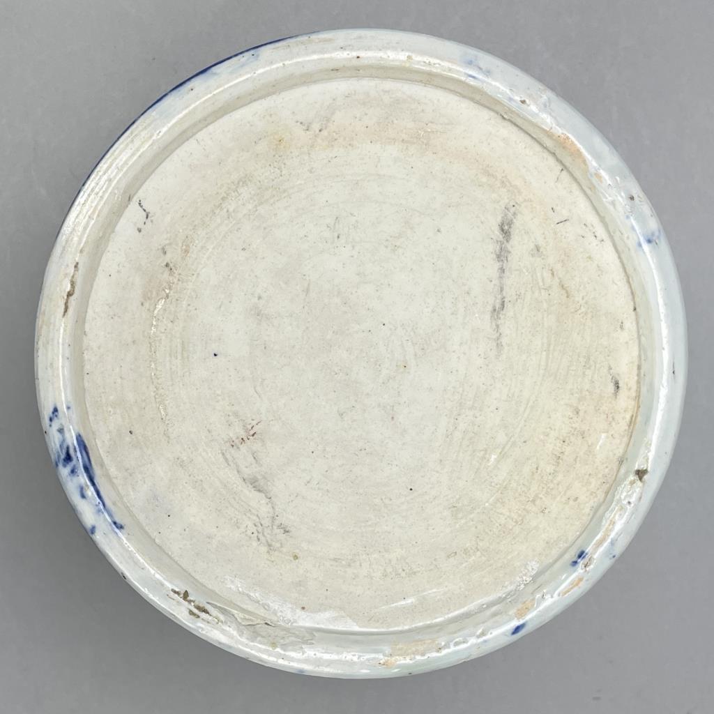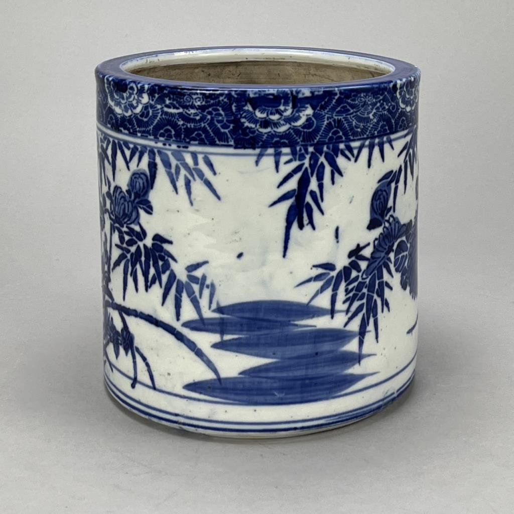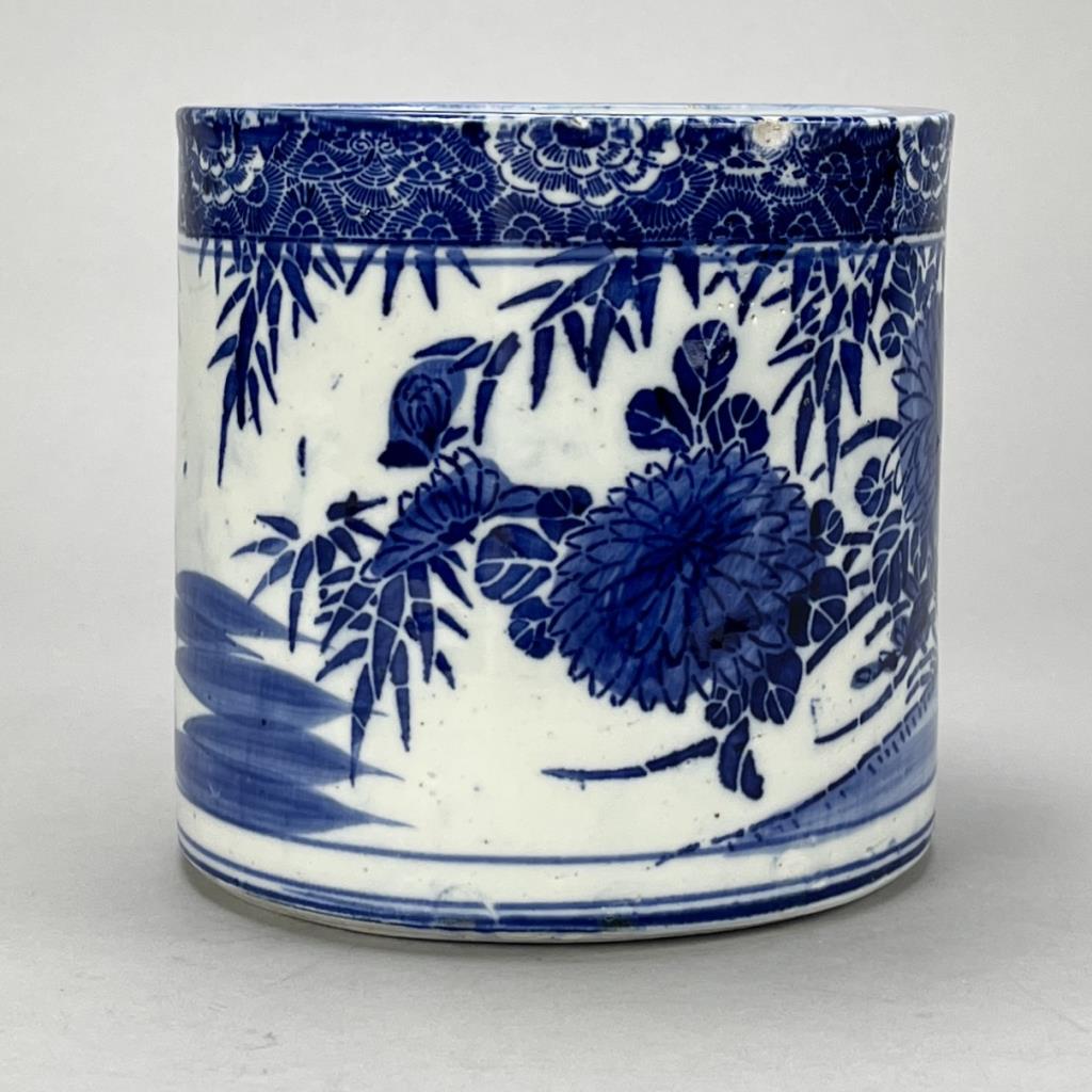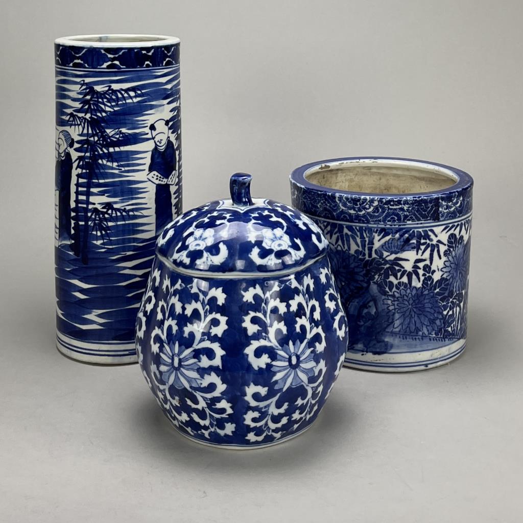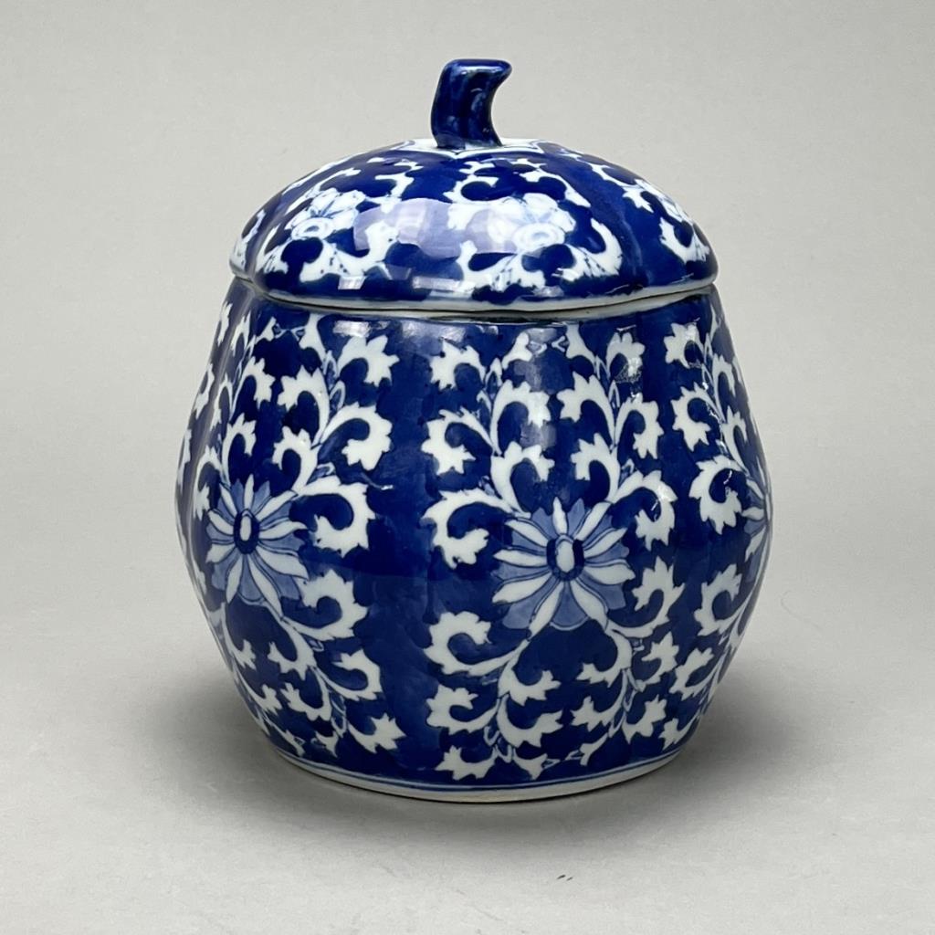 Three pieces of hand painted Chinese blue and white pottery, a cylinder vase 12″ (H), a jardiniere 6-3/4″ (H), and a figural squash or pumpkin canister with lid 8″ (H), all 20th Century. CONDITION: The jardiniere has two chips on the rim, please see photos. SHIPPING: In-House Shipping is available on this item. PLEASE read our Shipping Policies and our full Terms and Conditions prior to bidding.