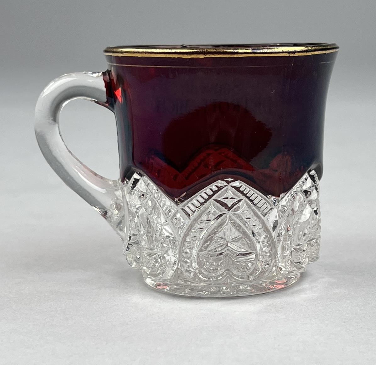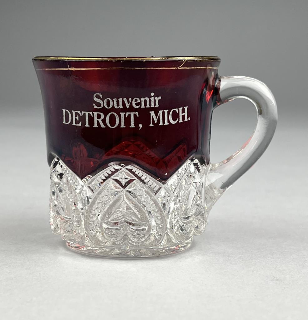 Historic souvenir ruby flash glass mug, from Detroit Michigan, late 19th / early 20th Century, 2-3/4″ (H). CONDITION: Please Refer to Photos and Description for Condition. SHIPPING: In-House Shipping is available on this item. PLEASE read our Shipping Policies and our full Terms and Conditions prior to bidding.