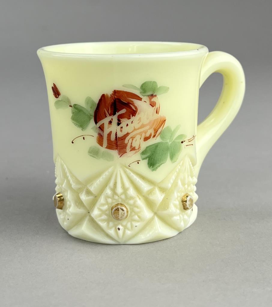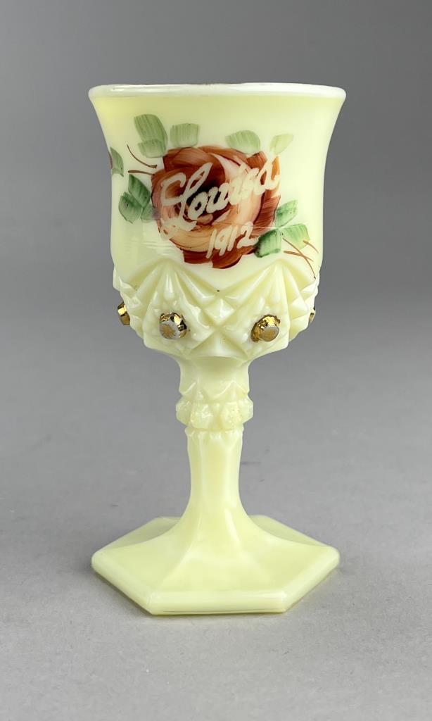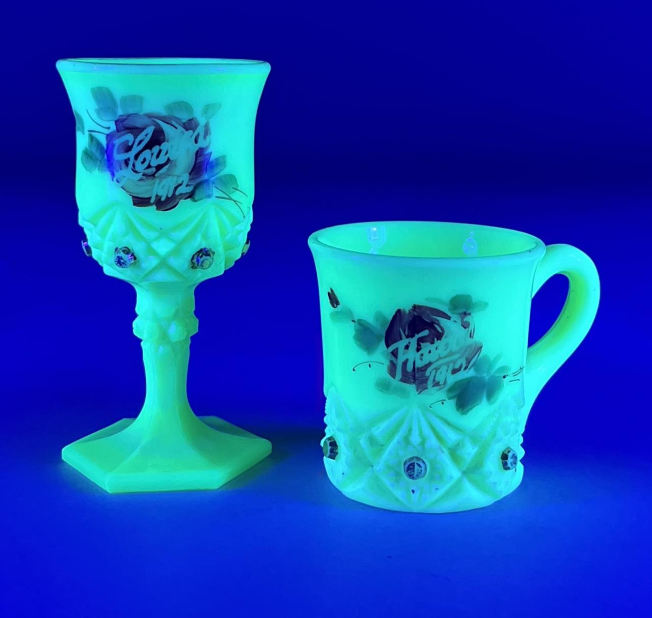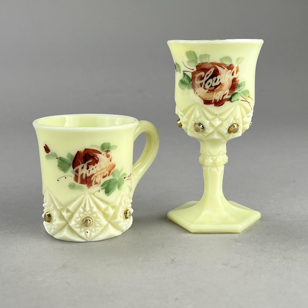 Souvenir uranium custard glass hand painted miniature goblet inscribed “Louisa 1912”, and a miniature mug inscribed “Harold 1912″, the largest is 4-1/8” (H). CONDITION: Please Refer to Photos and Description for Condition. SHIPPING: In-House Shipping is available on this item. PLEASE read our Shipping Policies and our full Terms and Conditions prior to bidding.