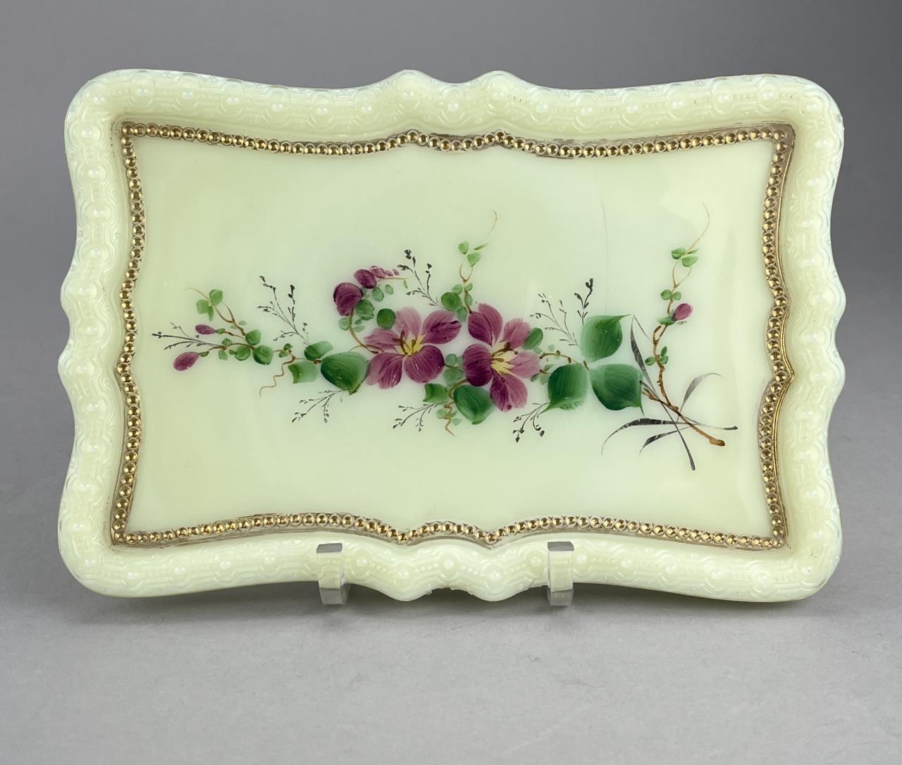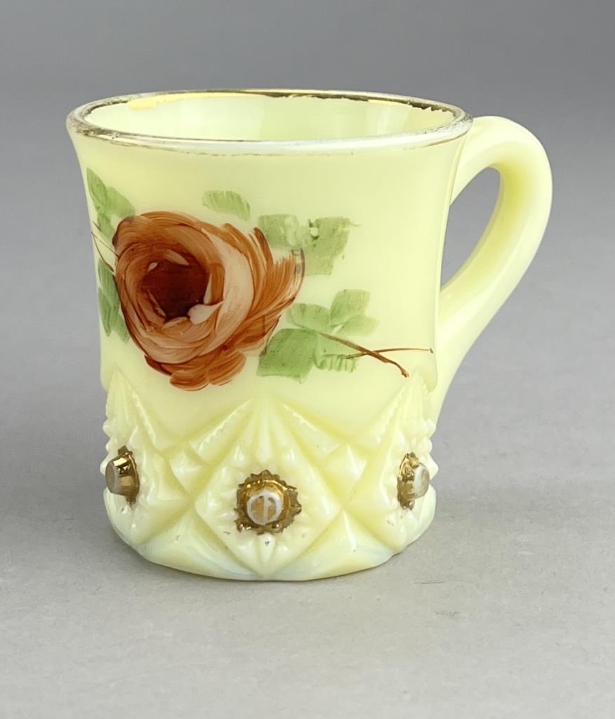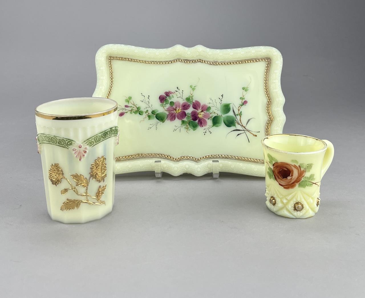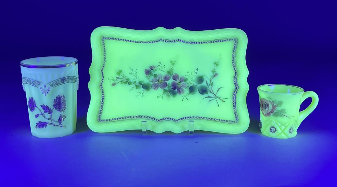 Antique uranium custard glass, tray with hand painted violets (8-1/2″ x 5-3/4″ x 5/8″), miniature handled cup or demitasse with hand painted floral decoration (2-1/2″ H), and a H. Northwood & Company (USA) tumbler or drinking glass (4/3/4″ H), all late 19th / early 20th Century. CONDITION: Please Refer to Photos and Description for Condition. SHIPPING: In-House Shipping is available on this item. PLEASE read our Shipping Policies and our full Terms and Conditions prior to bidding.