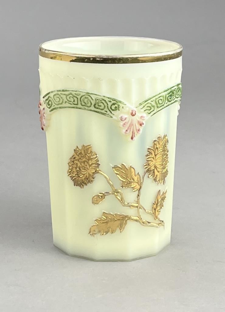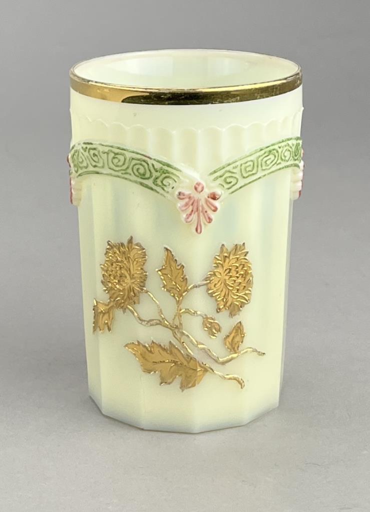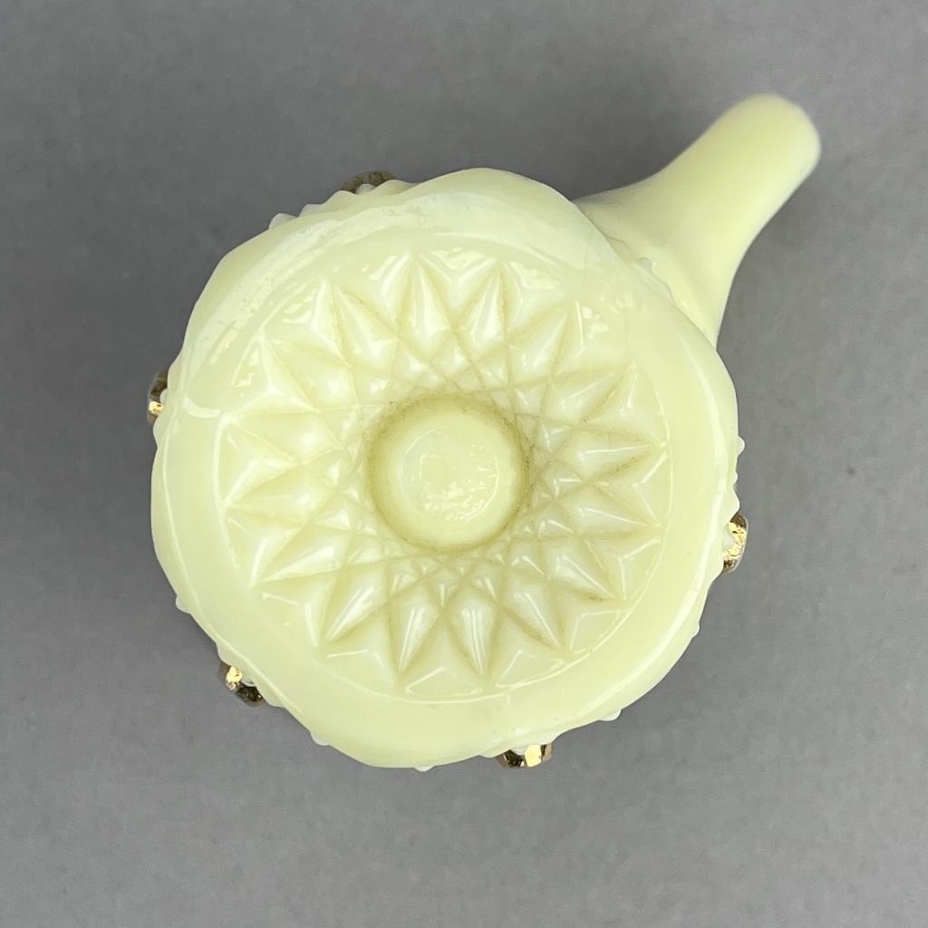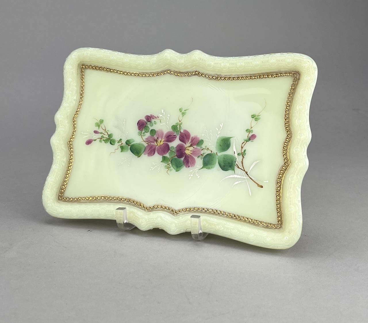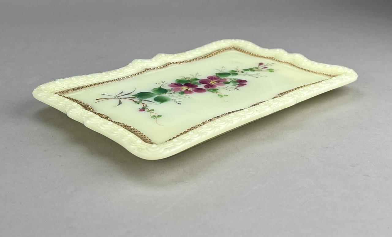 Antique uranium custard glass, tray with hand painted violets (8-1/2″ x 5-3/4″ x 5/8″), miniature handled cup or demitasse with hand painted floral decoration (2-1/2″ H), and a H. Northwood & Company (USA) tumbler or drinking glass (4/3/4″ H), all late 19th / early 20th Century. CONDITION: Please Refer to Photos and Description for Condition. SHIPPING: In-House Shipping is available on this item. PLEASE read our Shipping Policies and our full Terms and Conditions prior to bidding.