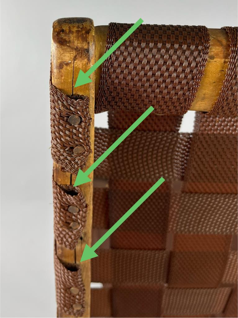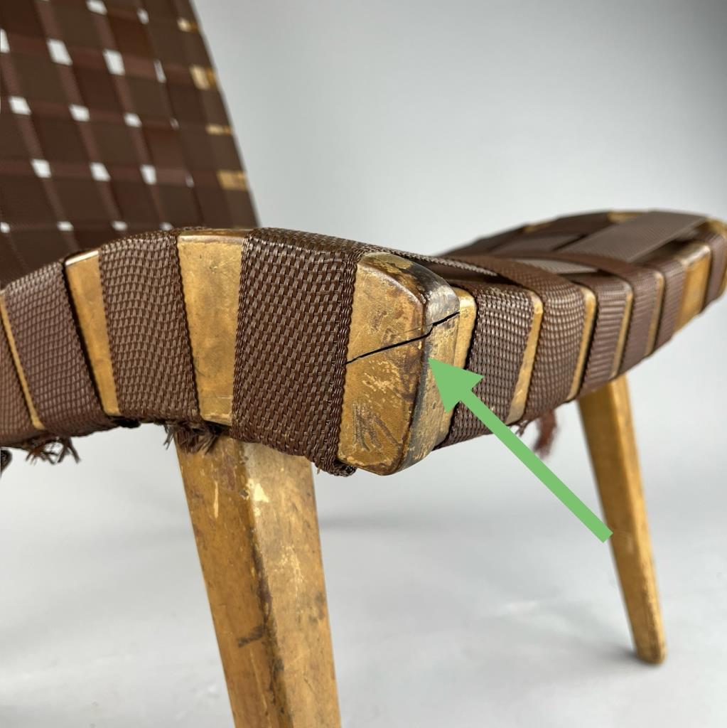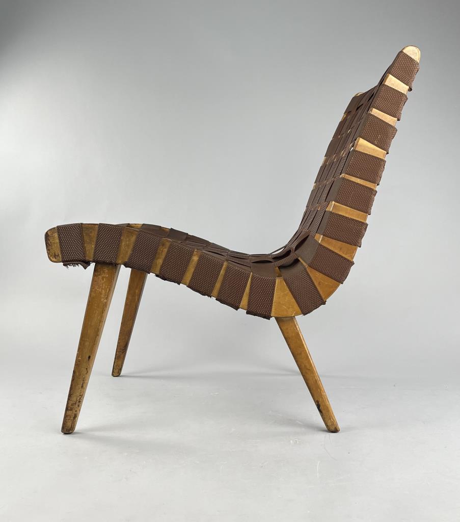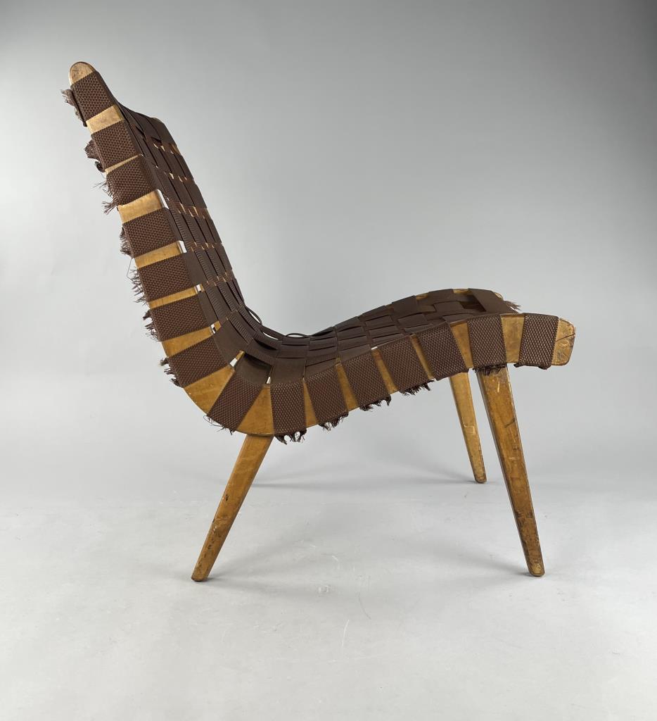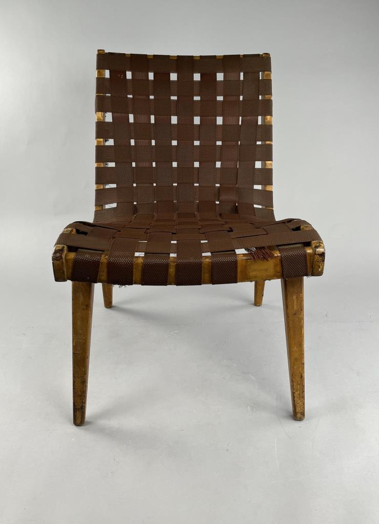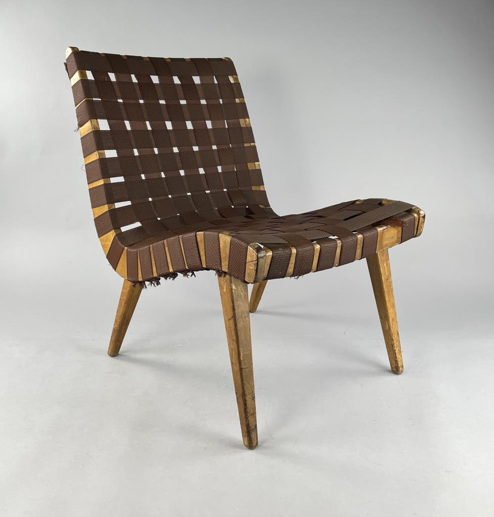 In the style of Jens Risom’s (Danish/American, 1916-2016) armless lounge chair Model 654W, unmarked, circa mid 20th Century, 28-1/2″ x 19-3/4″ x 29-1/2″. CONDITION: Breaks in the webbing, at least three splits or cracks in the wood frame, and staining, discoloration, and loss to finish in areas. Please see photos. SHIPPING: Local pick-up or third party shipping only for this lot. Please see the Shipping Policy for information on suggested shippers. We recommend the Pak Mail Store of Battle Creek to assist you. Please contact the shipper of your choice for shipping estimates on this lot. Refer to the Shipping section in our full Terms and Conditions for all information on shipping.