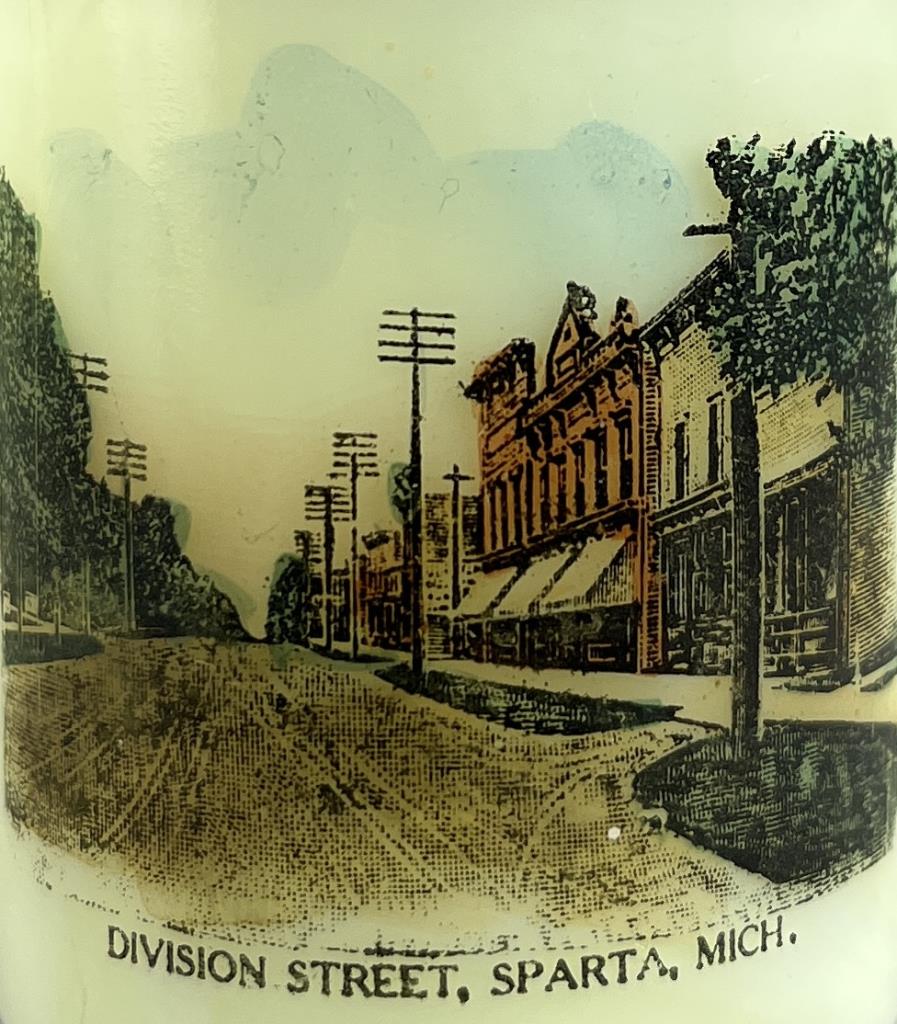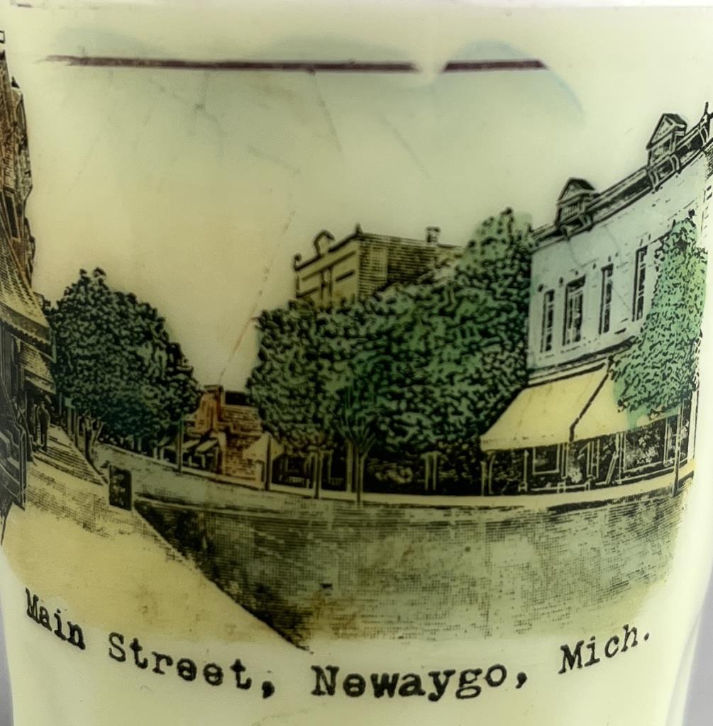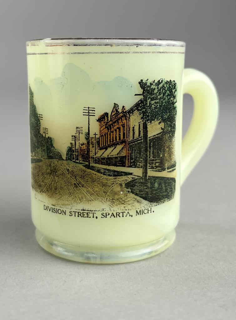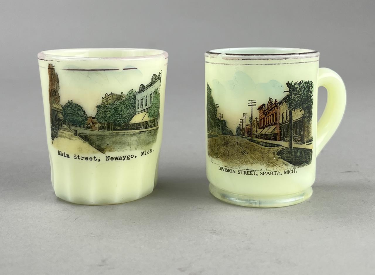 Historic souvenir uranium custard glass miniature mug and shot glass, one from Sparta Michigan showing Division Street and the other from Newaygo Michigan showing Main Street, late 19th / early 20th Century, both approximately 2-3/8″ (H). CONDITION: There is chip on rim of the mug. SHIPPING: In-House Shipping is available on this item. PLEASE read our Shipping Policies and our full Terms and Conditions prior to bidding.