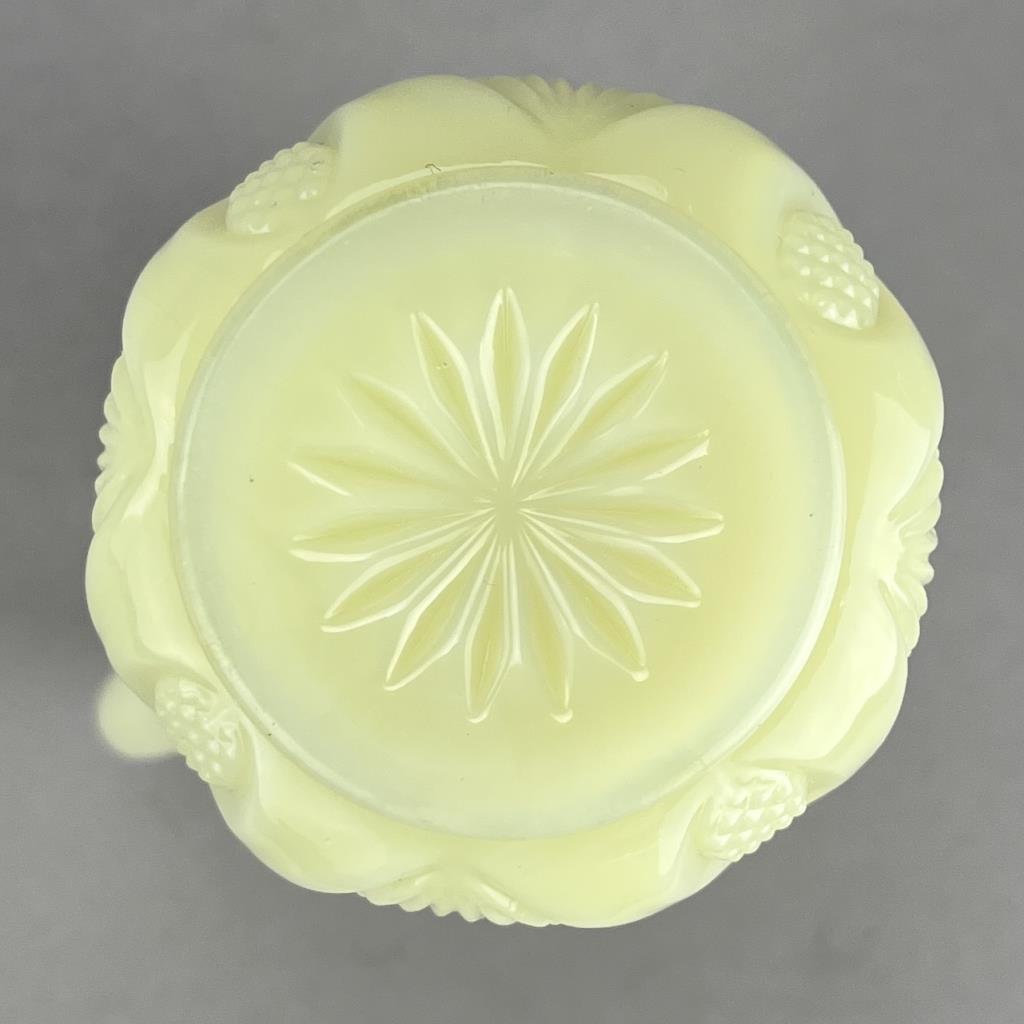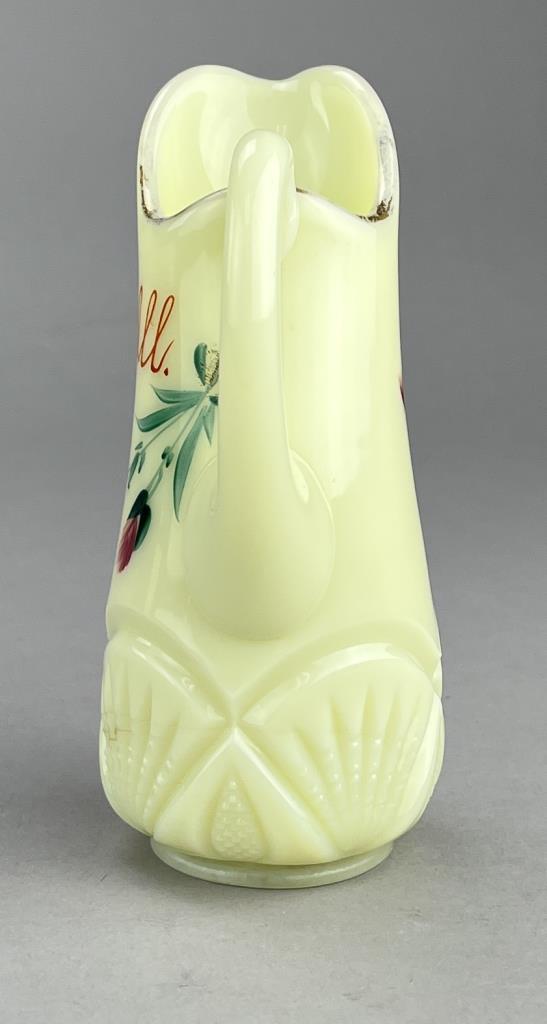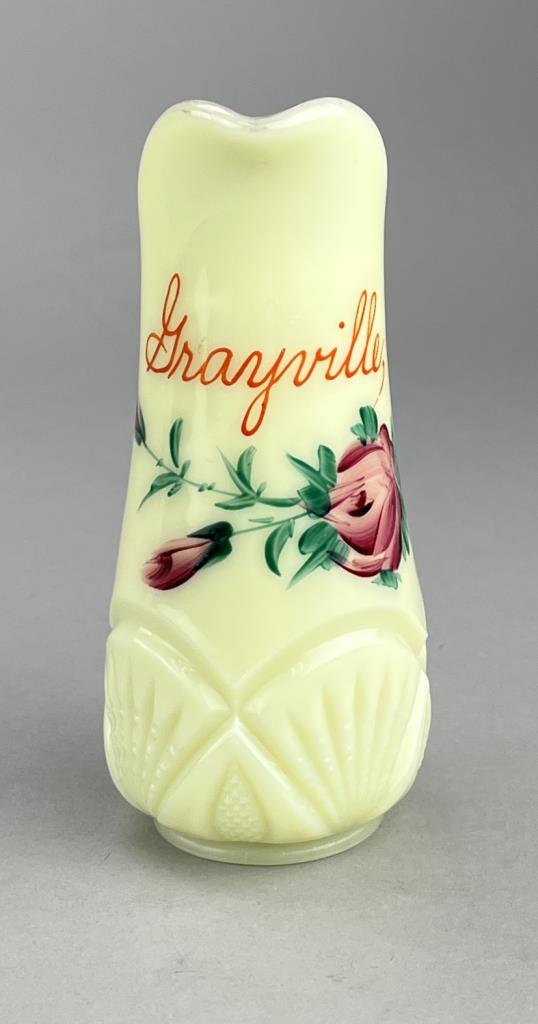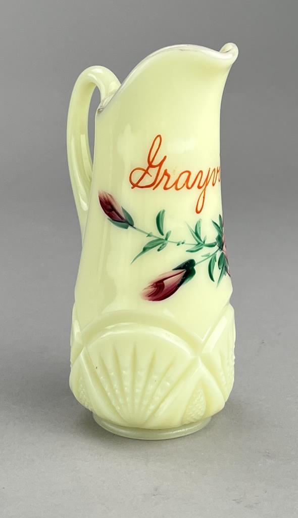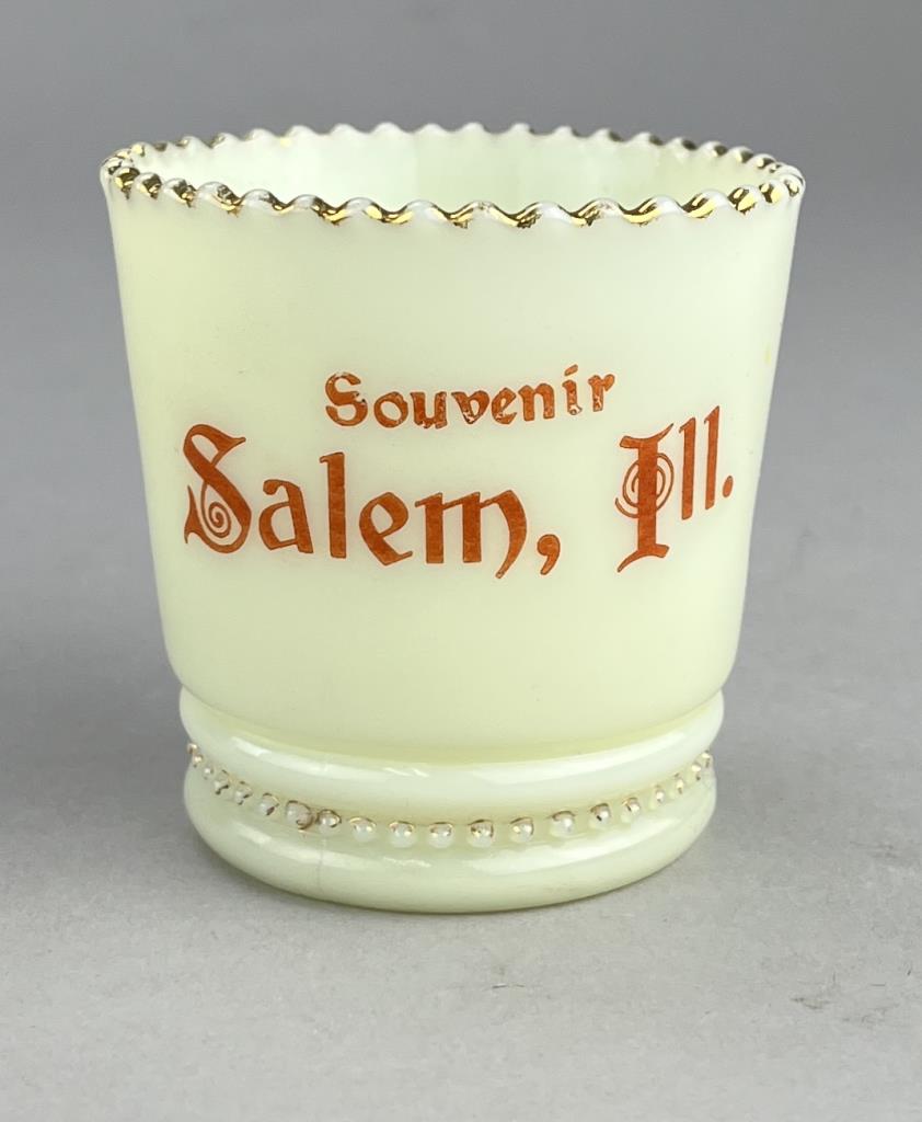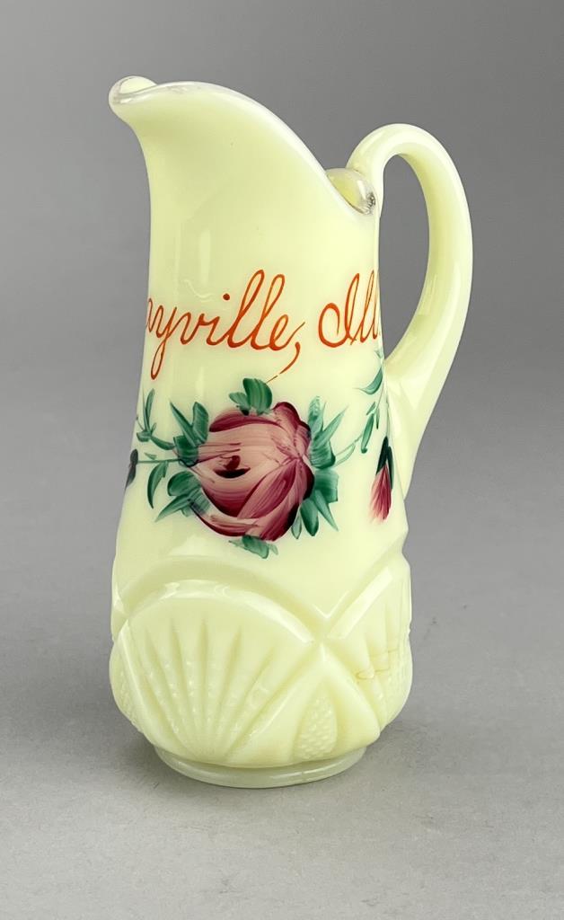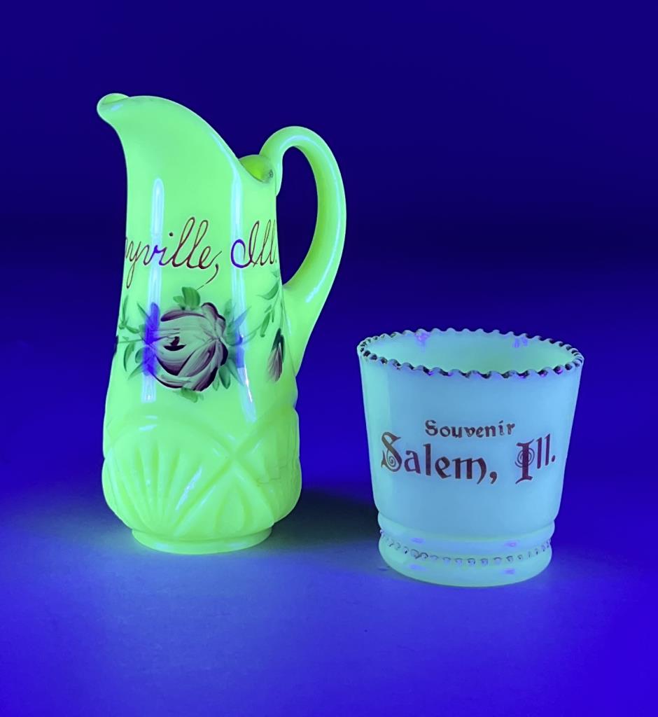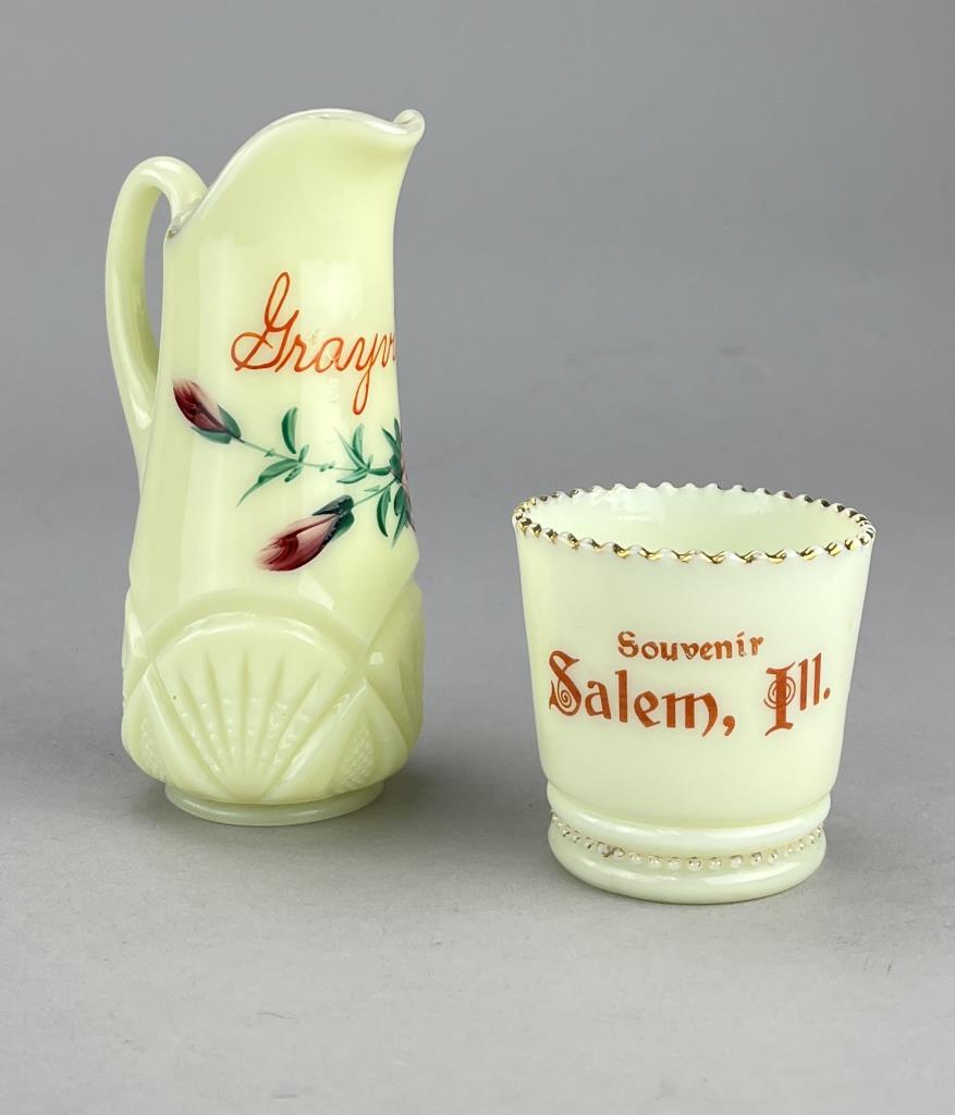 Historic souvenir uranium custard glass toothpick holder and small pitcher, one from Salem Illinois and the other from Grayville Illinois, late 19th / early 20th Century, the tallest 5-1/4″ (H). CONDITION: Please Refer to Photos and Description for Condition. SHIPPING: In-House Shipping is available on this item. PLEASE read our Shipping Policies and our full Terms and Conditions prior to bidding.