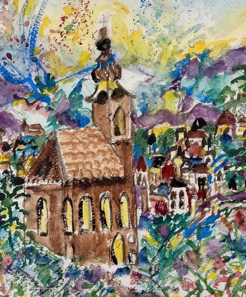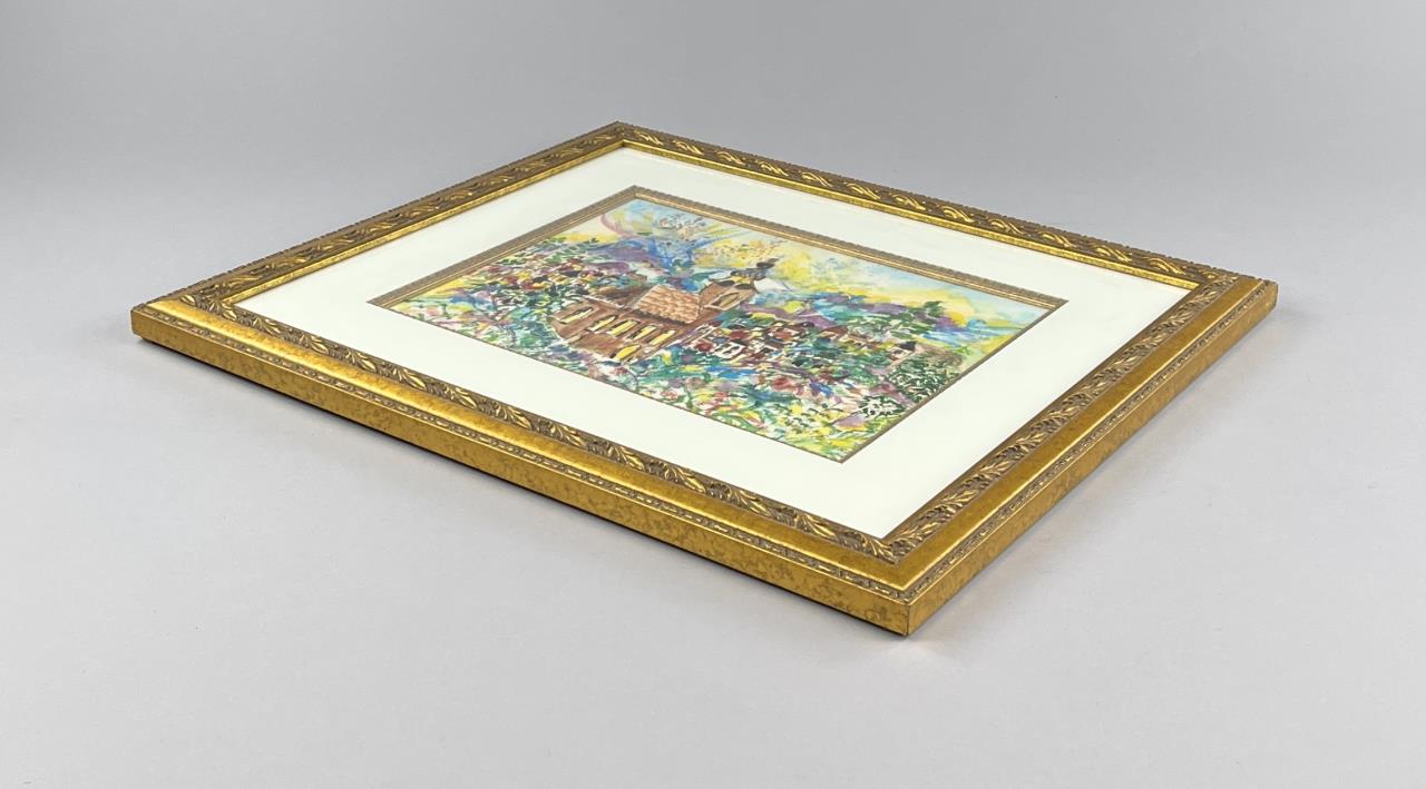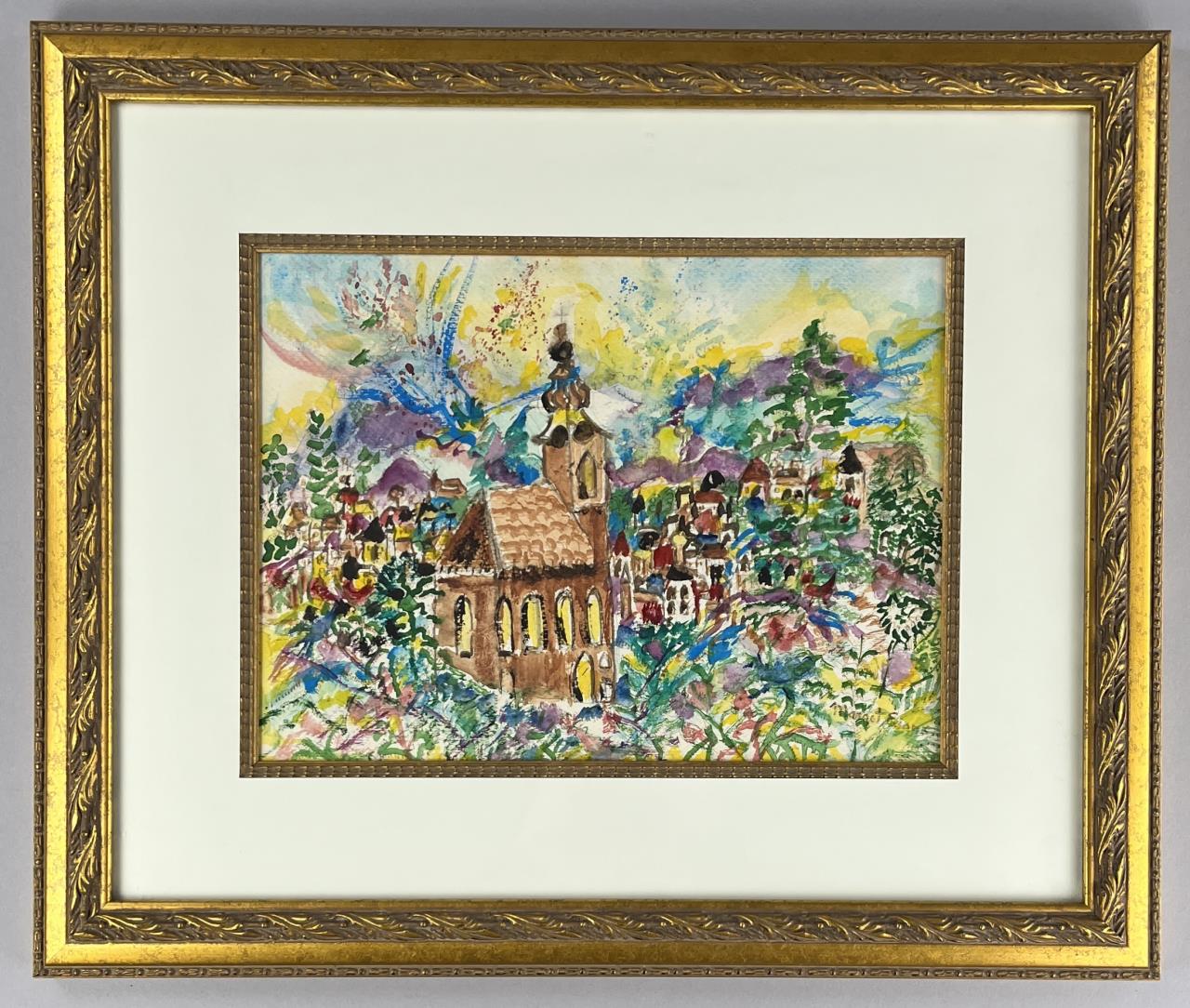 Margo Evens (German/American, 1914-1985), watercolor and gouache painting on paper, depicting a European village, possibly painted on a return trip that Evans made to her country of birth, Germany, signed lower right, in a gilt gesso and wood frame measuring 19-9/16″ x 23-1/4″. Evens lived in Haslett Michigan and taught at Michigan State University for many years. CONDITION: Not examined out of frame. SHIPPING: In-House Shipping is available on this item. PLEASE read our Shipping Policies and our full Terms and Conditions prior to bidding.