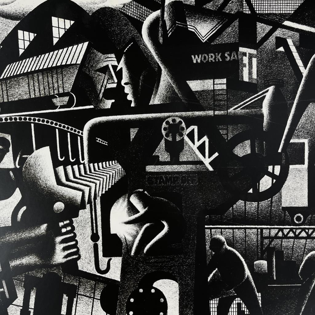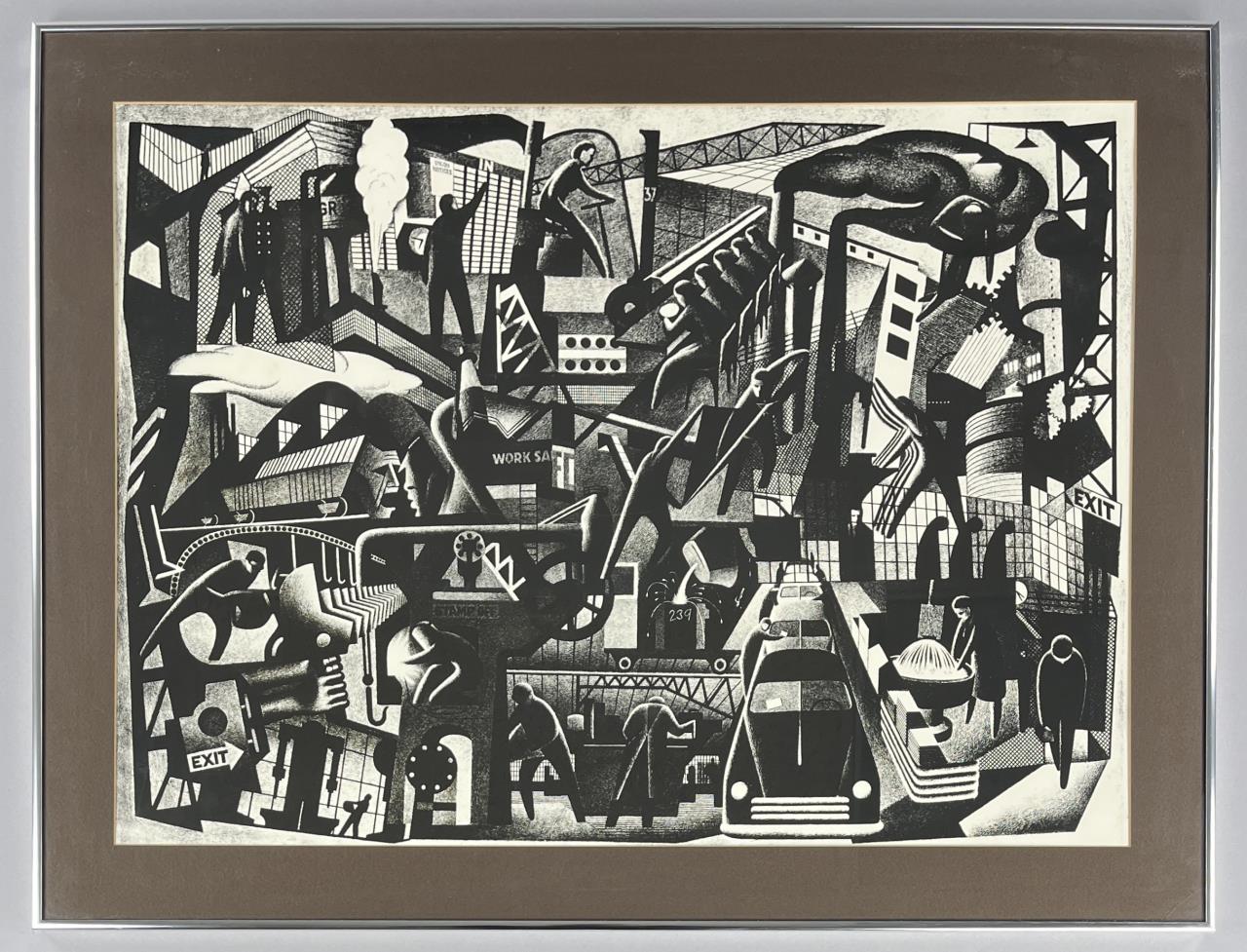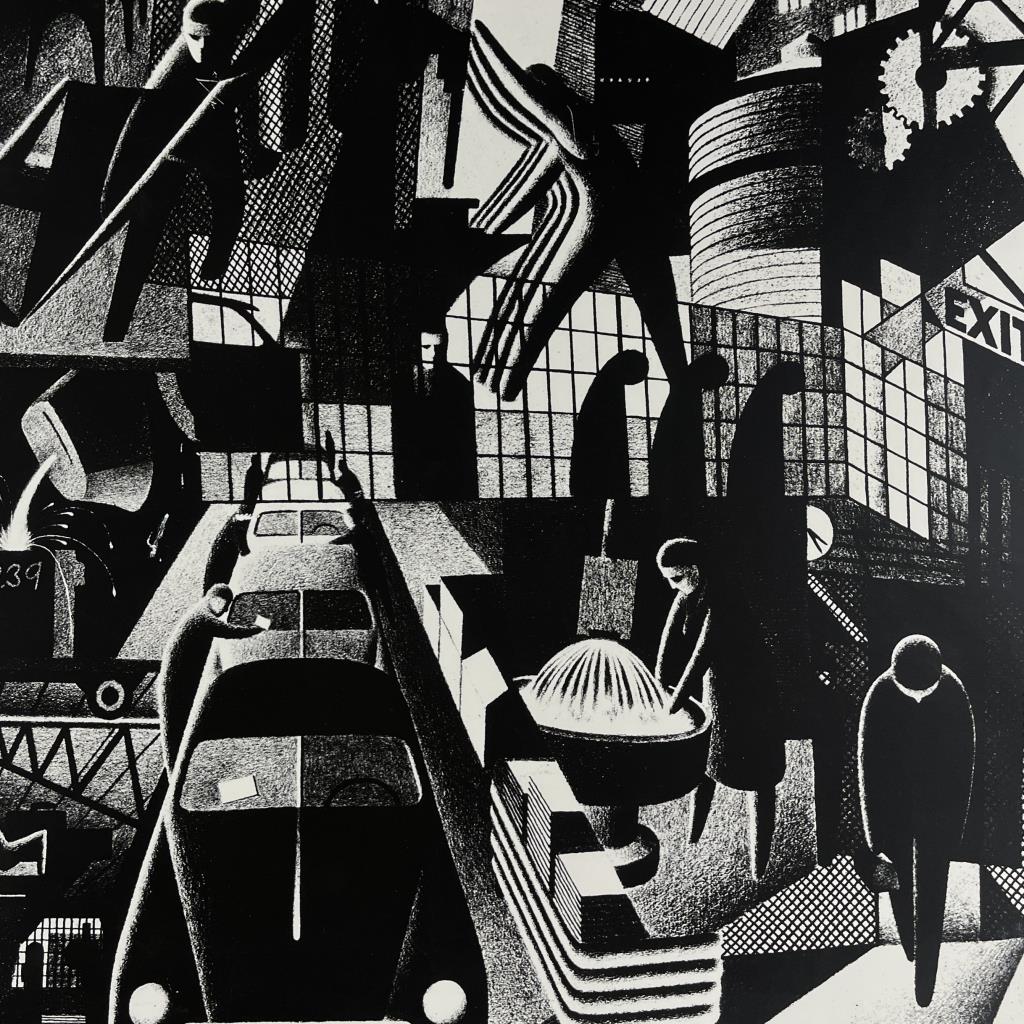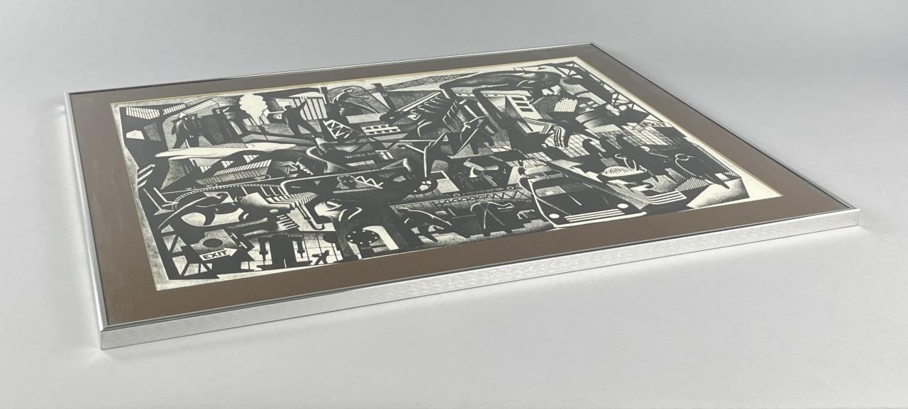 Industrial Works Progress Administration (WPA) style print, by an unknown artist, depicting a mid 20th Century automobile factory with themes related to the labor movement, most likely offset printed, in a contemporary silver toned metal frame measuring 26-3/16″ x 34-3/16″ CONDITION: Attached to backing board and mat, not examined out of mat. SHIPPING: Local pick-up or third party shipping only for this lot. Please see the Shipping Policy for information on suggested shippers. We recommend the Pak Mail Store of Battle Creek to assist you. Please contact the shipper of your choice for shipping estimates on this lot. Refer to the Shipping section in our full Terms and Conditions for all information on shipping.