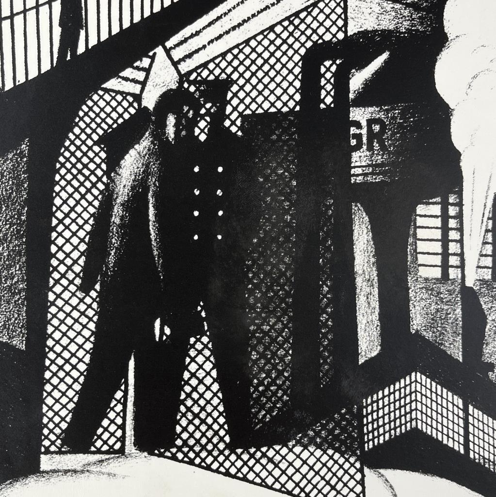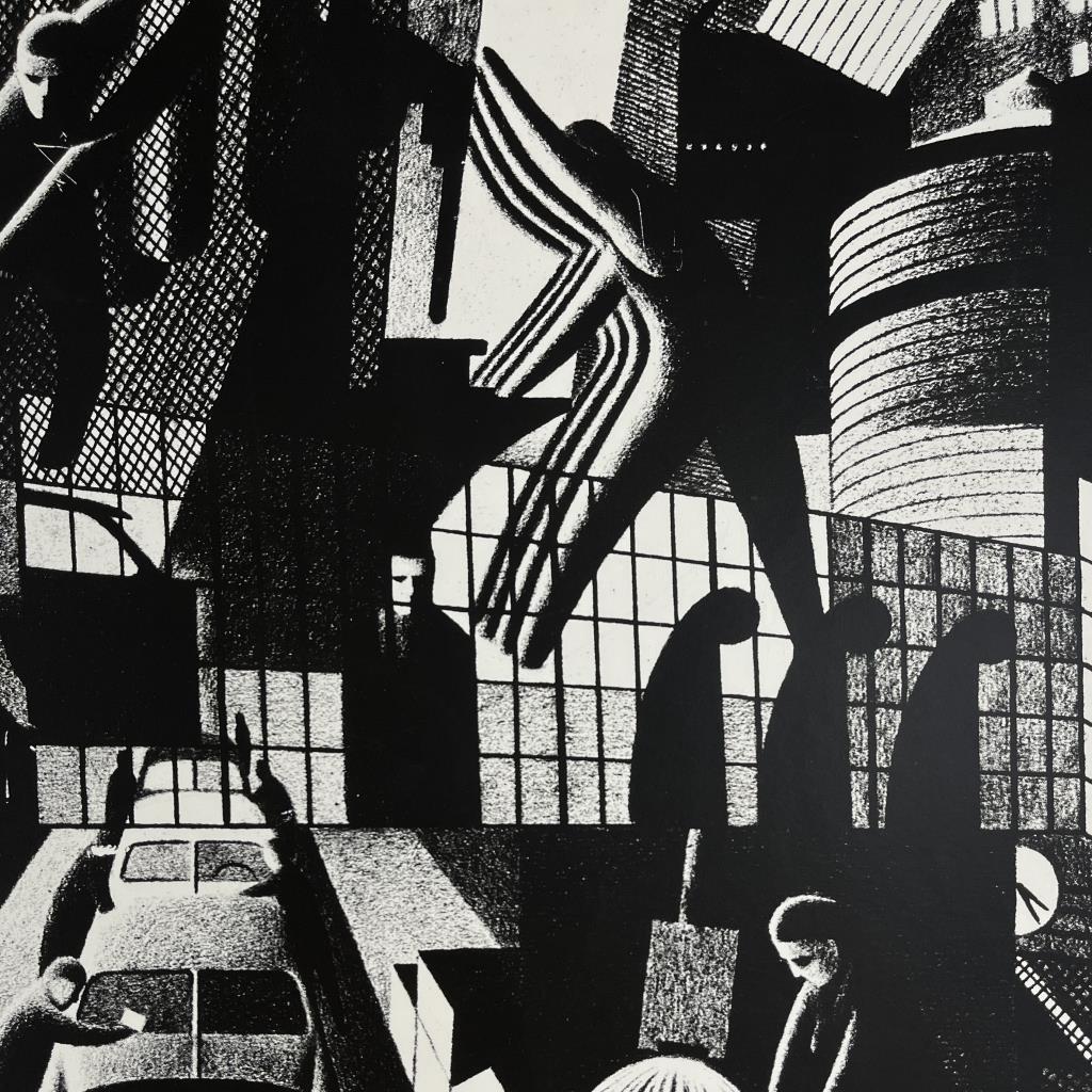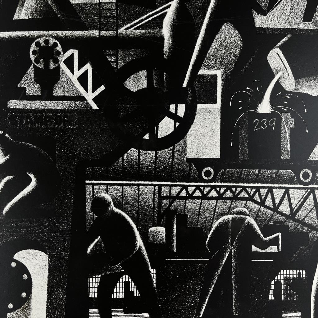 Industrial Works Progress Administration (WPA) style print, by an unknown artist, depicting a mid 20th Century automobile factory with themes related to the labor movement, most likely offset printed, in a contemporary silver toned metal frame measuring 26-3/16″ x 34-3/16″ CONDITION: Attached to backing board and mat, not examined out of mat. SHIPPING: Local pick-up or third party shipping only for this lot. Please see the Shipping Policy for information on suggested shippers. We recommend the Pak Mail Store of Battle Creek to assist you. Please contact the shipper of your choice for shipping estimates on this lot. Refer to the Shipping section in our full Terms and Conditions for all information on shipping.