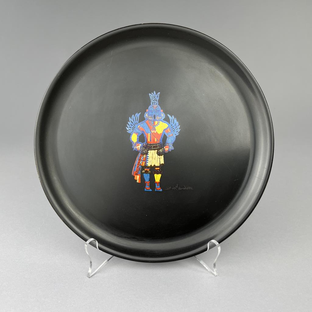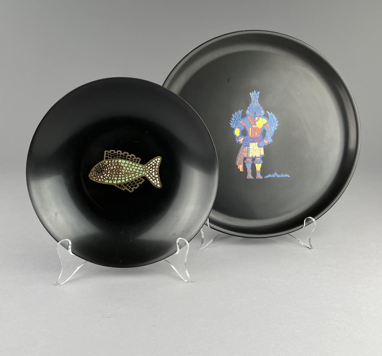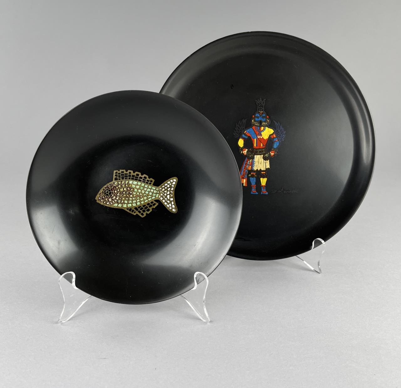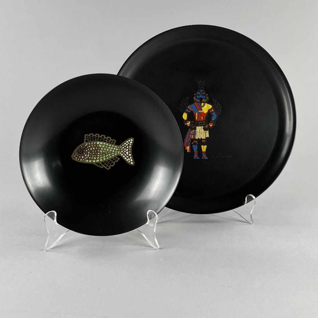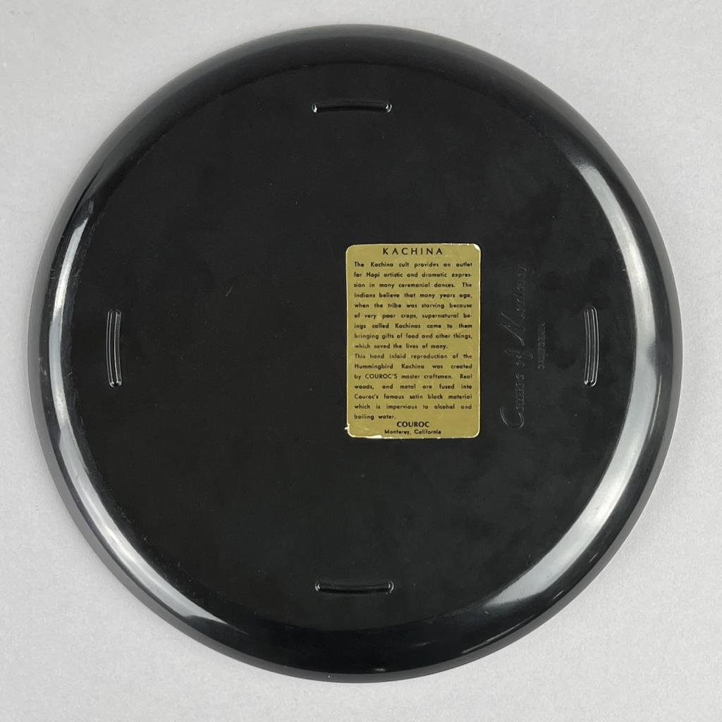 Mid Century Modern Couroc (Monterey, California) bowl with a fish design (7-3/4″ D) and round tray with a Hopi Hummingbird Katchina (10-3/8″ D), inlaid phenolic resin. CONDITION: Some very minor scratching and staining, commensurate with age and use, please see photos. SHIPPING: In-House Shipping is available on this item. PLEASE read our Shipping Policies and our full Terms and Conditions prior to bidding.
