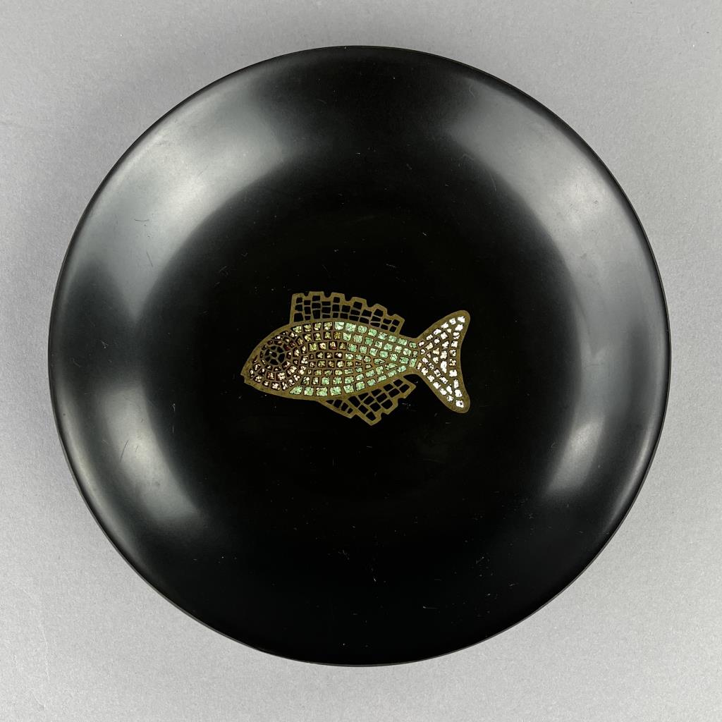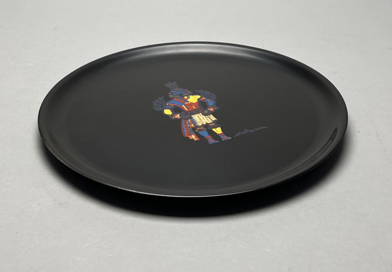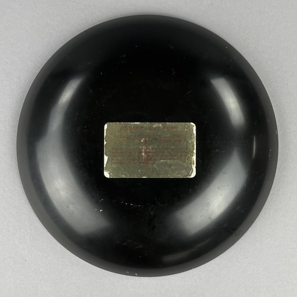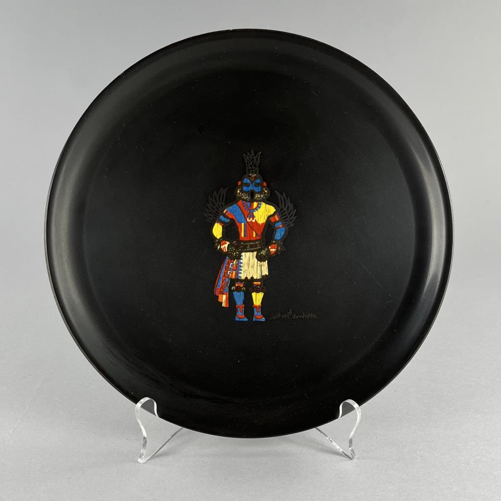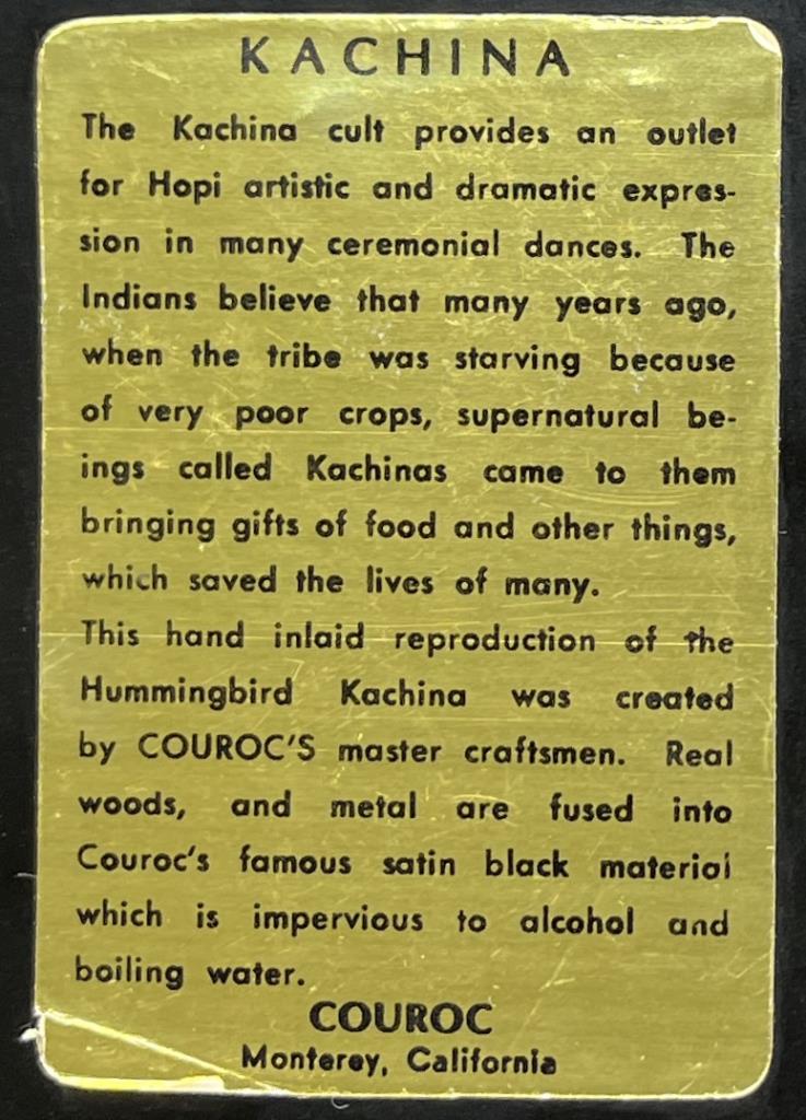 Mid Century Modern Couroc (Monterey, California) bowl with a fish design (7-3/4″ D) and round tray with a Hopi Hummingbird Katchina (10-3/8″ D), inlaid phenolic resin. CONDITION: Some very minor scratching and staining, commensurate with age and use, please see photos. SHIPPING: In-House Shipping is available on this item. PLEASE read our Shipping Policies and our full Terms and Conditions prior to bidding.