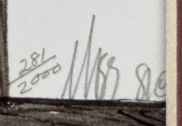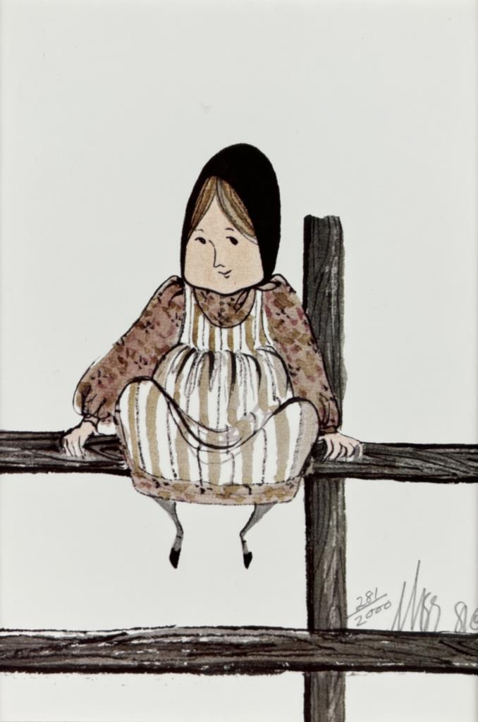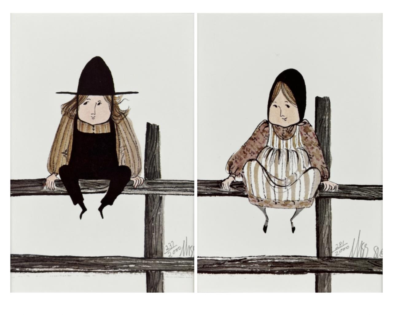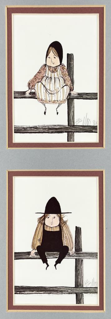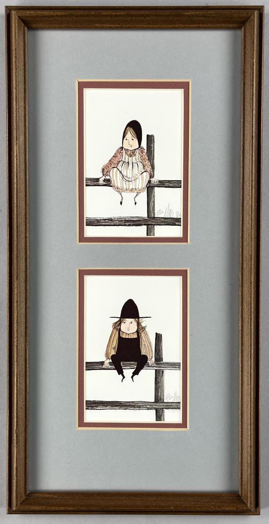 Patricia Buckley Moss, also known as “P. Buckley Moss”, (American, 1933-2024), two framed signed limited edition lithograph prints. The first, titled “Girl on Fence”, 1981, pencil signed lower right “Moss” and numbered (281/2000). The second, titled “Boy on Fence”, pencil signed lower right “Moss” and numbered (237/2000). In a light brown wood frame measuring 18-1/4″ x 9-3/16″. Moss, who Charles Kuralt in 1988 called “The People’s Artist”, was born in Staten Island, New York and studied art at Cooper Union College. She is most famous for her depictions of rural life and landscapes in the Shenandoah Valley of Virginia, frequently including Amish and Mennonite subjects. CONDITION: Not examined out of frames. Some very minor scratching to frames, please see photos. SHIPPING: In-House Shipping is available on this item. PLEASE read our Shipping Policies and our full Terms and Conditions prior to bidding.