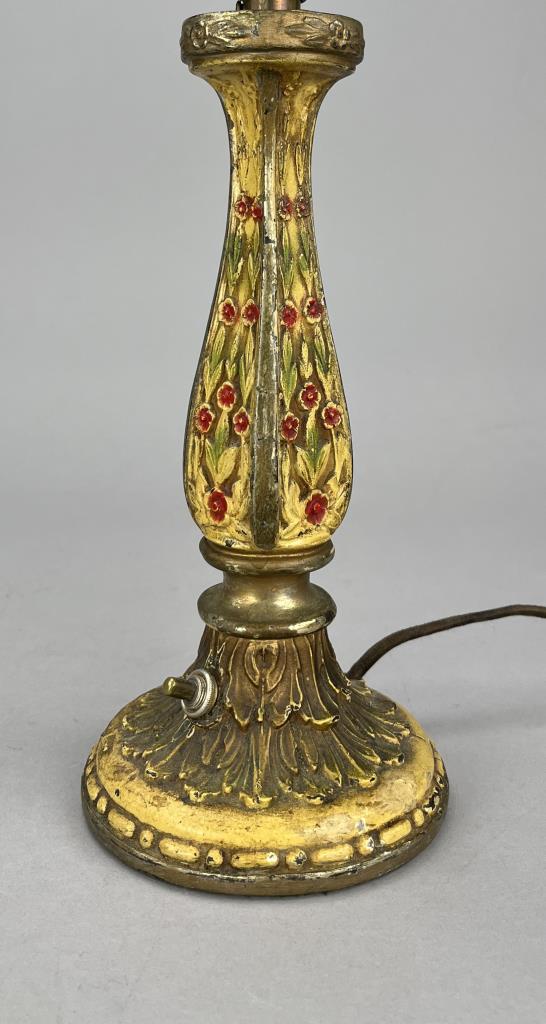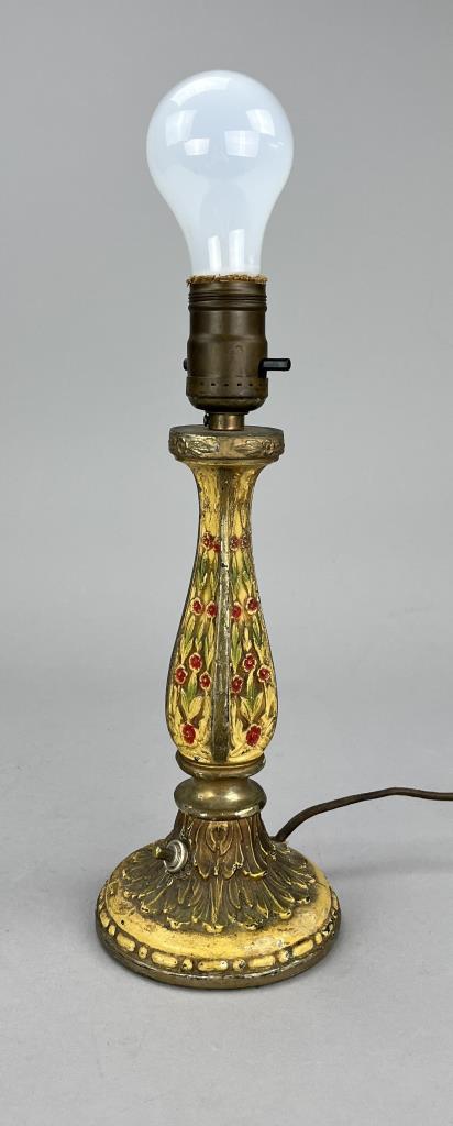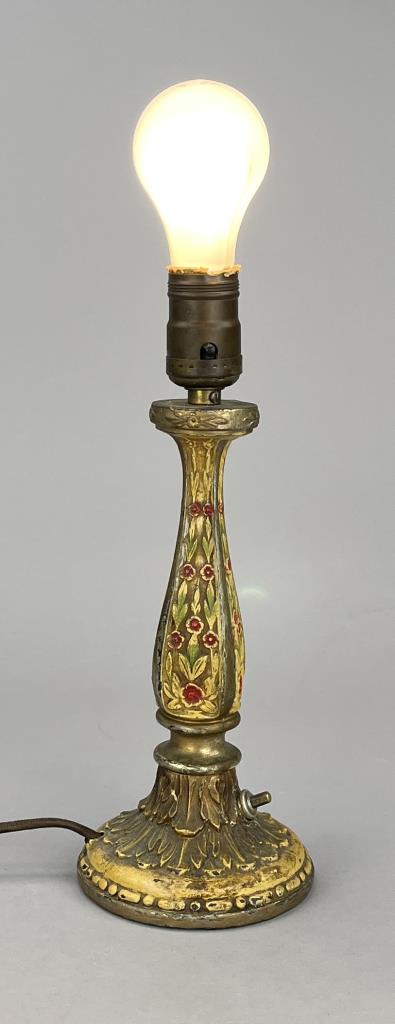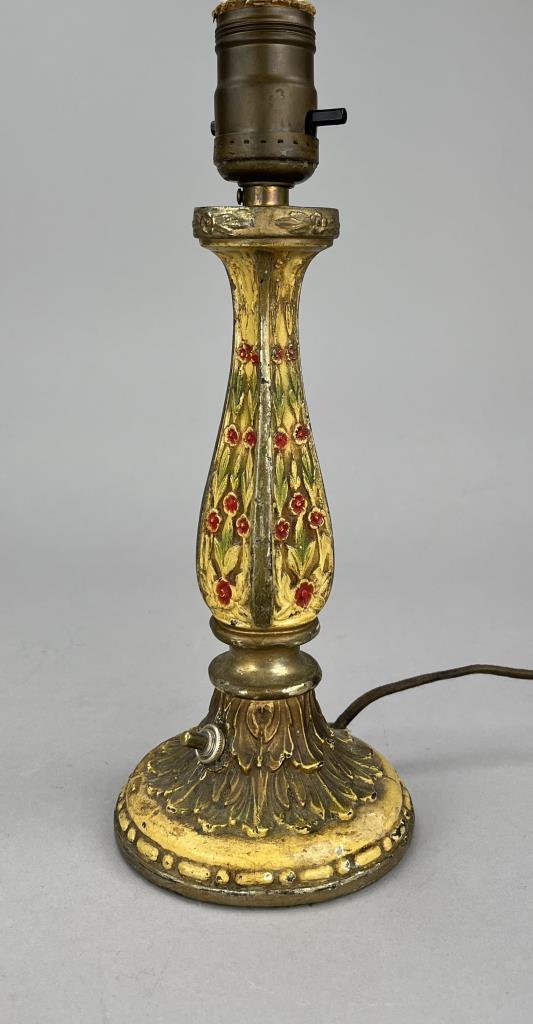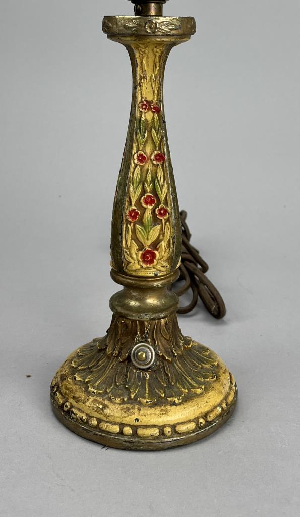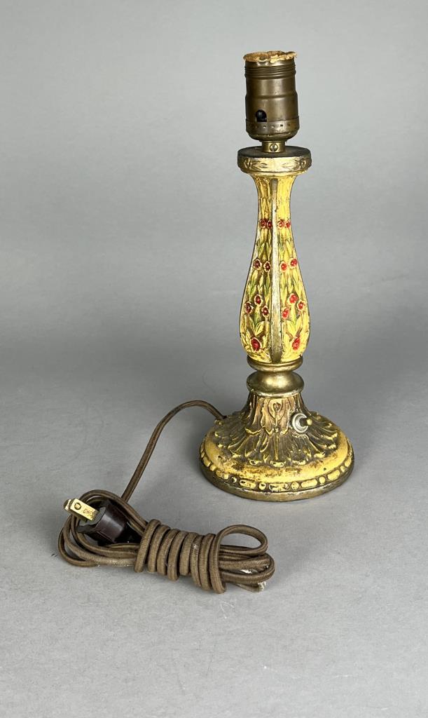Boudoir lamp, polychrome and gilt painted cast metal, switches on both the socket and the base, circa 1920s/1930s, approximately 11″ to top of socket. CONDITION: Working at time of cataloguing. SHIPPING: In-House Shipping is available on this item. PLEASE read our Shipping Policies and our full Terms and Conditions prior to bidding.
