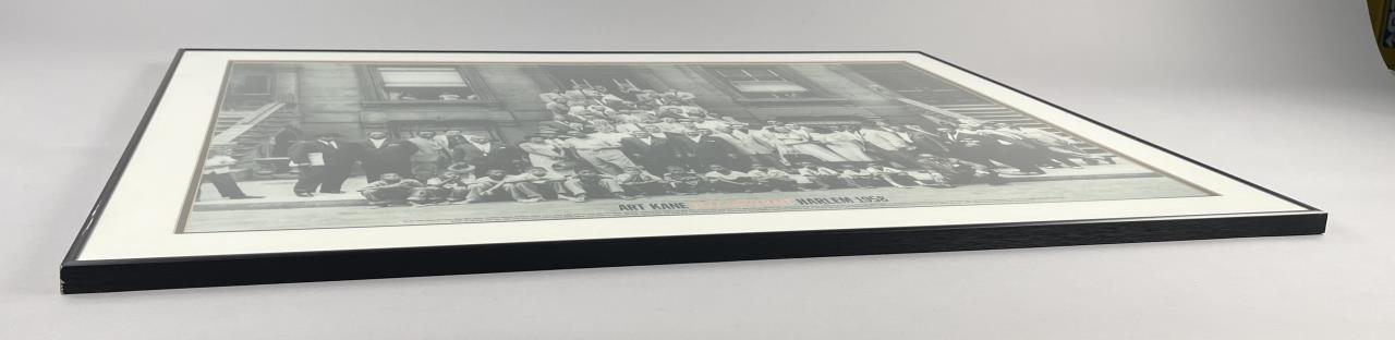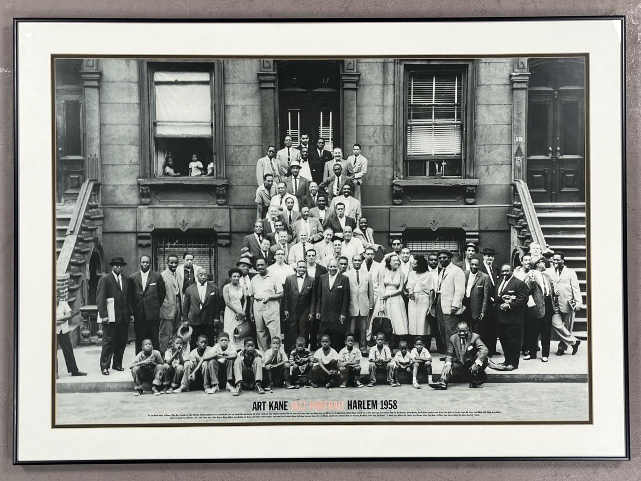 Framed poster of Art Kane’s (also known as Arthur Kanofsky) (American, 1925-1995), “A Great Day in Harlem”, iconic 1958 photograph for Esquire Magazine of 57 of the greats of jazz and the big band era, including among others Count Basie, Dizzy Gillespie, Art Farmer, Horace Silver, Art Blakely, Maxine Sullivan, Charles Mingus, Gene Krupa, Buster Bailey, Sunny Rollins, Coleman Hawkins, Mary Lou Williams, Thelonious Monk, Lester Young, and Roy Eldridge. Double matted and in a contemporary style black metal frame measuring 29″ x 39-7/8″. CONDITION: Not examined out of frame. SHIPPING: Local pick-up or third party shipping only for this lot. Please see the Shipping Policy for information on suggested shippers. We recommend the Pak Mail Store of Battle Creek to assist you. Please contact the shipper of your choice for shipping estimates on this lot. Refer to the Shipping section in our full Terms and Conditions for all information on shipping.