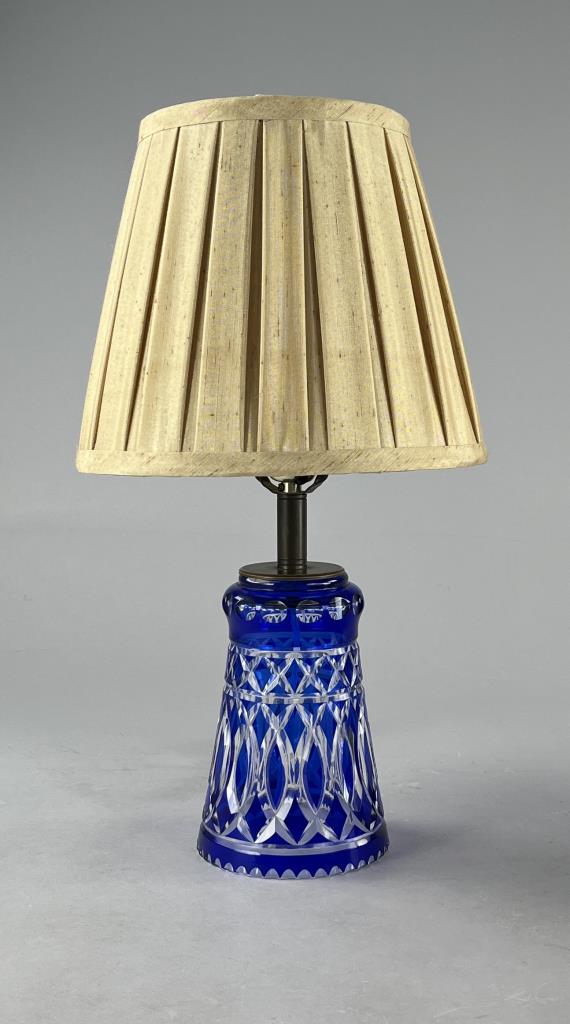 Pair of cobalt cut to clear crystal boudoir lamps, with inverted box pleated empire style lined fabric shades, 20-1/4″ to tops of finials. CONDITION: Working at time of cataloguing. SHIPPING: In-House Shipping is available on this item. PLEASE read our Shipping Policies and our full Terms and Conditions prior to bidding.