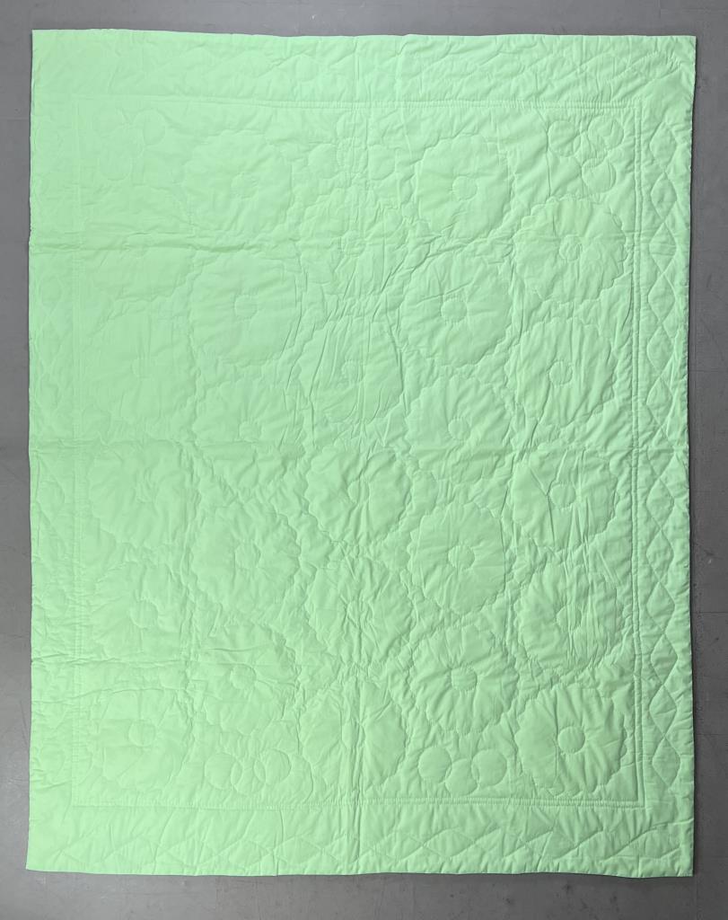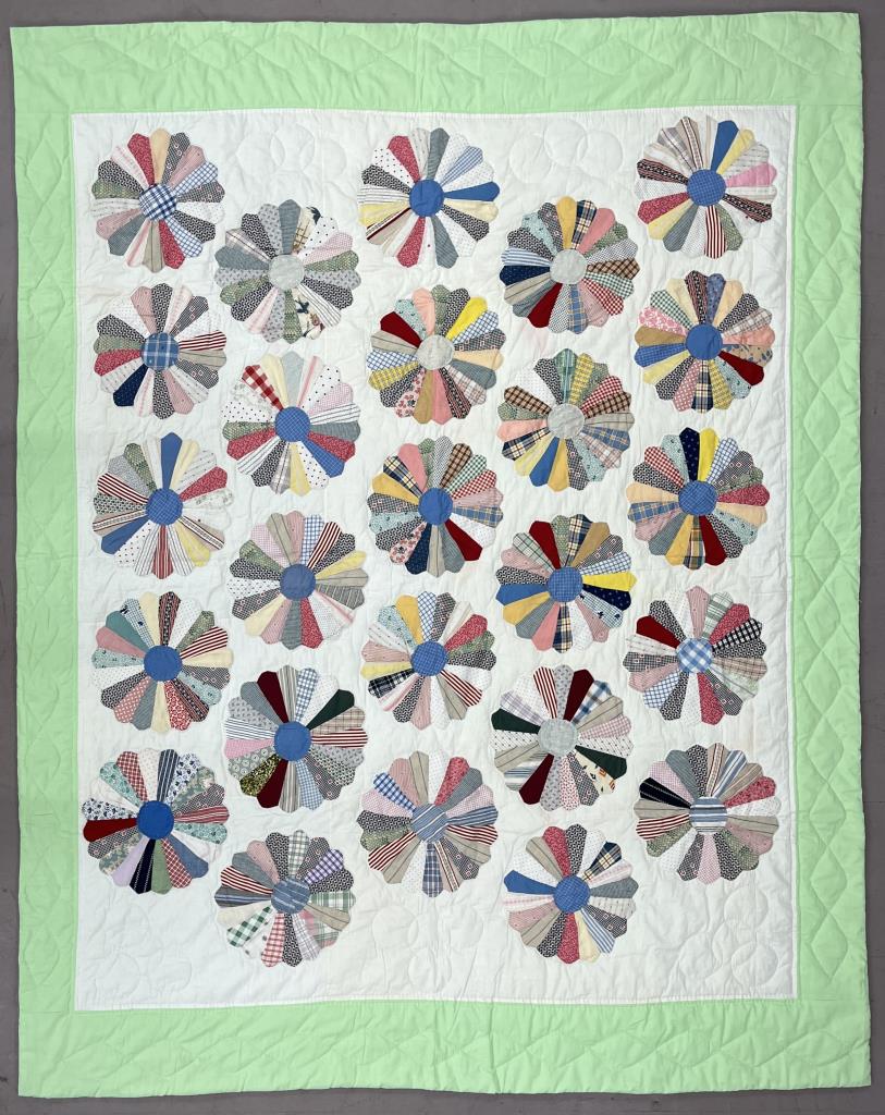 American quilt, in the “Dresden Plate” pattern, mostly hand stitched, late 20th Century, most likely 1970s or 1980s, approximately 83″ x 65″. CONDITION: Please Refer to Photos and Description for Condition. SHIPPING: In-House Shipping is available on this item. PLEASE read our Shipping Policies and our full Terms and Conditions prior to bidding.
