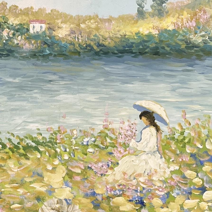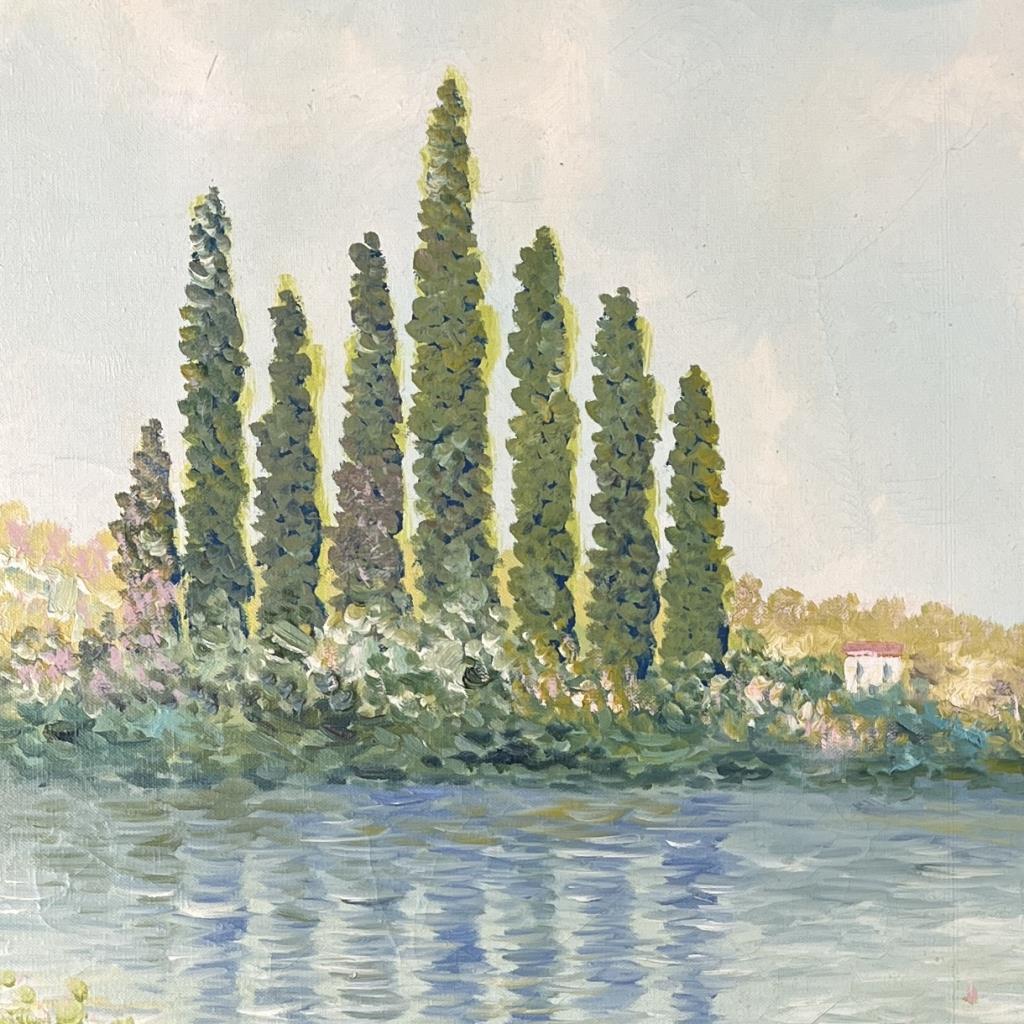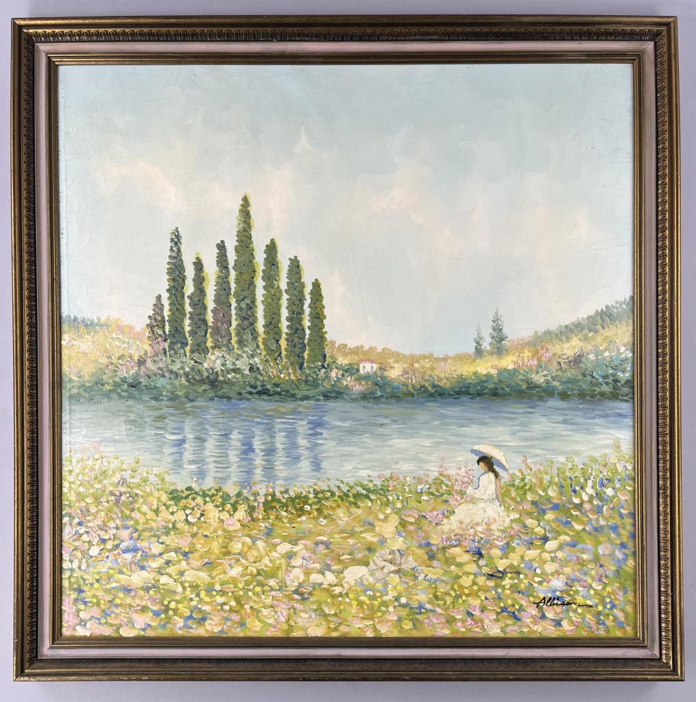Frank Allison (Scottish, b. 1929) oil painting on stretched canvas depicting a post impressionistic landscape scene, signed lower right and further information on back, circa 1960s / 1970s, in a gilt and painted wood frame measuring 33-5/8″ x 33-3/4″. CONDITION: Not examined out of frame. Some areas of minor craquelure throughout and some slight losses at edges on upper left side, please see photos. SHIPPING: Local pick-up or third party shipping only for this lot. Please see the Shipping Policy for information on suggested shippers. We recommend the Pak Mail Store of Battle Creek to assist you. Please contact the shipper of your choice for shipping estimates on this lot. Refer to the Shipping section in our full Terms and Conditions for all information on shipping.