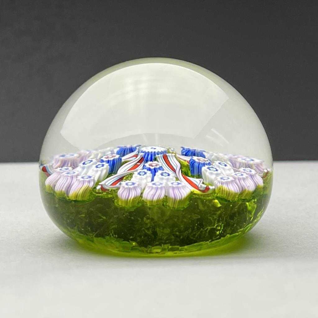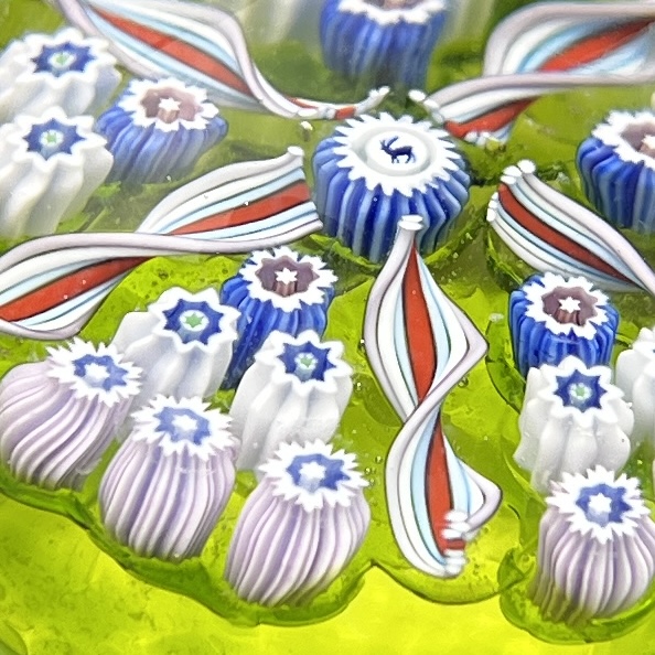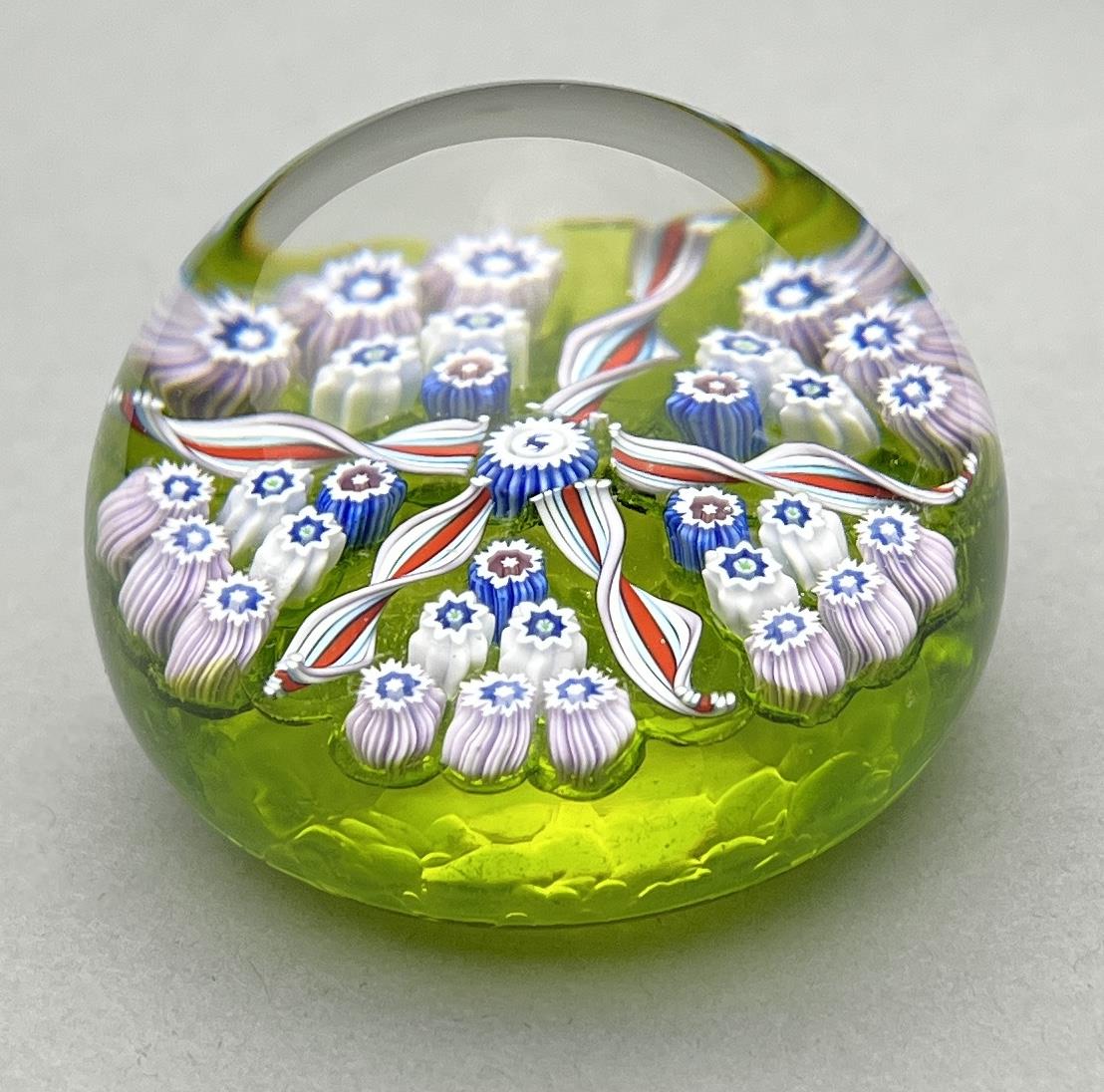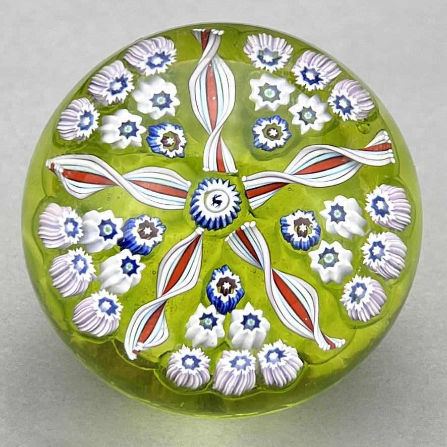 John Deacons (Scottish, b. 1950) concentric spoke and millefiori studio art glass mini paperweight, with a central deer silhouette cane surrounded by filigree twists creating five wedges of white, red, and blue canes above a light green ground, polished pontil mark, retains original label, 1-7/8″ (D). CONDITION: Please Refer to Photos and Description for Condition. SHIPPING: In-House Shipping is available on this item. PLEASE read our Shipping Policies and our full Terms and Conditions prior to bidding.
