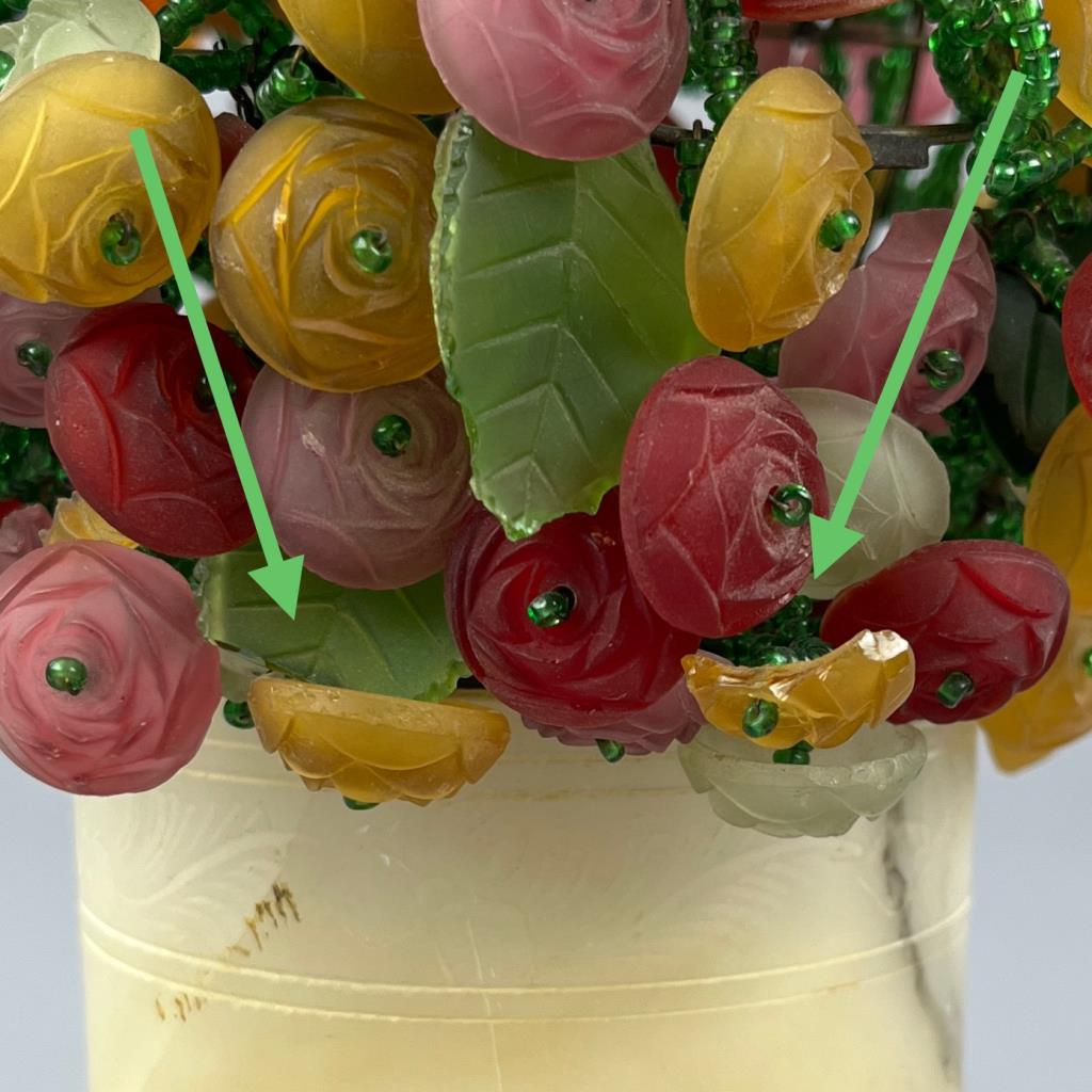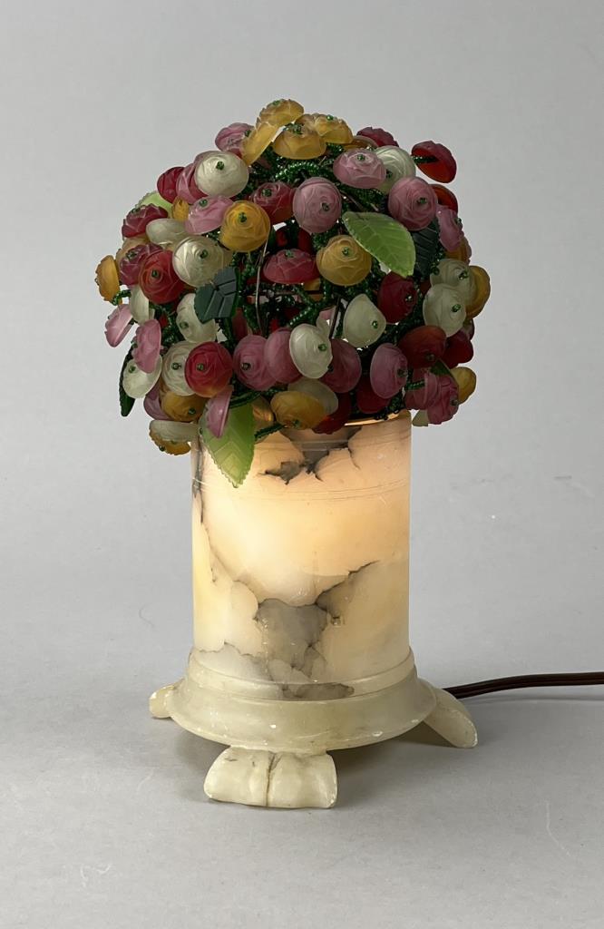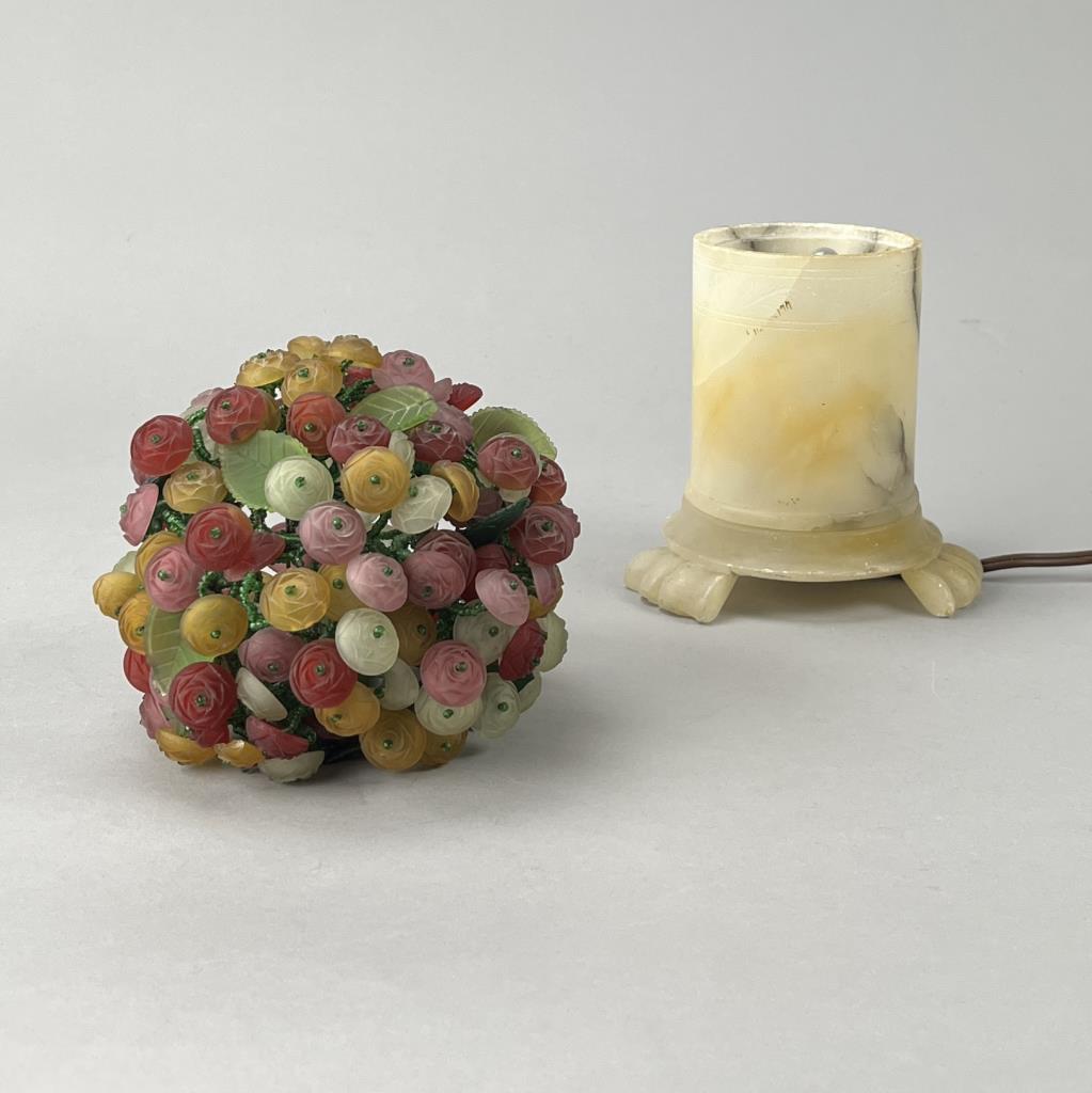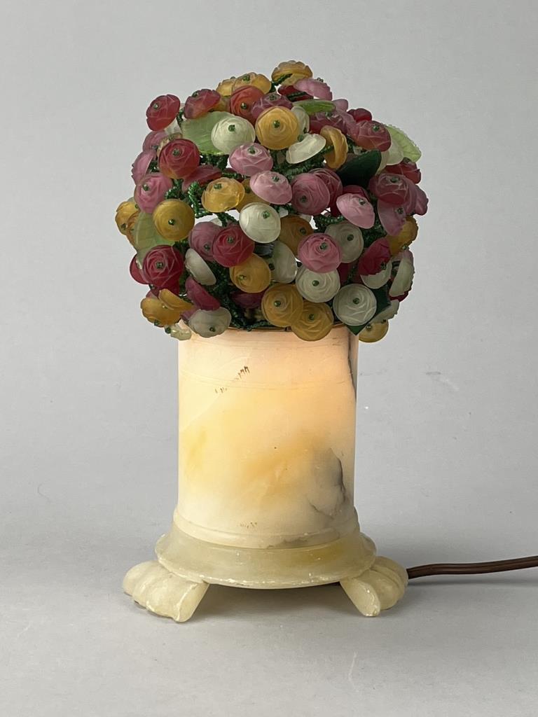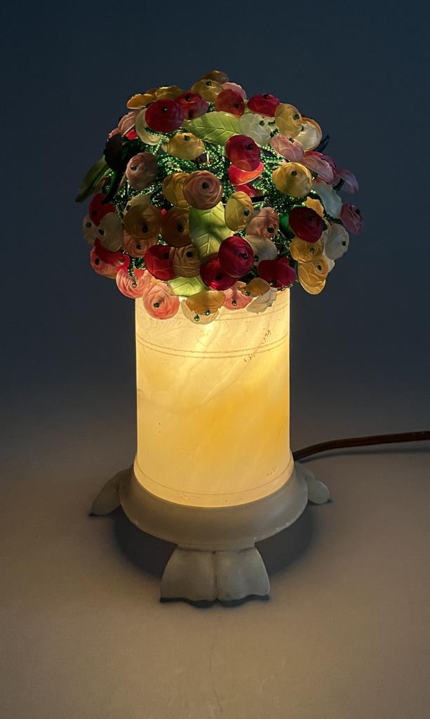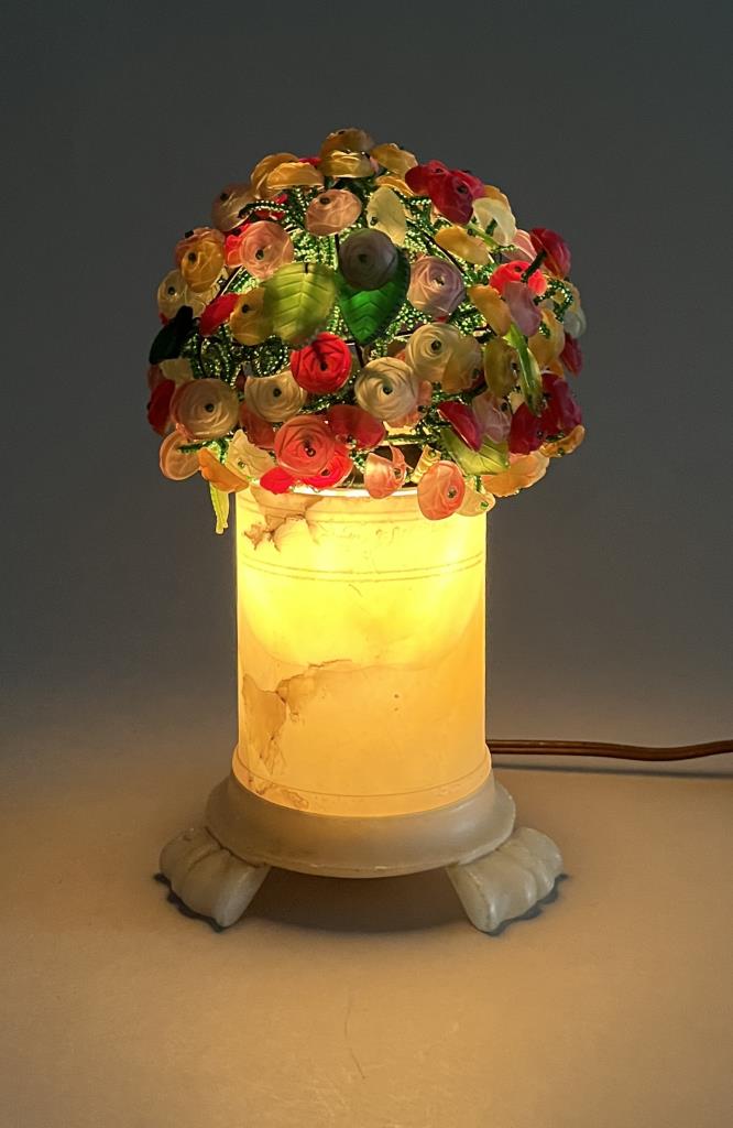 Czech art glass boudoir lamp, beaded and multi-colored glass flowers and leaves atop a turned and carved cylindrical alabaster base, circa 1920s / 1930s, approximately 9-1/2″ (H). CONDITION: Working at time of cataloguing. At least two of the glass leaves are broken, several of the glass flowers are either broken or chipped, three flowers have become detached but are present, and there is some minor chipping to the alabaster base, please see photos. SHIPPING: In-House Shipping is available on this item. PLEASE read our Shipping Policies and our full Terms and Conditions prior to bidding.