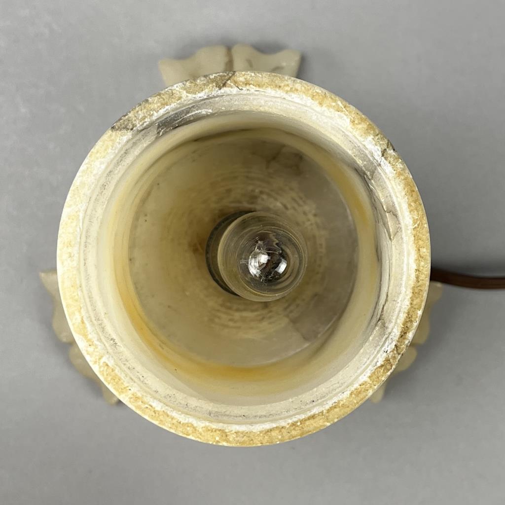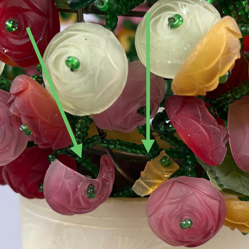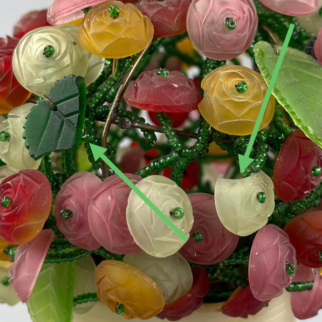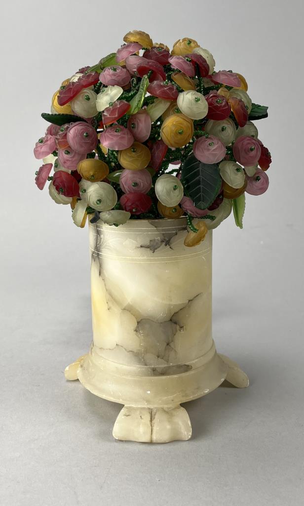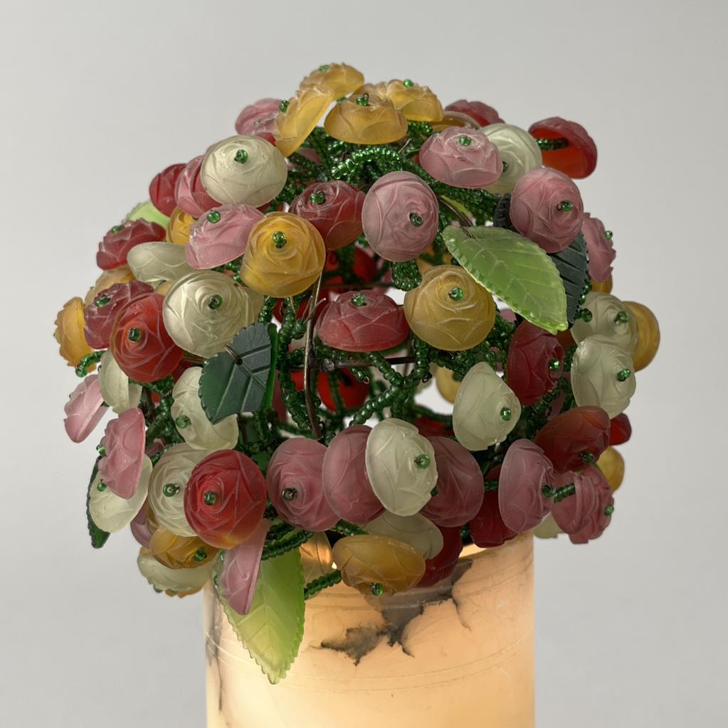 Czech art glass boudoir lamp, beaded and multi-colored glass flowers and leaves atop a turned and carved cylindrical alabaster base, circa 1920s / 1930s, approximately 9-1/2″ (H). CONDITION: Working at time of cataloguing. At least two of the glass leaves are broken, several of the glass flowers are either broken or chipped, three flowers have become detached but are present, and there is some minor chipping to the alabaster base, please see photos. SHIPPING: In-House Shipping is available on this item. PLEASE read our Shipping Policies and our full Terms and Conditions prior to bidding.
