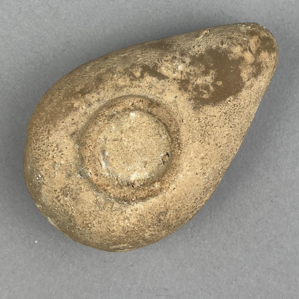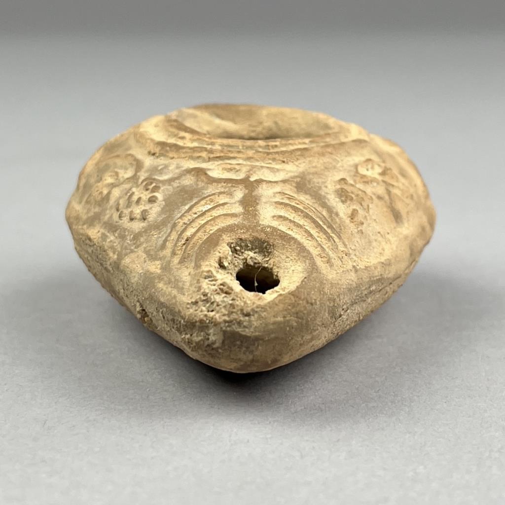 Ancient Byzantine oil lamp, depicting a seven branch/flame temple menorah symbolising divine light, creation, and wisdom, molded earthenware, most likely circa 2nd-6th Century C.E., 3-1/2″ (L). Provenance: ex-private East Lansing, Michigan, USA collection of antiquities and ancient relics. CONDITION: Please Refer to Photos and Description for Condition. SHIPPING: In-House Shipping is available on this item. PLEASE read our Shipping Policies and our full Terms and Conditions prior to bidding.