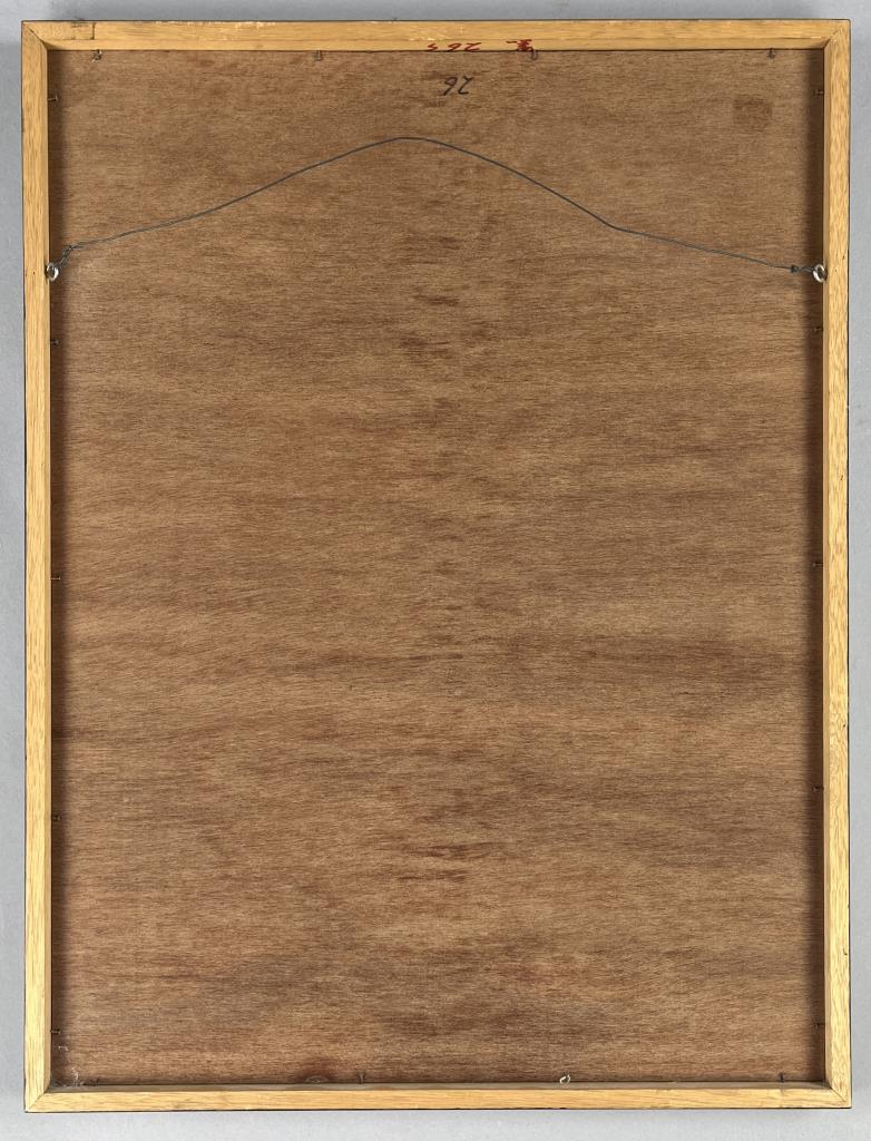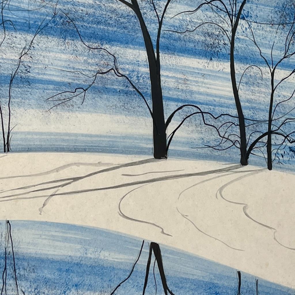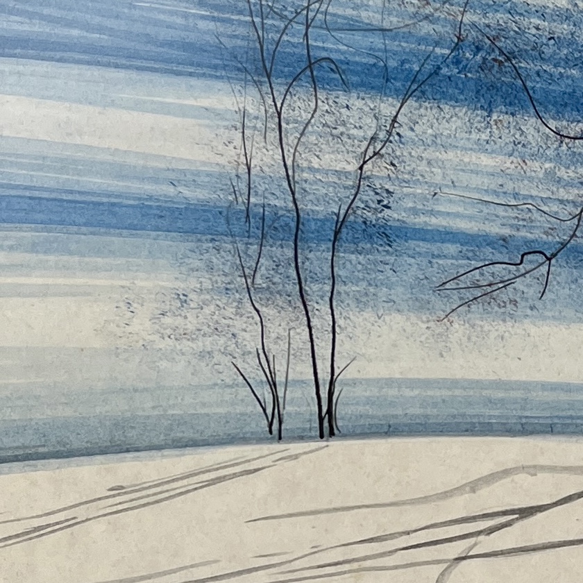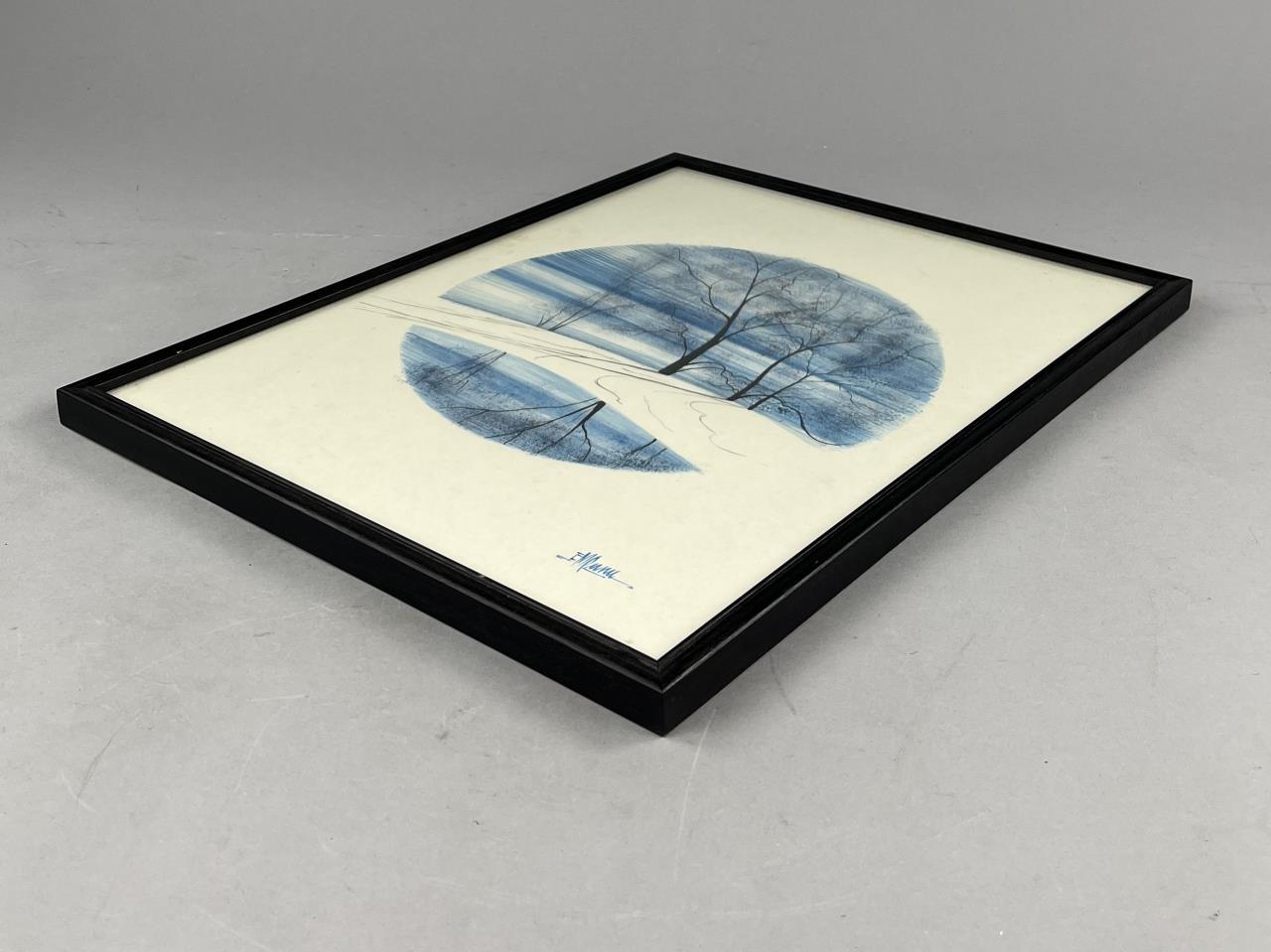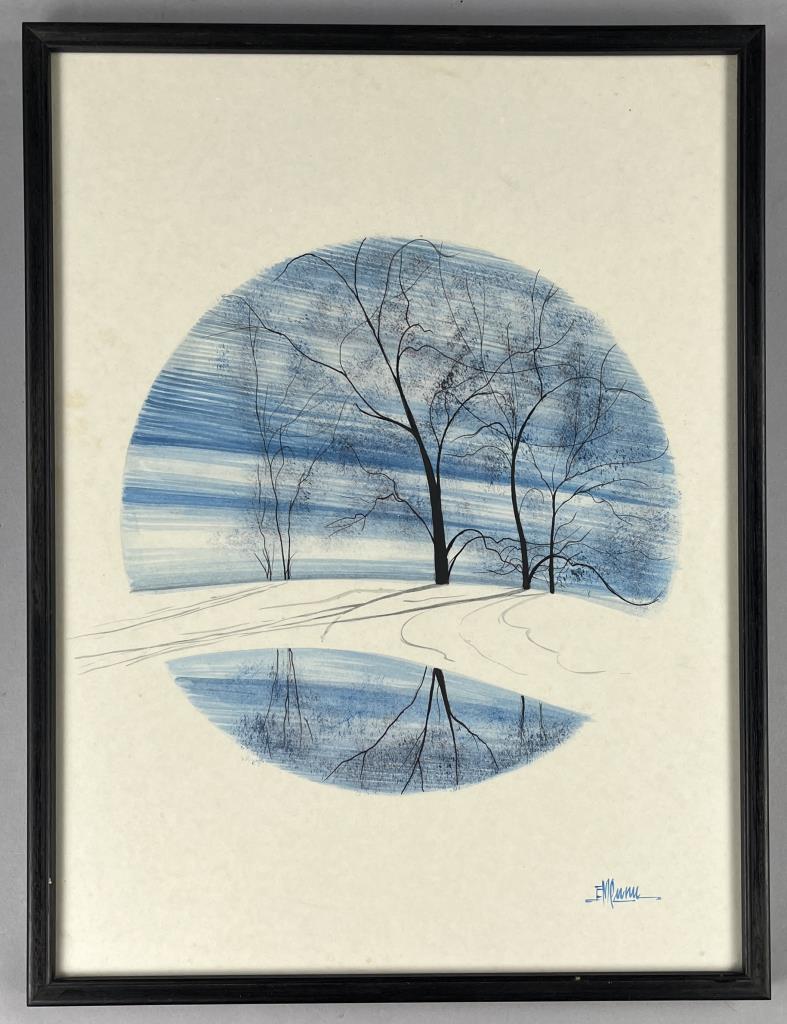 Ink and watercolor painting, depicting a moon lite winter landscape, artist signed lower right, in a black wood frame measuring 20-3/4″ x 15-3/4″. CONDITION: Not examined out of frame. SHIPPING: In-House Shipping is available on this item. PLEASE read our Shipping Policies and our full Terms and Conditions prior to bidding.