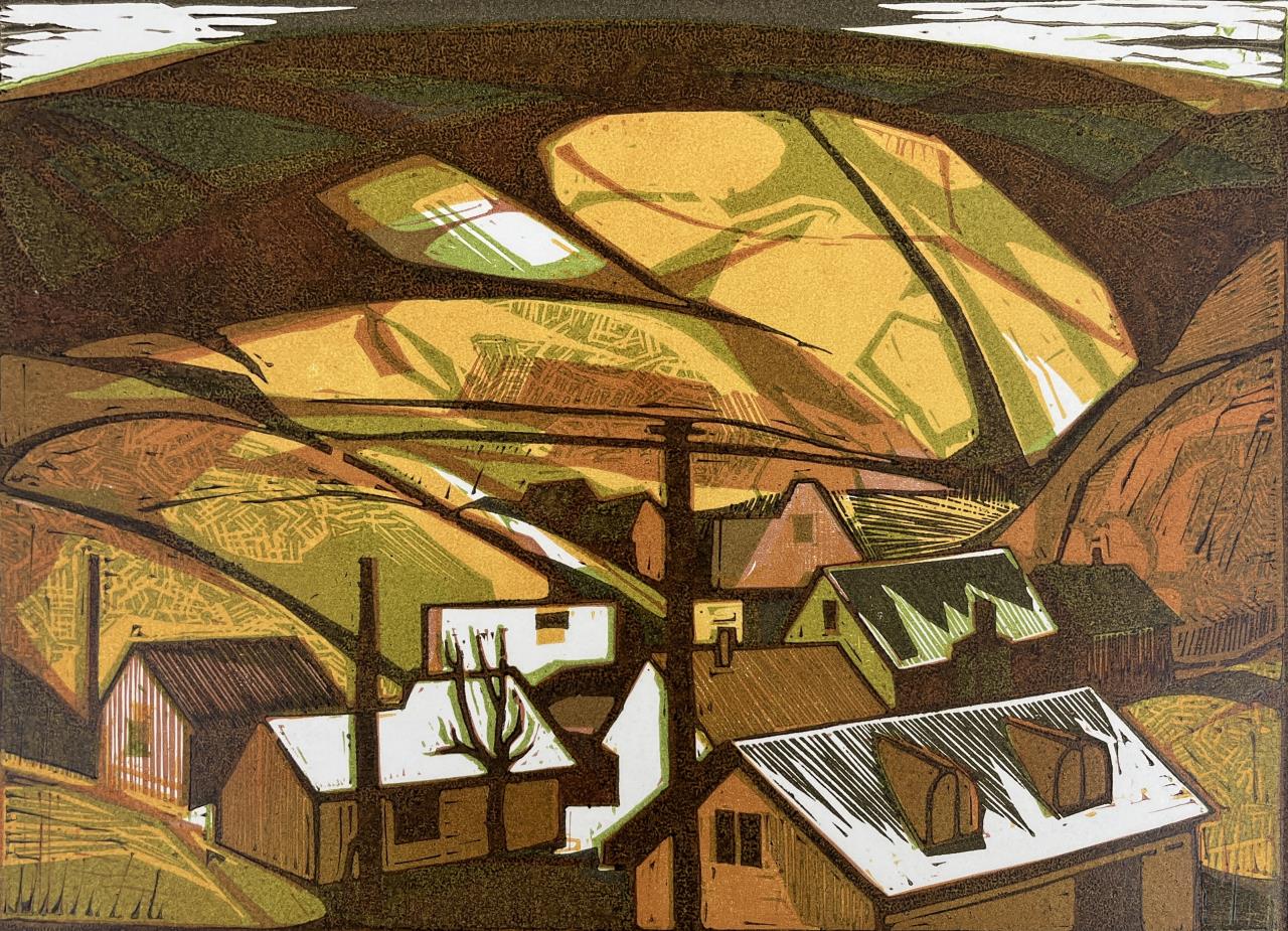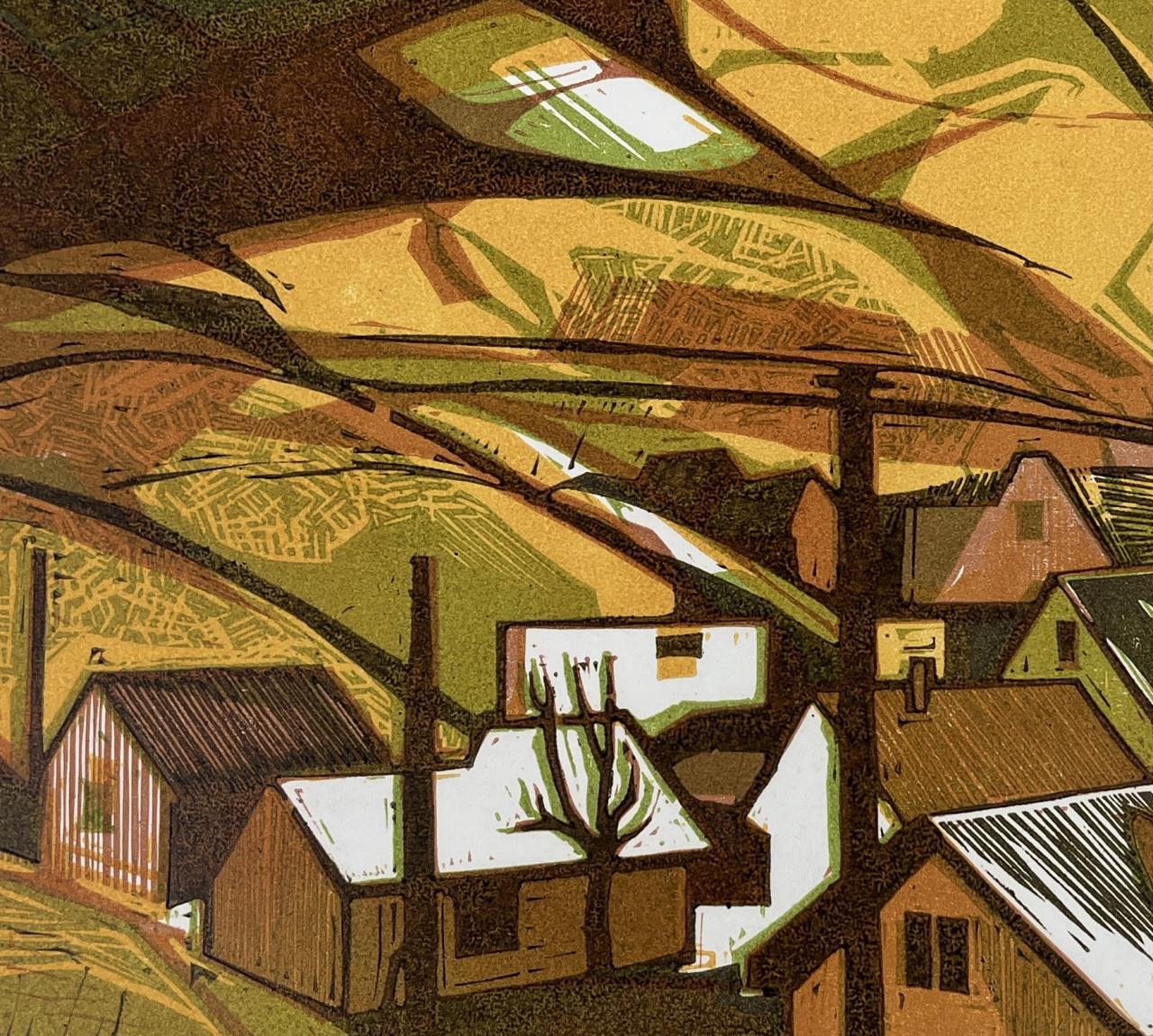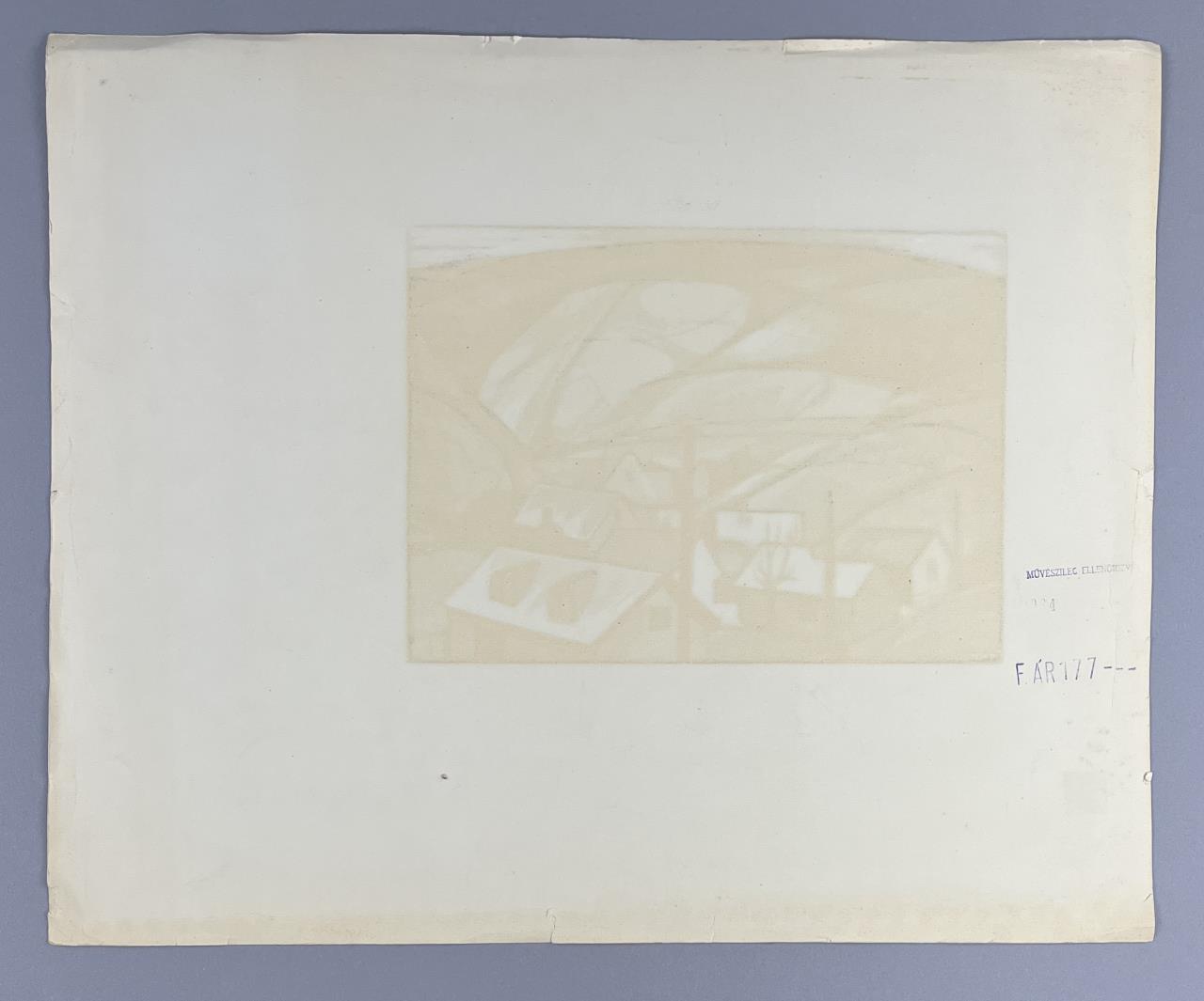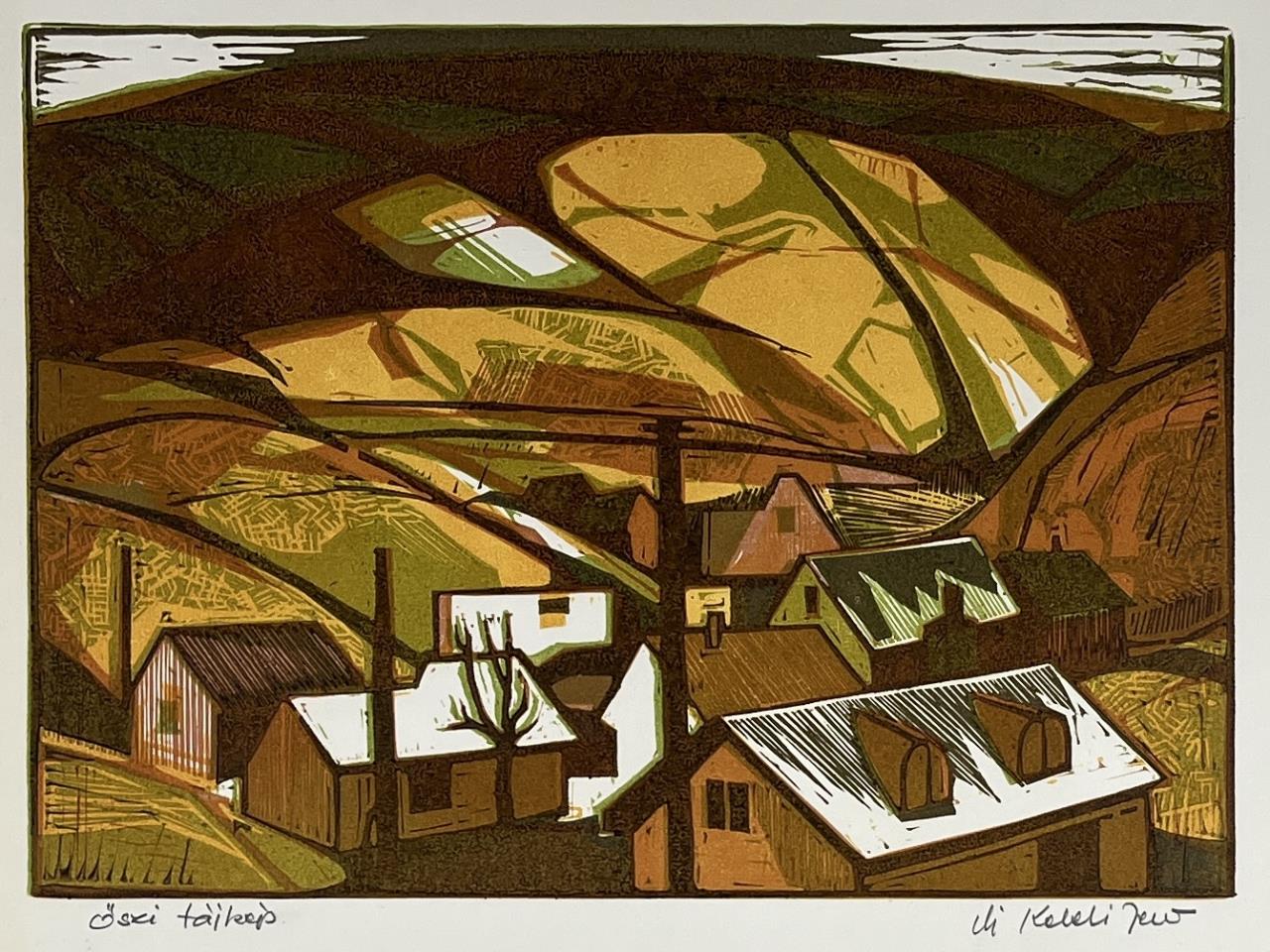 Uj Kobeli Tew (Hungarian, born 1956) , also know as “Zoltan Joo”, block print, titled “Oski taikep,” or “Autumn Landscape”, titled in pencil lower left, signed in pencil lower right, image size 7-7/8″ x 10-7/8″, overall paper size 16-1/2″ x 20″. CONDITION: Some tears and creasing on edges, some foxing and staining in margins, please see photos. SHIPPING: In-House Shipping is available on this item. PLEASE read our Shipping Policies and our full Terms and Conditions prior to bidding.