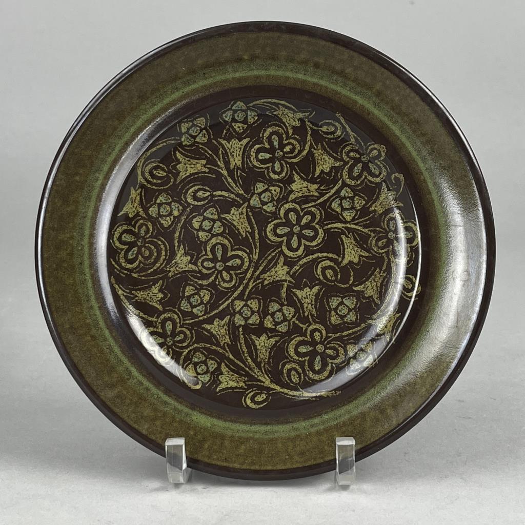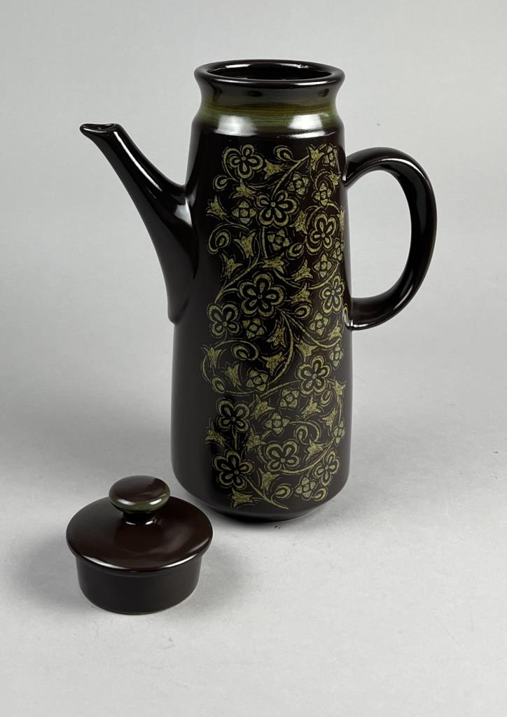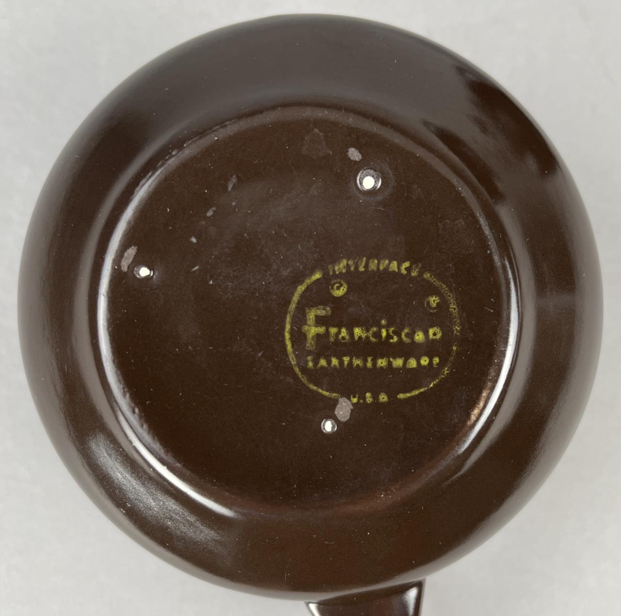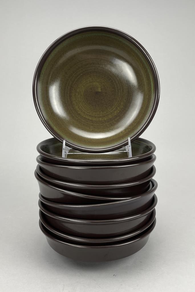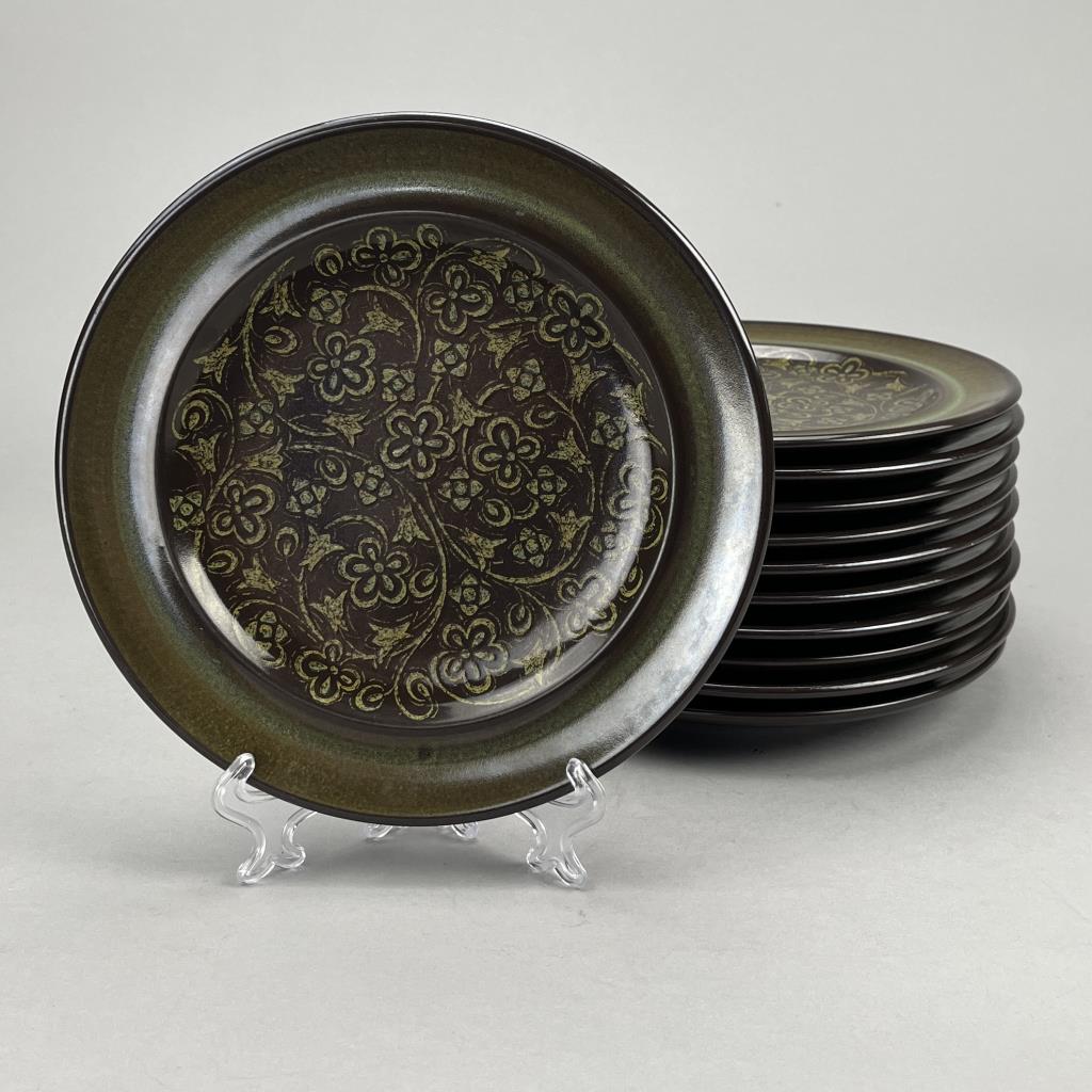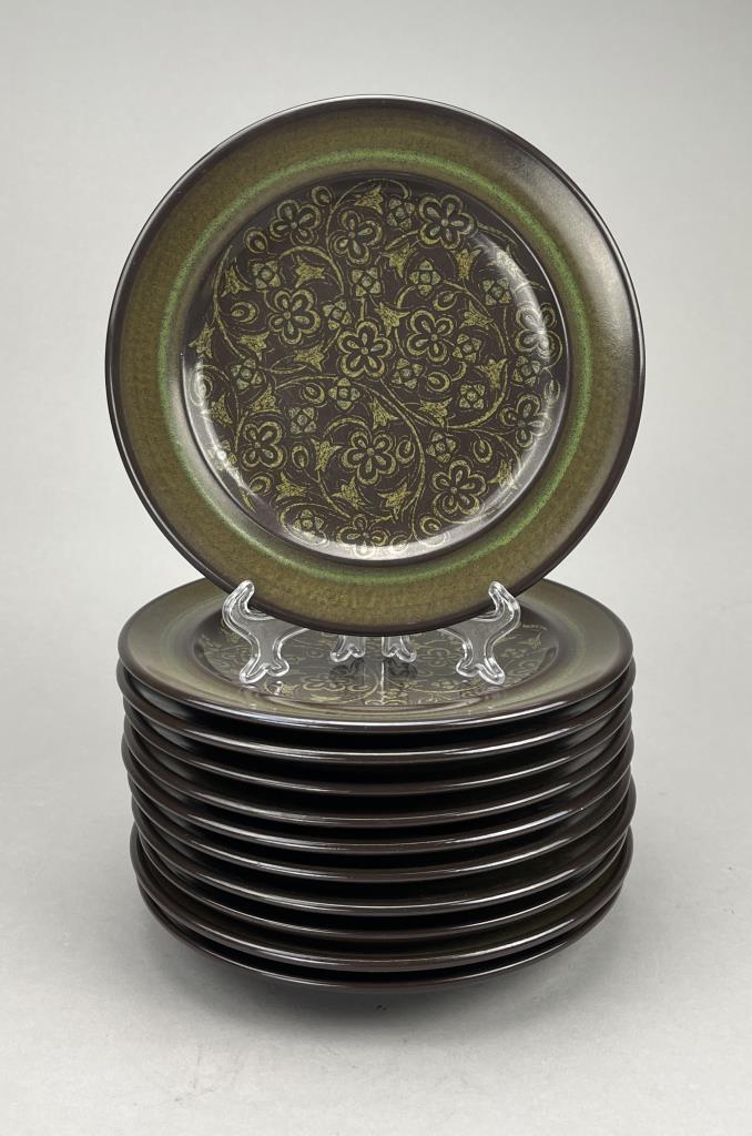 70 Piece set of Franciscan (USA) china, or dinnerware, in the “Madeira” pattern, first introduced in 1967 and discontinued in 1983, includes: (12) 10-1/2″ dinner plates; (11) 8-1/2″ salad plates; (8) 6-3/4″ bread and butter plates; (9) 7″ soup/cereal bowls; (10) flat cups; (13) sauces; (1) 9″ round open vegetable bowl; (1) 1/4 lb., covered butter dish; (1) salt and pepper set; (1) coffee pot; (2) cream pitchers; and (1) sugar bowl with lid. CONDITION: There is one very small chip on the edge of one plate. SHIPPING: In-House Shipping is available on this item. PLEASE read our Shipping Policies and our full Terms and Conditions prior to bidding.