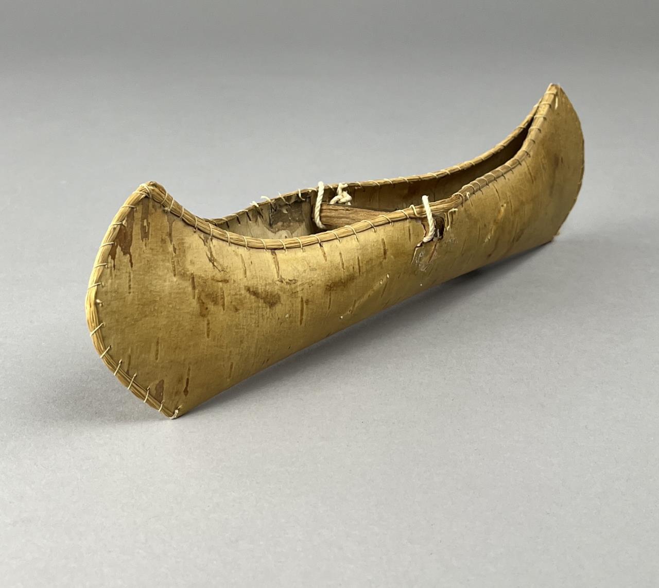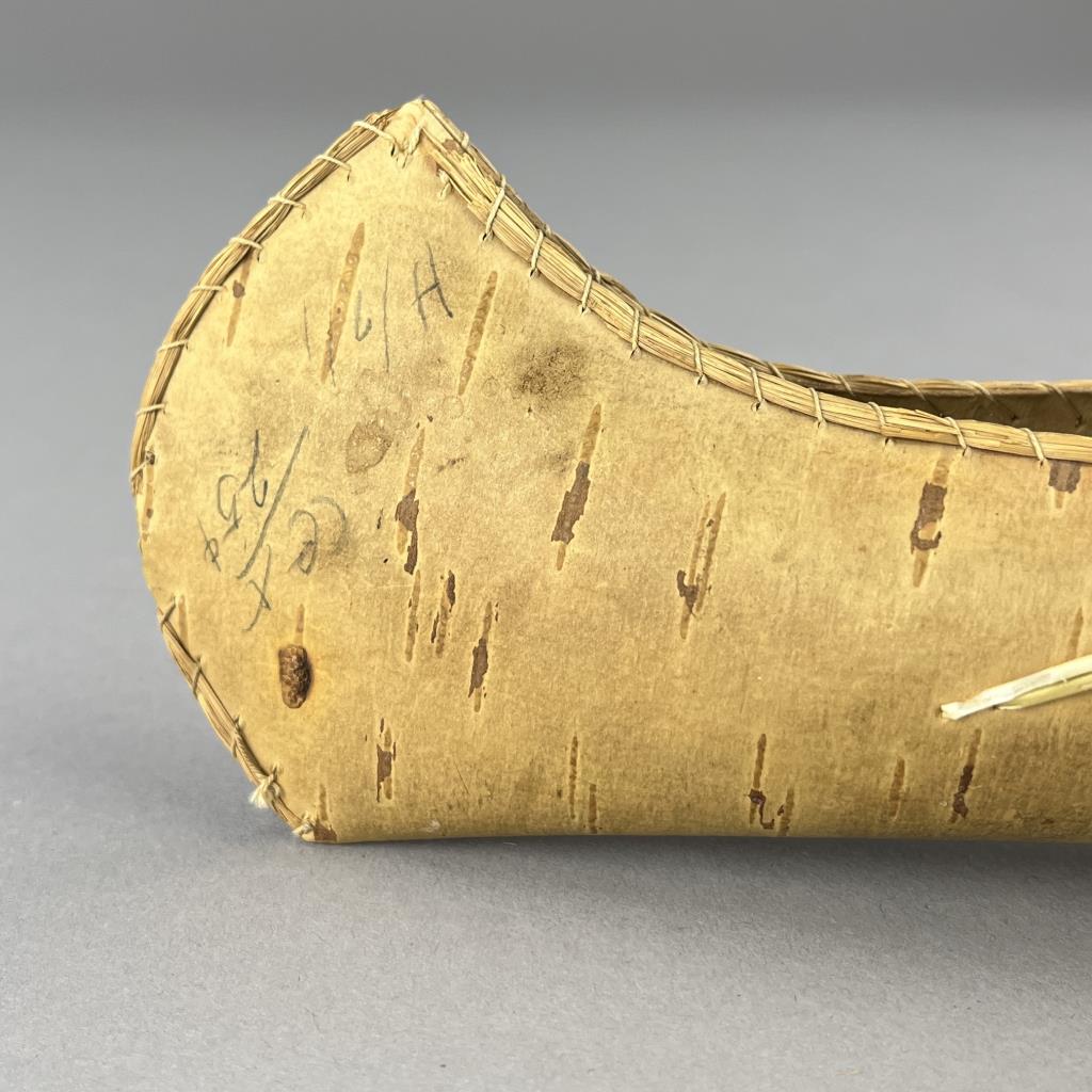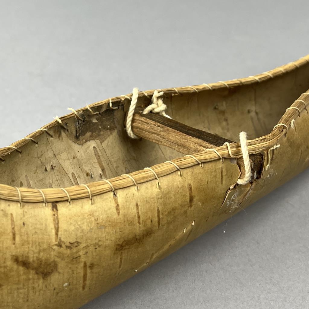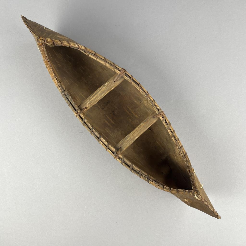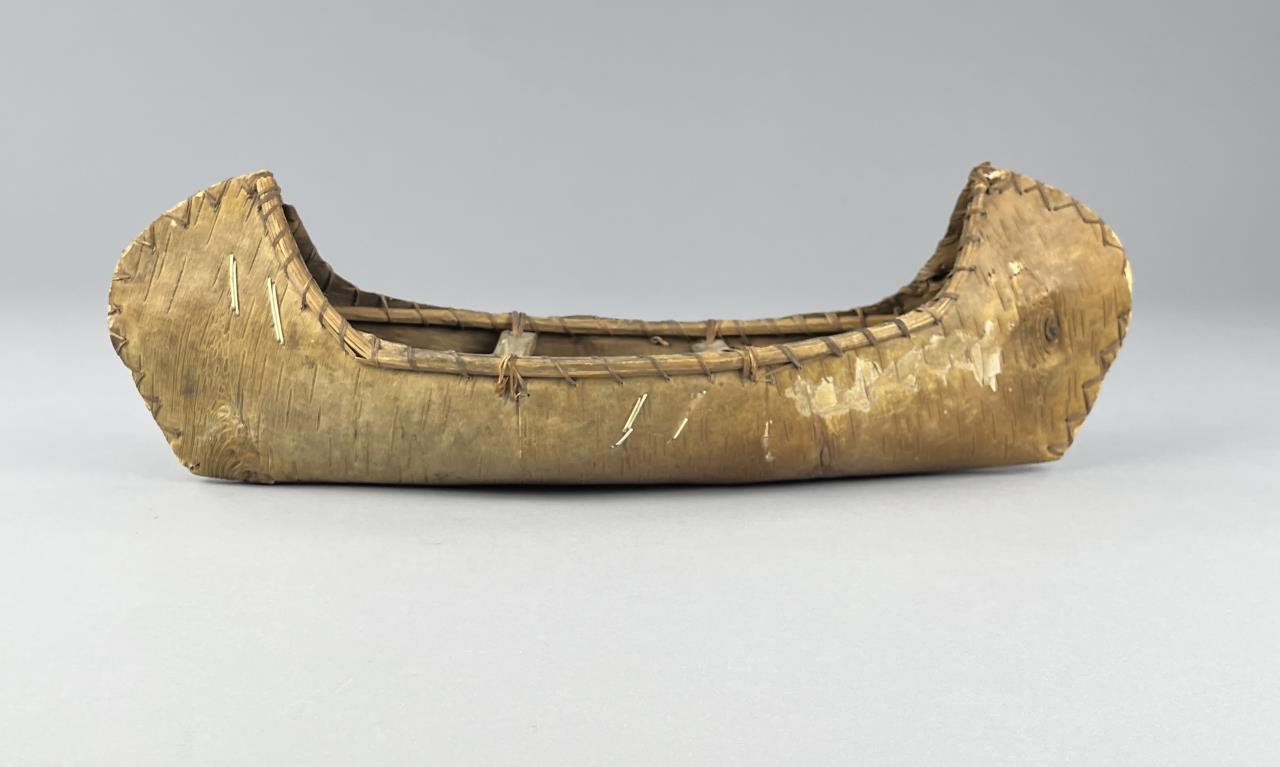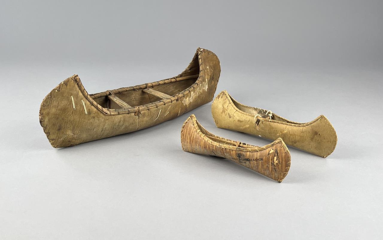 Three Native American style birch bark canoe models or toys, two with porcupine quill decoration, early to mid 20th Century, the largest measuring approximately 16-1/2″ (L). CONDITION: One cracked at center, and two with pencil markings, please see photos. SHIPPING: In-House Shipping is available on this item. PLEASE read our Shipping Policies and our full Terms and Conditions prior to bidding.