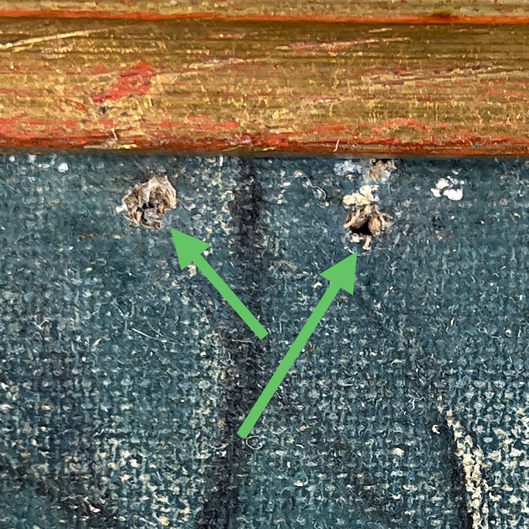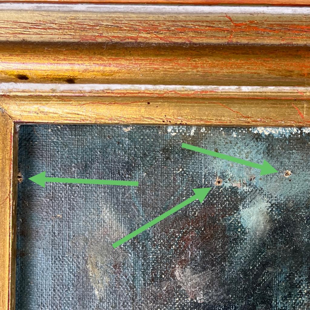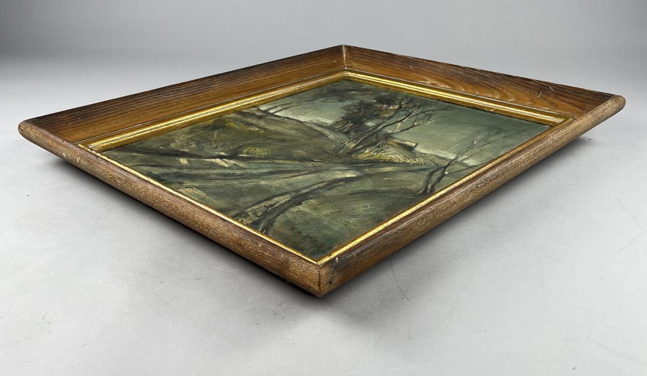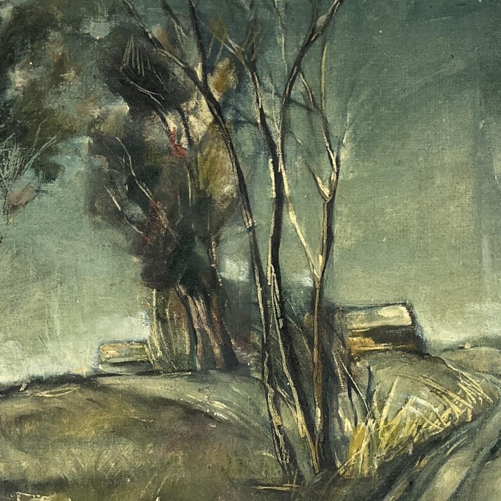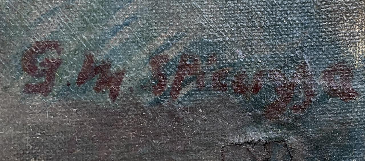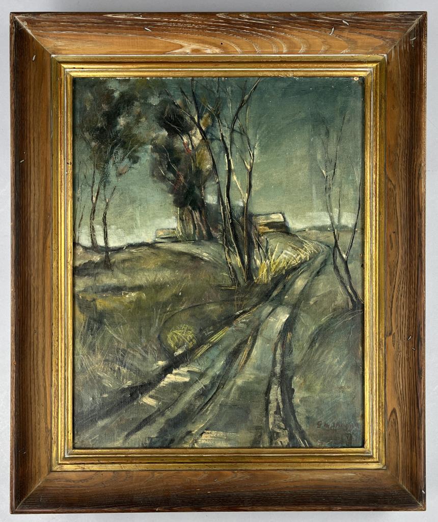 Landscape painting on canvas mounted to board, by Giacomo Mercurio Spicuzza (American, 1901-1987), born in Detroit Michigan, studied at Cass Technical High School and the John Wicker School of Fine Arts both in Detroit, painted for the WPA and a member of the Scarab Club, signed “G. M. Spicuzza” lower right, in a stained and gilt oak frame measuring 28-3/4″ x 24″. CONDITION: Older repair lower right, and some pin holes at edges. SHIPPING: In-House Shipping is available on this item. PLEASE read our Shipping Policies and our full Terms and Conditions prior to bidding.
