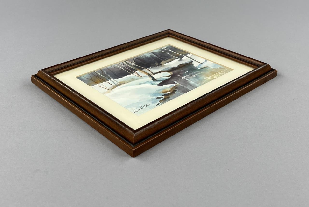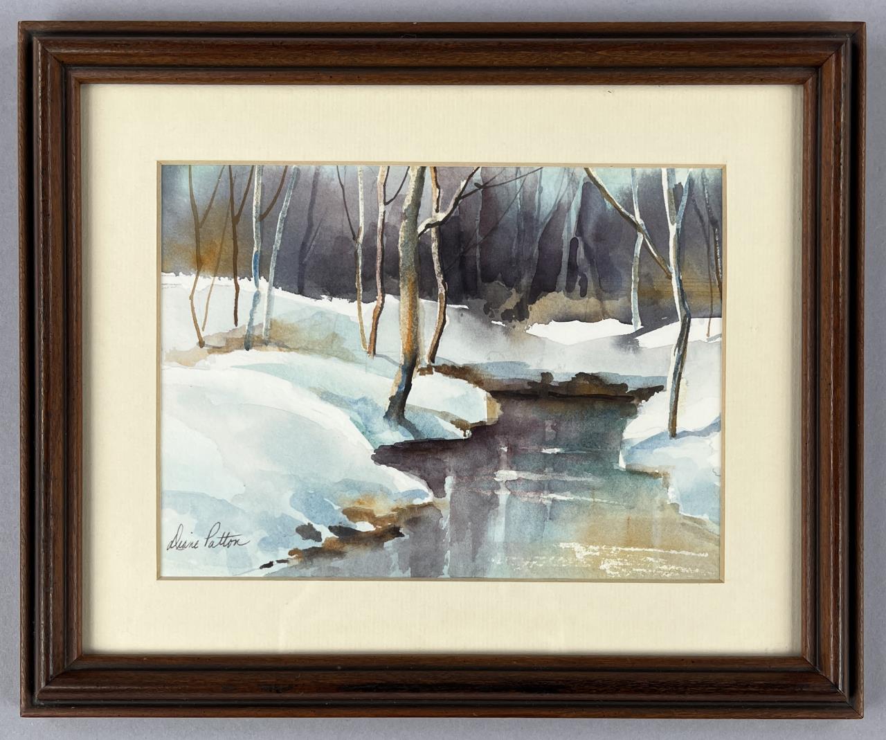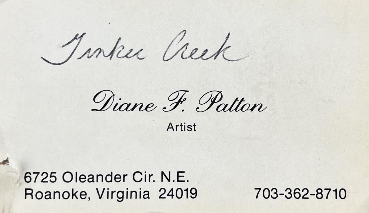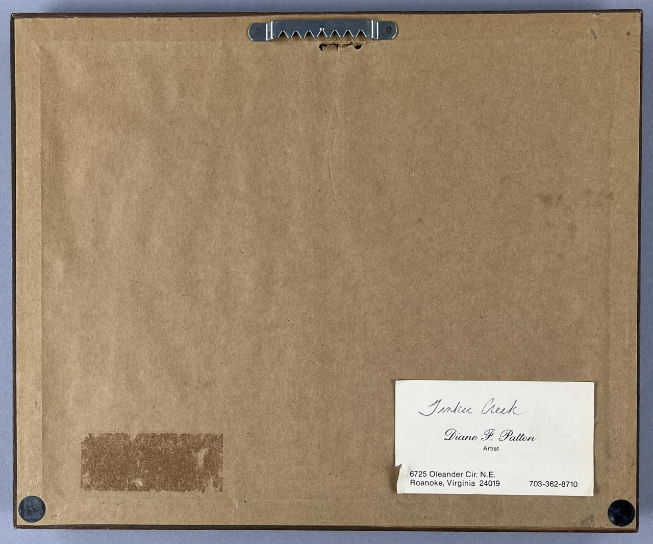 Diane Fraser Patton (Roanoke, Virginia artist, active late 20th/early 21st Century), watercolor painting titled “Tinker Creek”, signed lower left, title and artist information on back, in a stained wood frame measuring 9-1/4″ x 11-1/4″. CONDITION: Not examined out of frame. SHIPPING: In-House Shipping is available on this item. PLEASE read our Shipping Policies and our full Terms and Conditions prior to bidding.