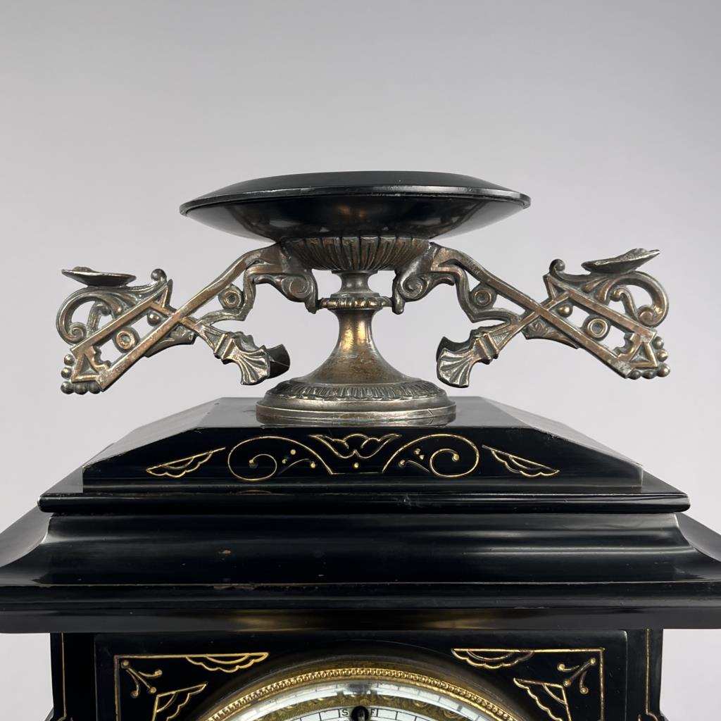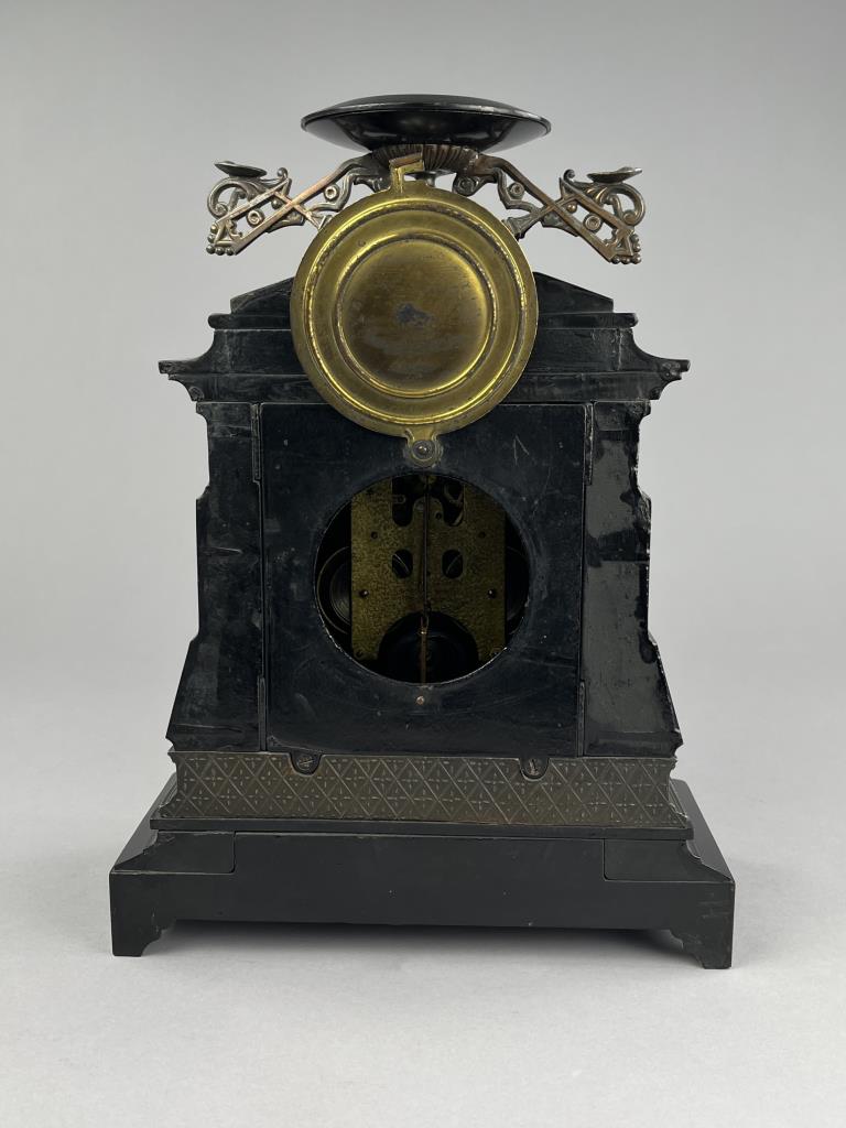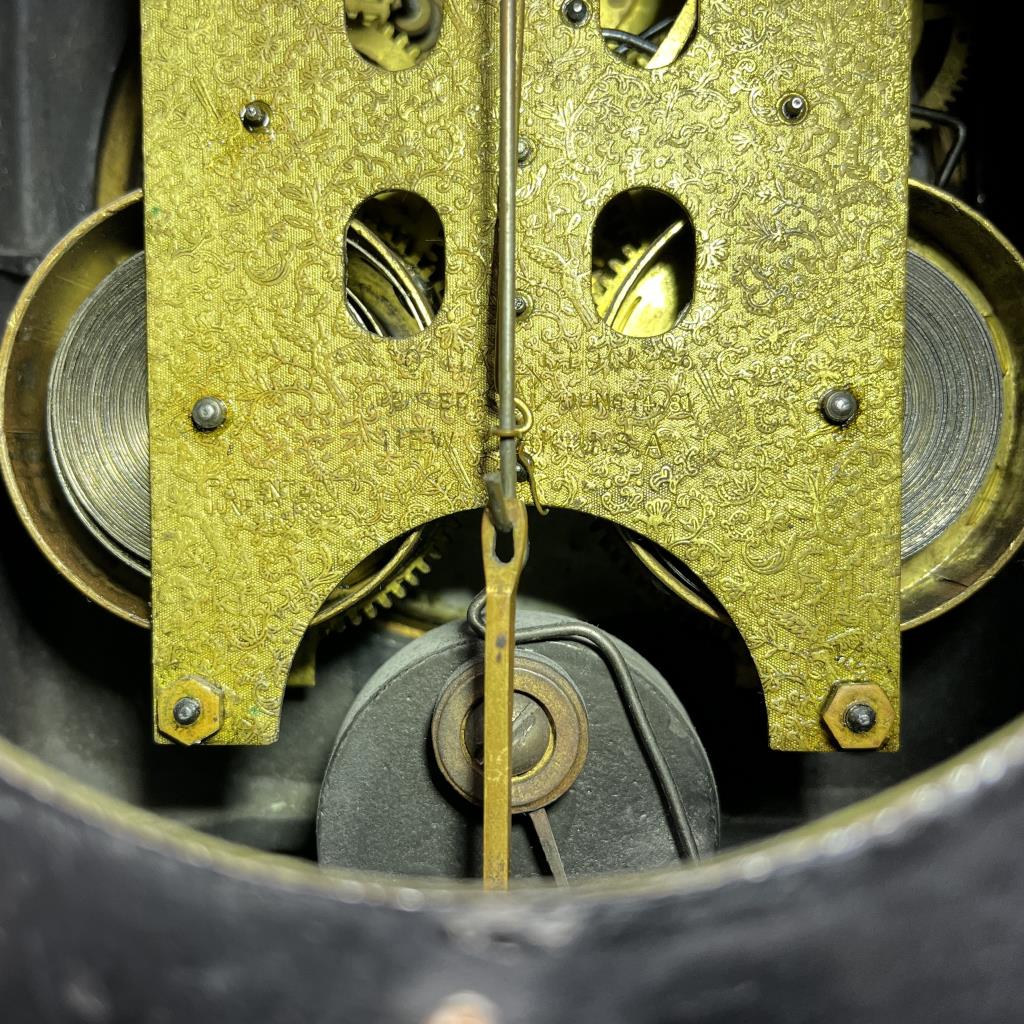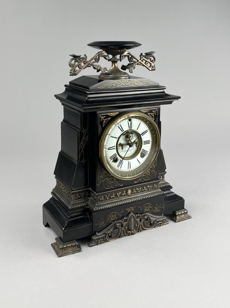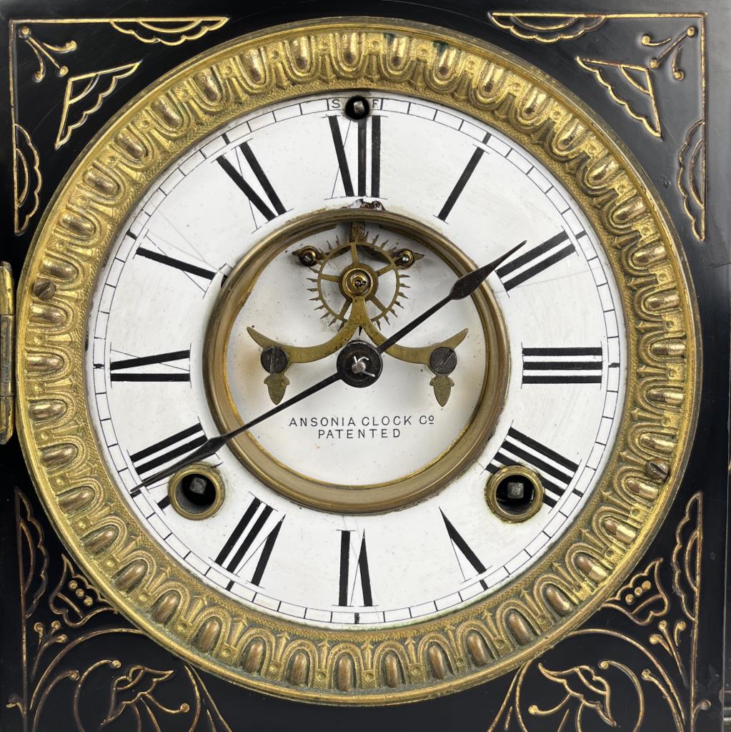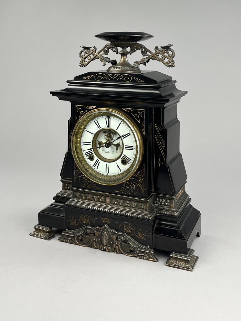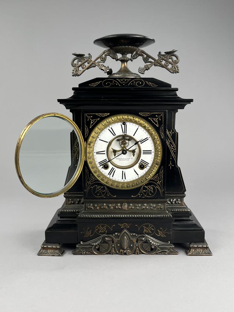 Antique Ansonia (New York, USA) “Nile” mantle clock, black enameled iron case with gilt ornamentation, 8-day spring-driven time and strike movement with visible brocot type escapement, signed on the dial and movement, late 19th century, 5-9/16″ x 13-1/4″ x 16-1/4″, includes key. CONDITION: Not fully working at time of cataloguing, running and keeping good time but not striking. Cracks and chips to dial, please see photos. SHIPPING: In-House Shipping is available on this item. PLEASE read our Shipping Policies and our full Terms and Conditions prior to bidding.