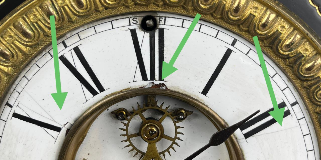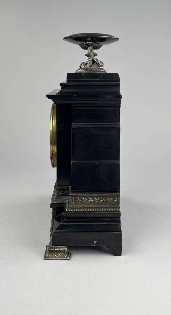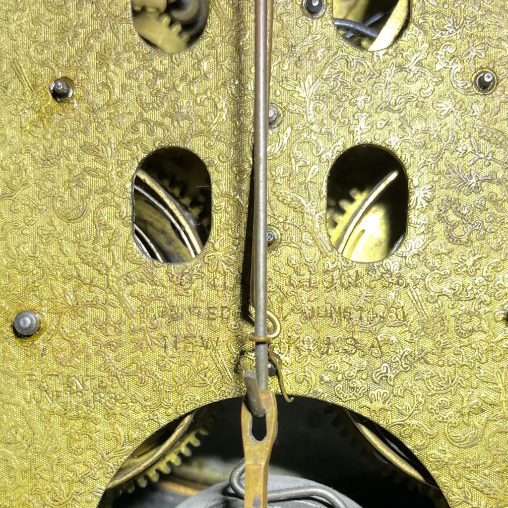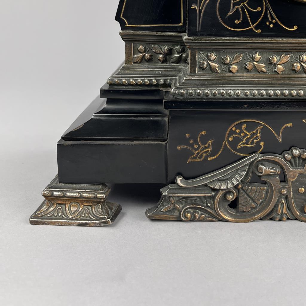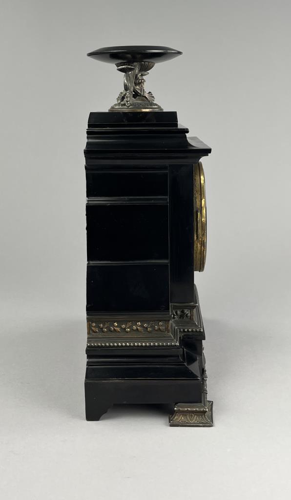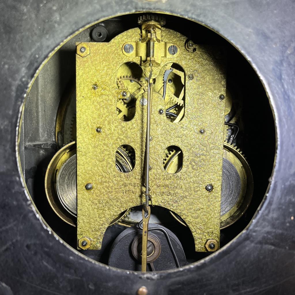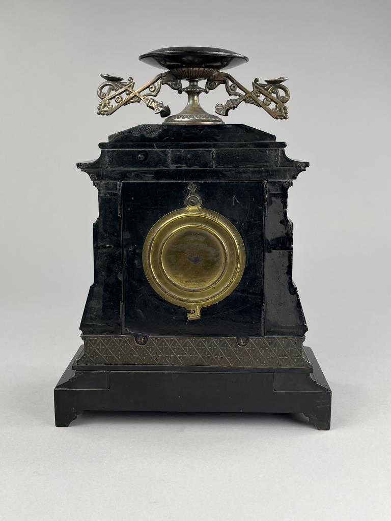 Antique Ansonia (New York, USA) “Nile” mantle clock, black enameled iron case with gilt ornamentation, 8-day spring-driven time and strike movement with visible brocot type escapement, signed on the dial and movement, late 19th century, 5-9/16″ x 13-1/4″ x 16-1/4″, includes key. CONDITION: Not fully working at time of cataloguing, running and keeping good time but not striking. Cracks and chips to dial, please see photos. SHIPPING: In-House Shipping is available on this item. PLEASE read our Shipping Policies and our full Terms and Conditions prior to bidding.