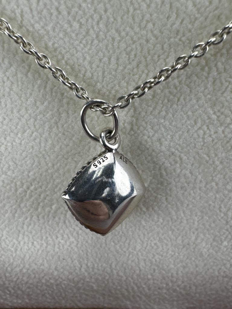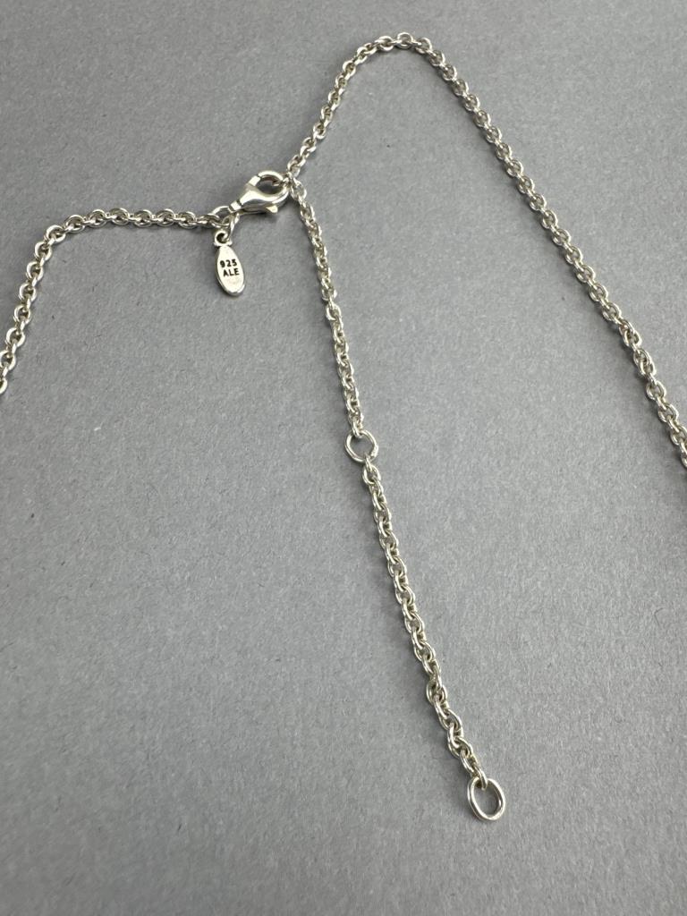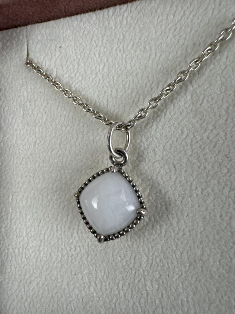 Retired 20 + 3 inch sterling silver cable necklace with white quartzite dangle pendant. Marked 925 ALE and weighs approx. 10.4 grams in Pandora box.
