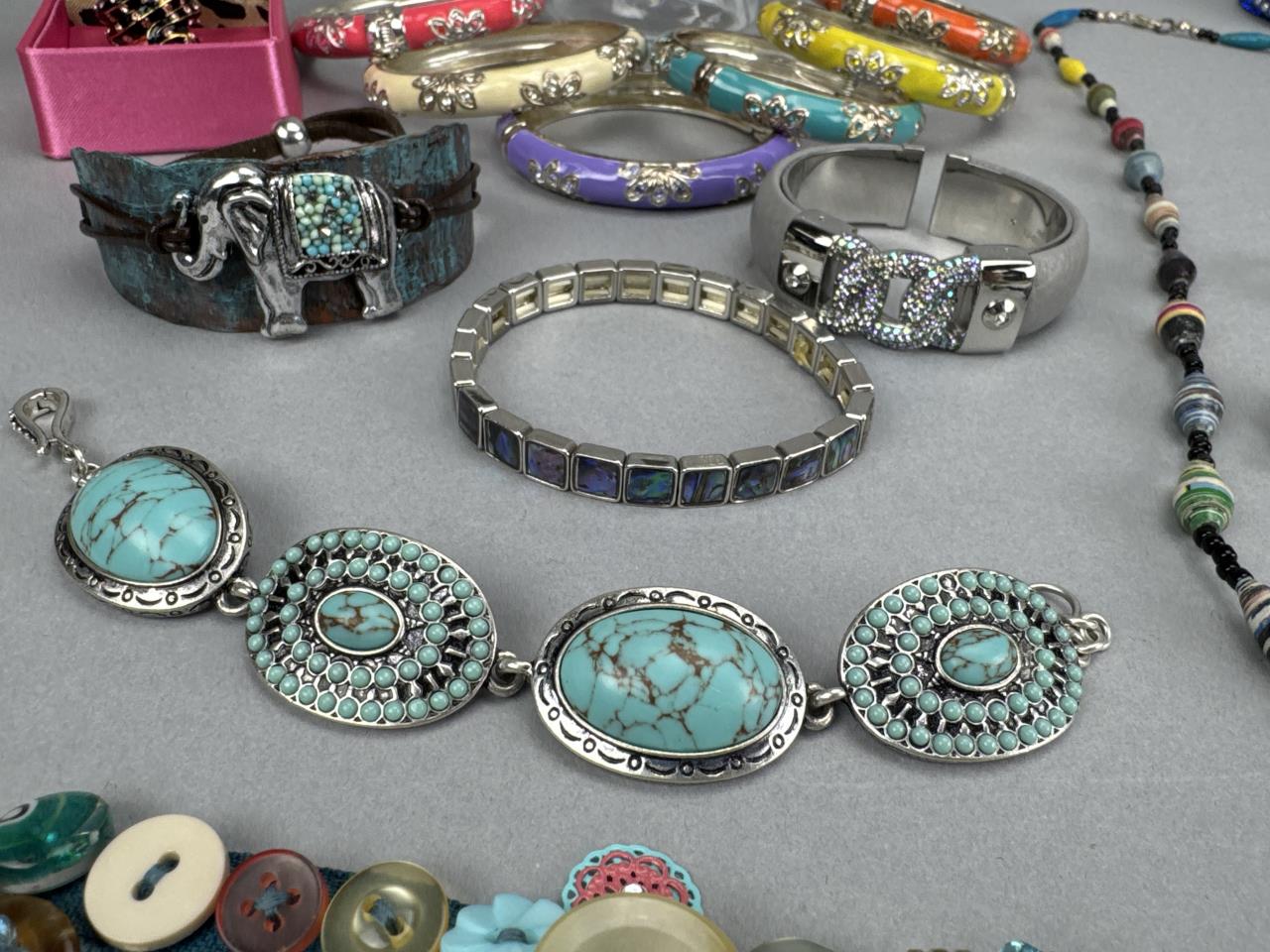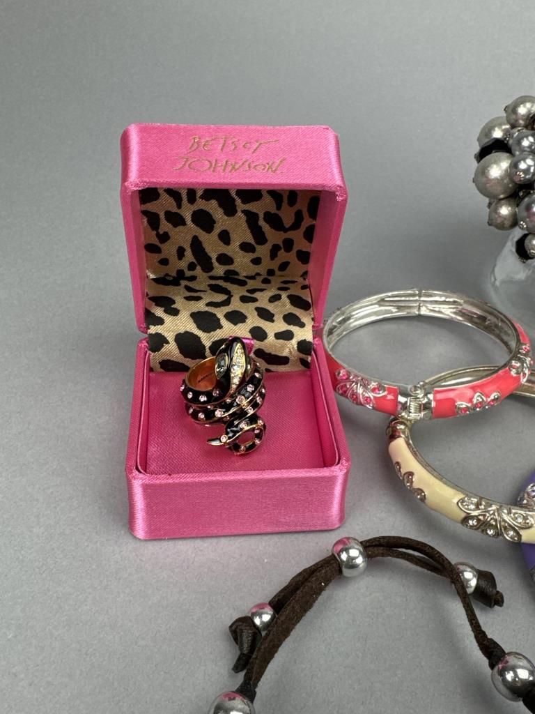 Betsey Johnson snake ring size 7 in box, Bath & Body Works ‘lips’ rhinestone ring size 7, turquoise like ring size 5 1/4, turquoise like earrings w/ posts marked CHICO’S, 13 bracelets (7 inches), and 5 necklaces (from adjustable choker to 64 inches)