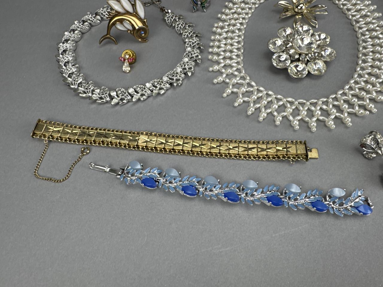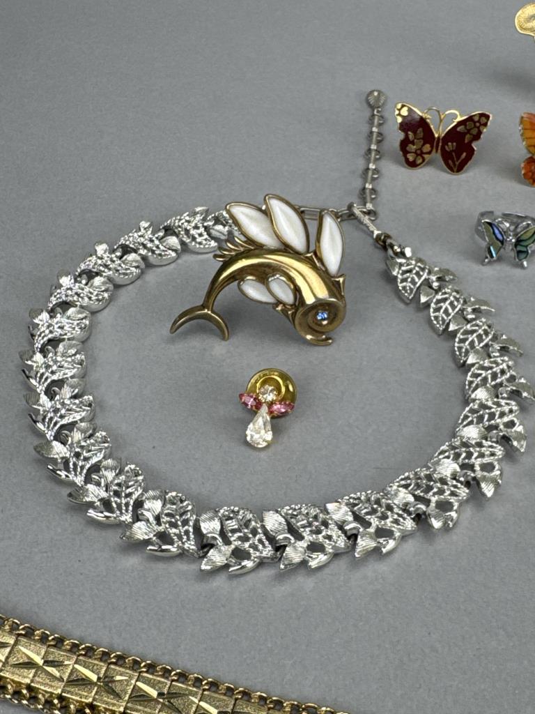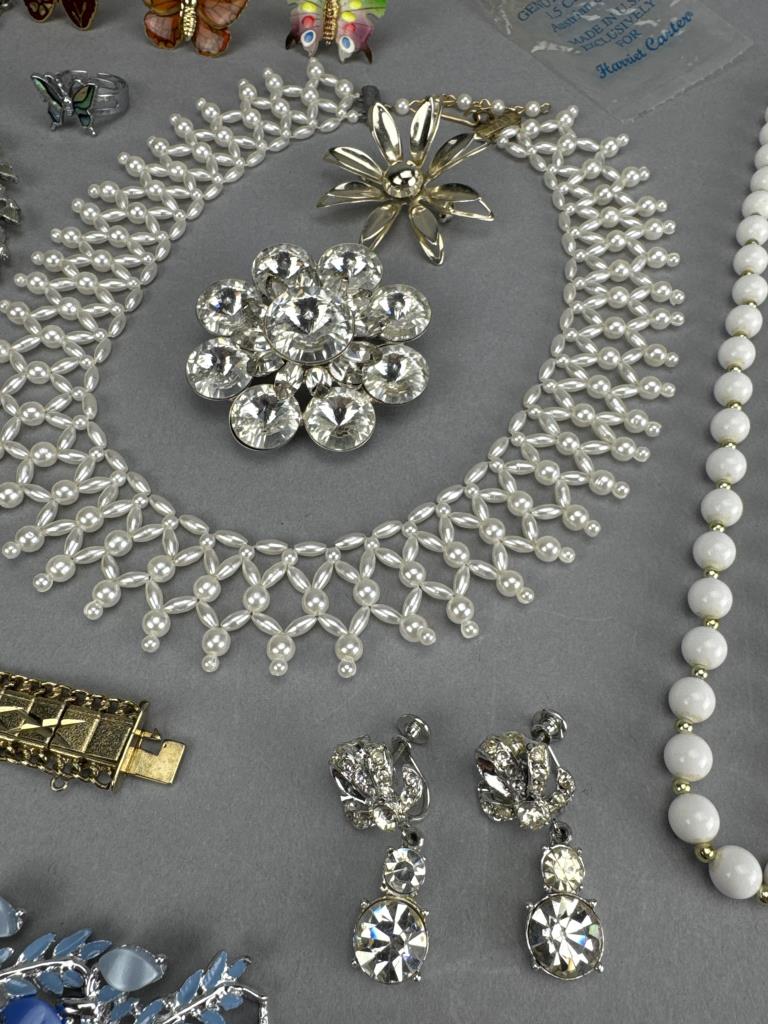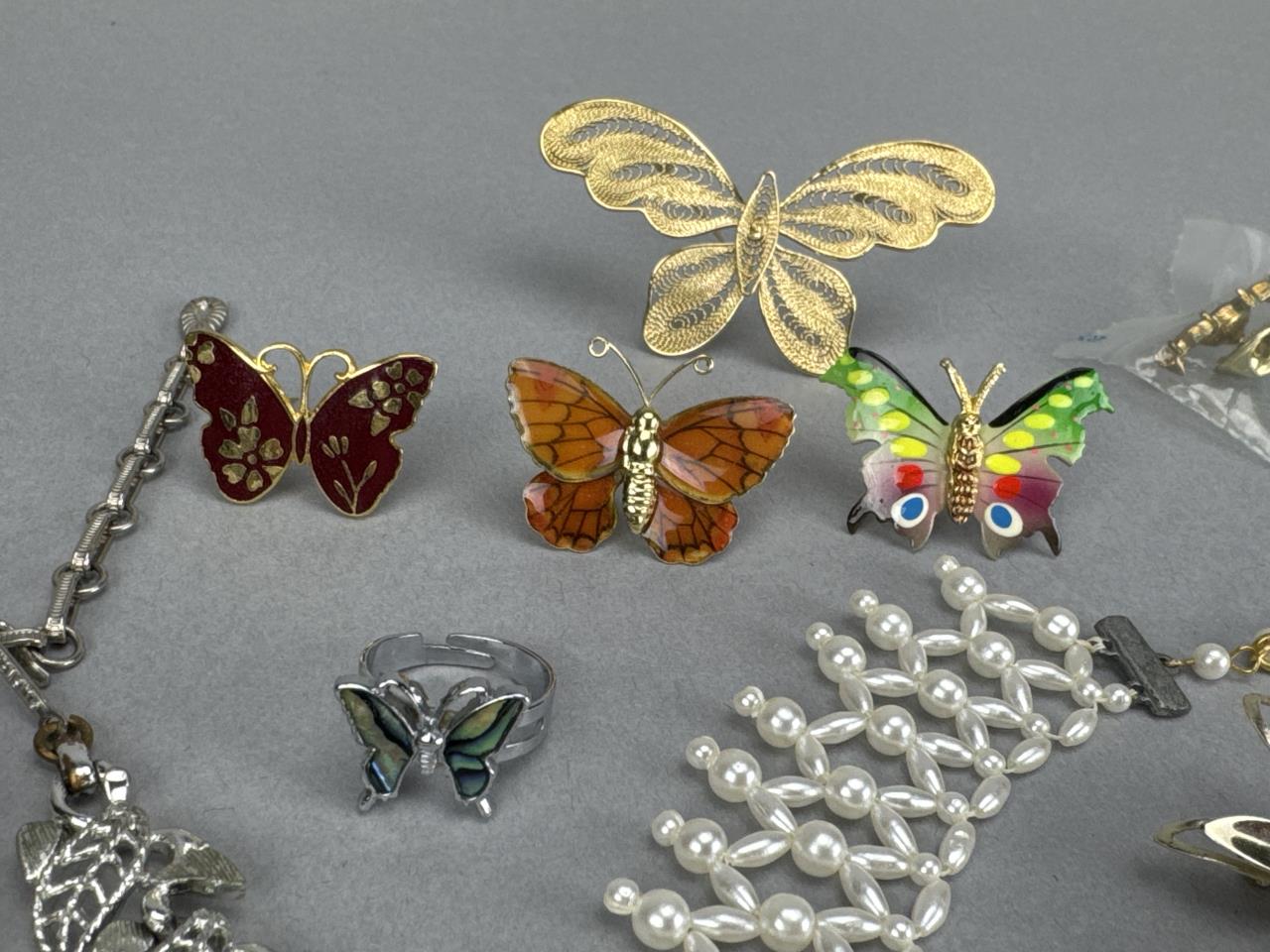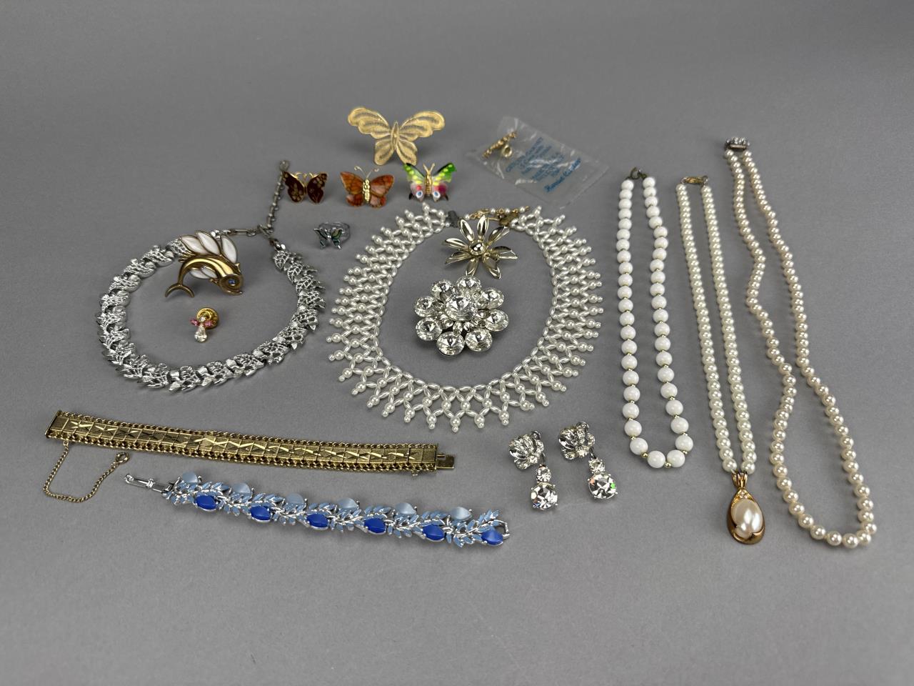 Shortest necklace is 14 inches + 3, and the longest is 24 inches. Brooches include butterflies, poured glass flying fish, flower, angel, garnet w/ Austrian Crystals, and circular rhinestone. Rhinestone screw clip dangle earrings. Adjustable butterfly ring. 2 bracelets.