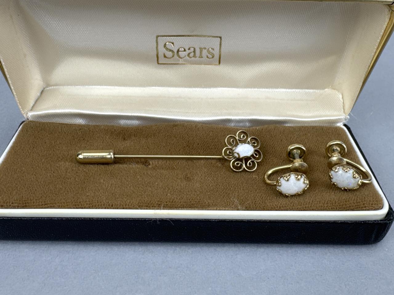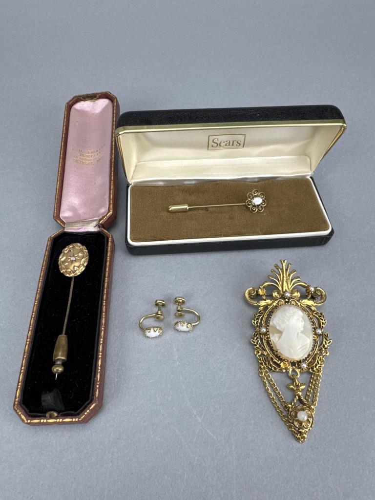 Diamond Stick Pin, Cameo Brooch, 12K GF Earrings